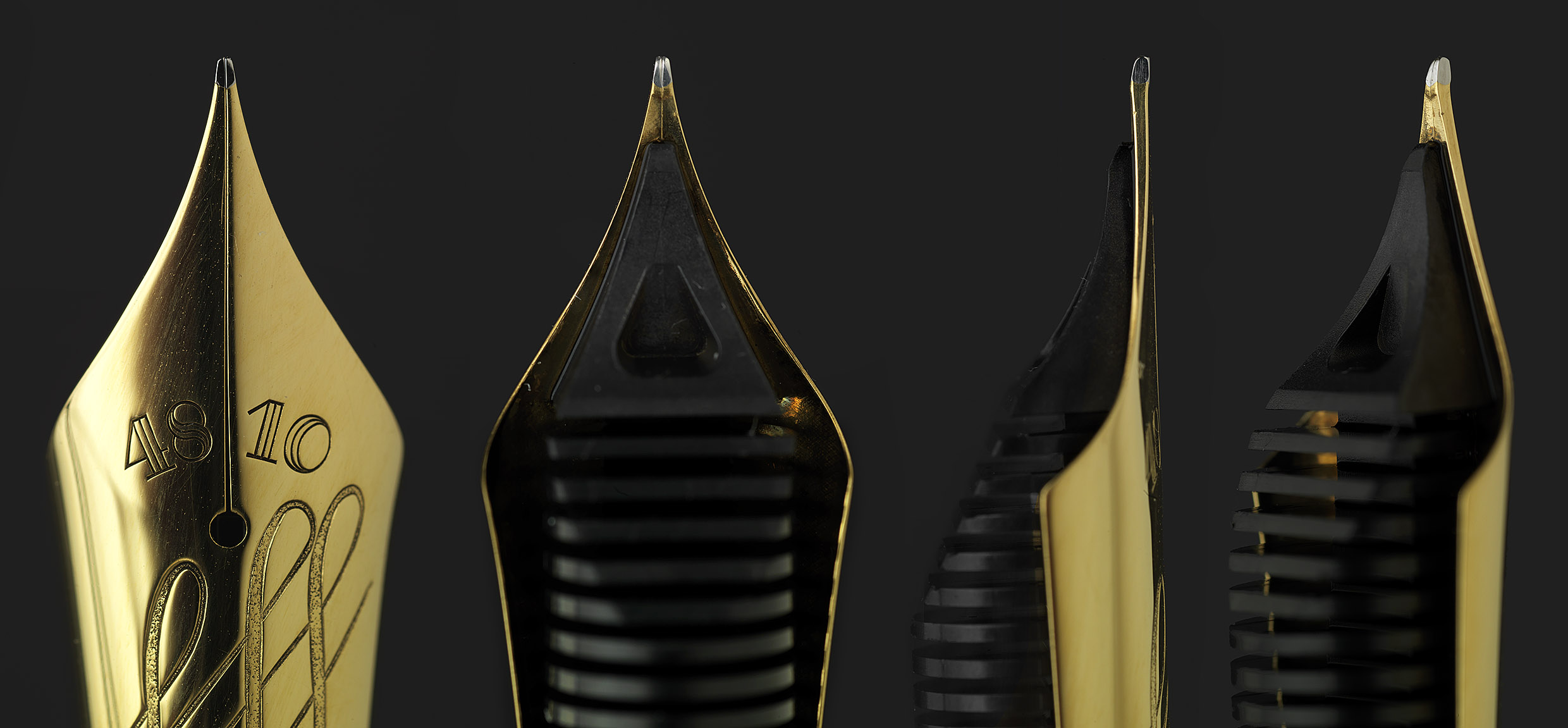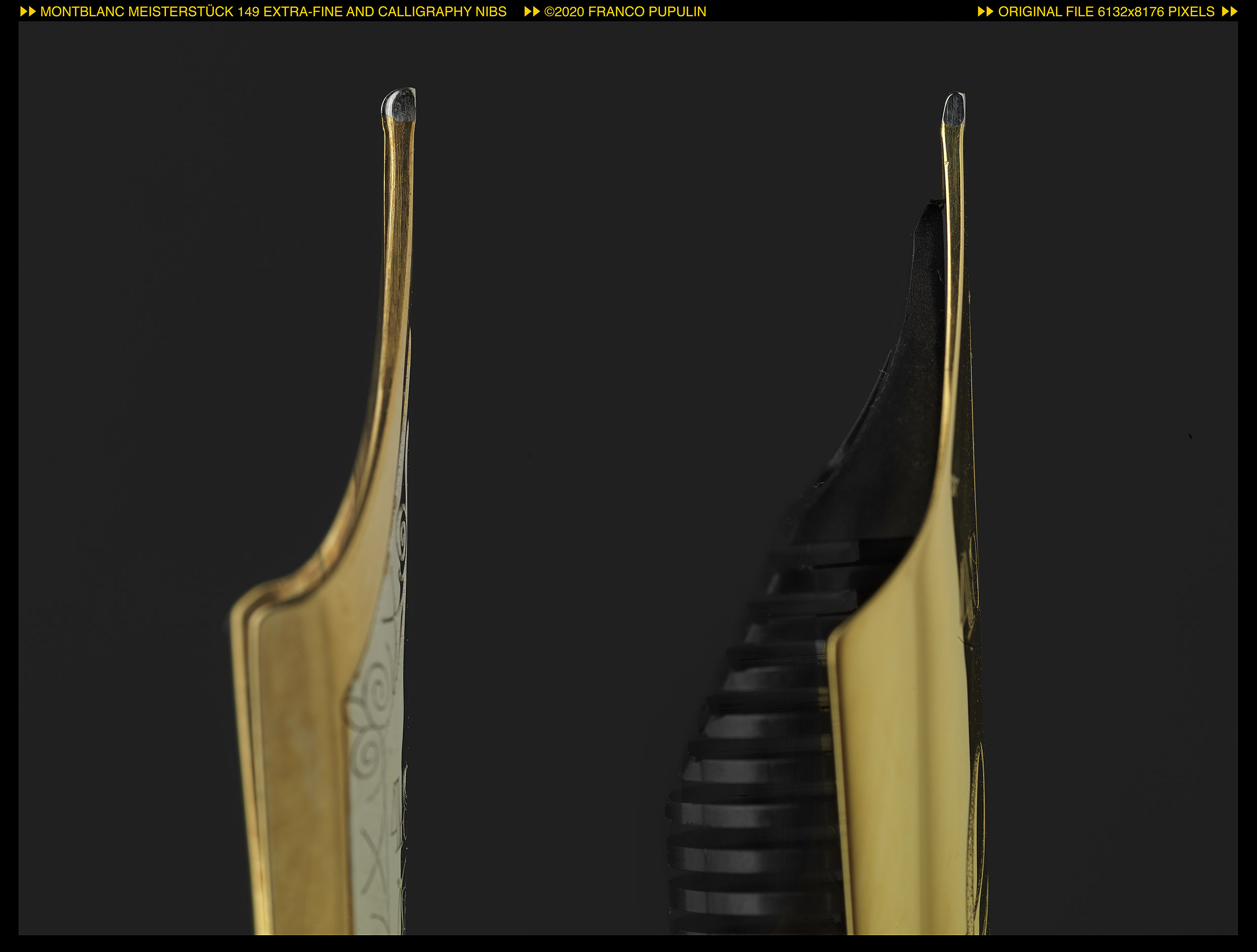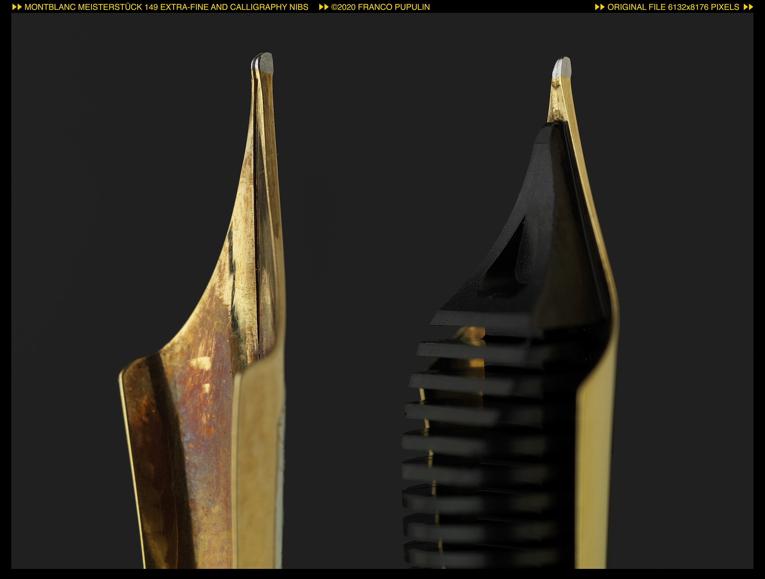 Messi l'uno accanto all'altro, é interessante vedere come non solo i puntali, ma anche la geometria generale dei pennini siano completamente diversi. Le "ali" larghe del Calligraphy ricordano i pennini delle 149 degli anni '50 e '60, che proprio per le ali dei rebbi ampie e fortemente ricurve presentavano una decisa flessibilità. Il pennino della Calligraphy si ispira ovviamente a quel disegno.