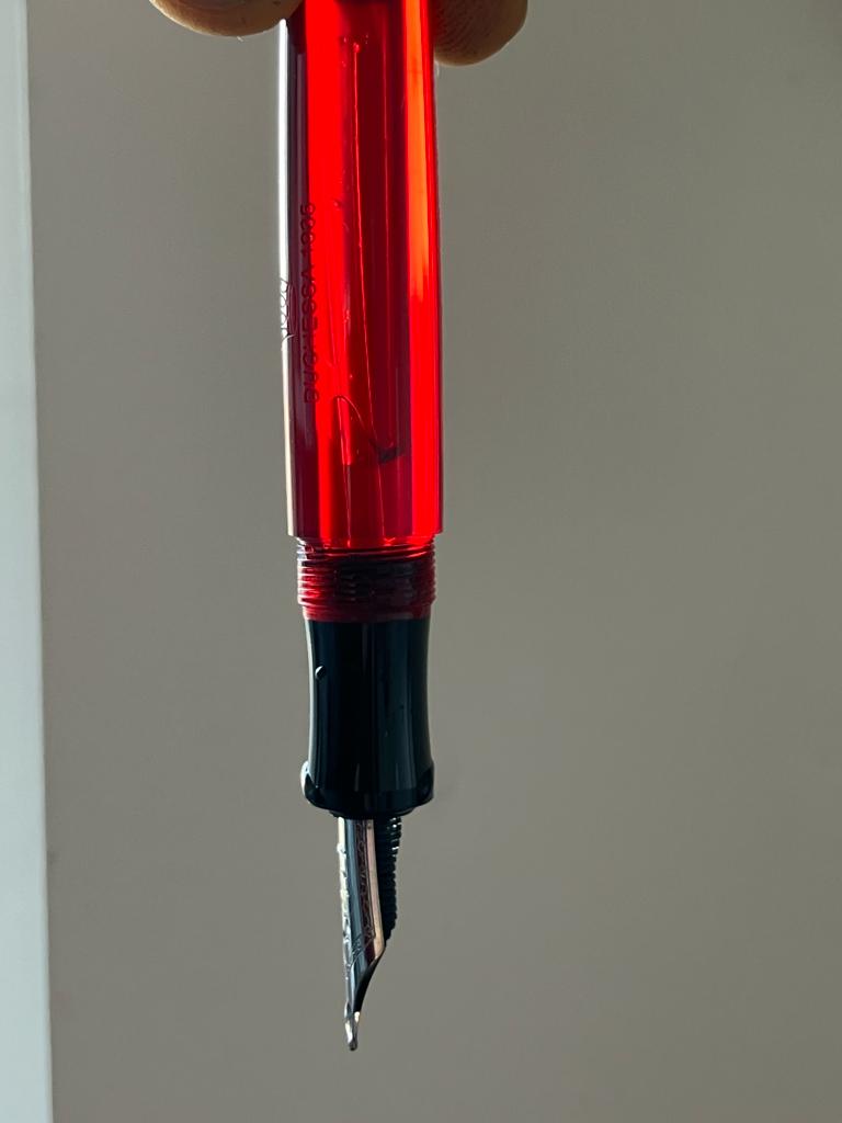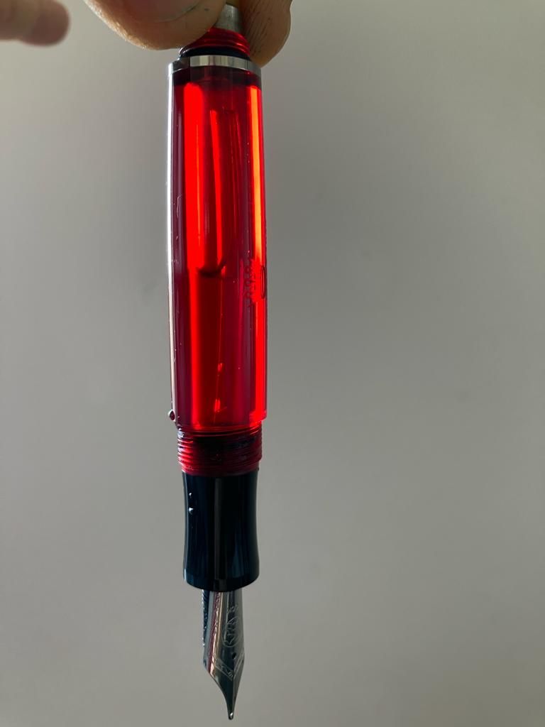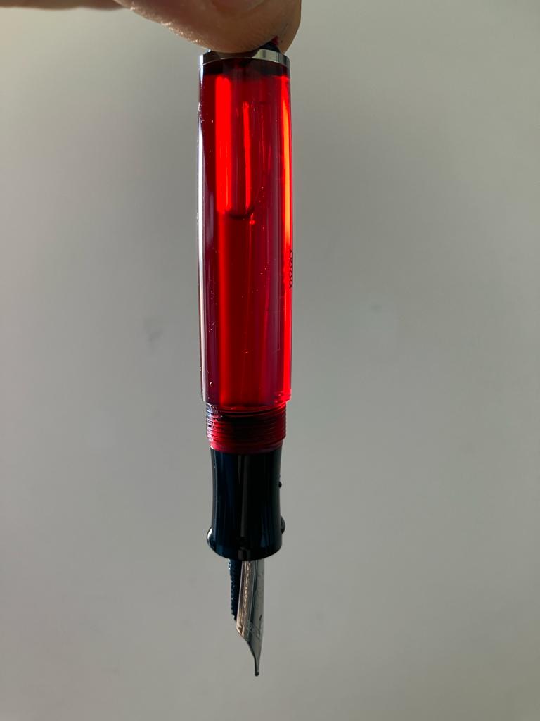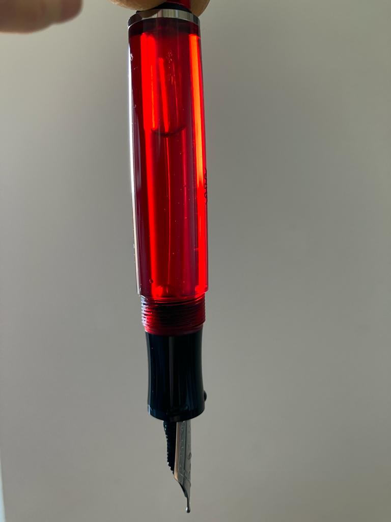 Questo è probabilmente il caricamento massimo in questa conformazione (vuotato il contenuto e raccolto con una siringa si misura 0,8 ml), mi sento di dire, perlomeno a quelli che sono già passati alla sostituzione del collare, alimentatore e pennino, che piuttosto che usarla in eyedropper questa modifica non complessa (tubicino in silicone diametro interno 2mm sul peduncolo del collare facilmente reperibile, e forellino da 1mm nel fondo del collare) permette il funzionamento e riempimento a sfiatatoio come previsto, salvo la possibilità di riempire completamente la penna (ma almeno per due terzi).