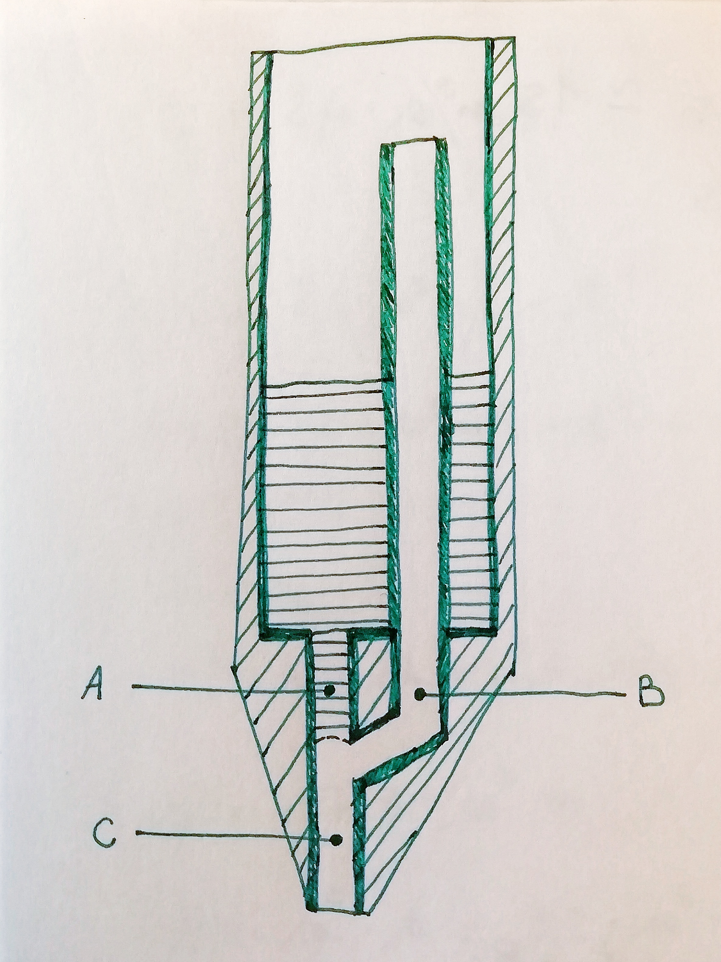 Il canale C è l'ultimo tratto: il fatto che passi inchiostro, aria o una miscela tra i due dipende, come detto, dalle pressioni dei canali A e B.
