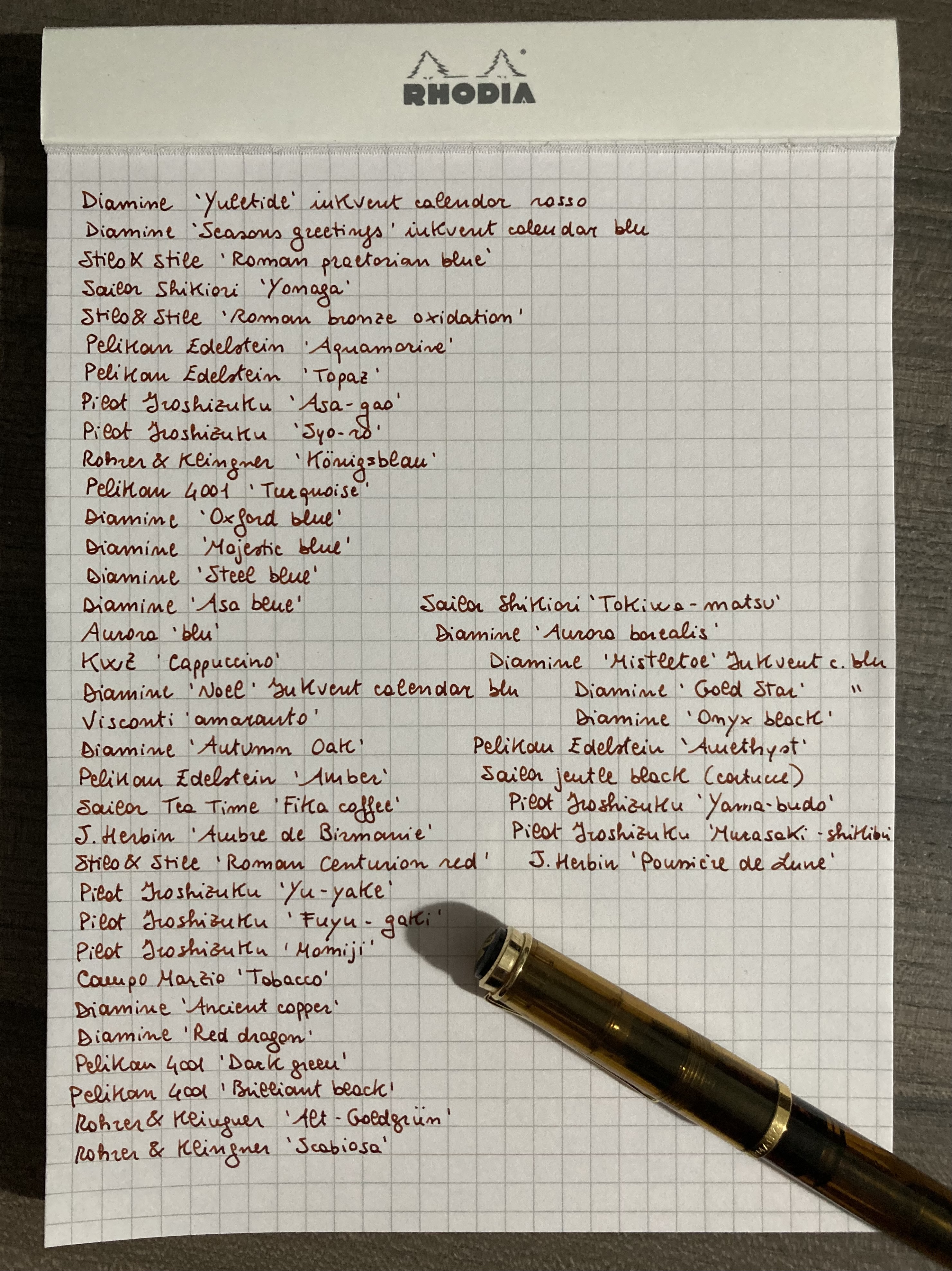 Con il caldo, l’unica cosa che mi riesce bene sono gli elenchi. Pelikan M200 ‘Cognac’ pennino EF e inchiostro Diamine ‘Ancient copper’ di oggi