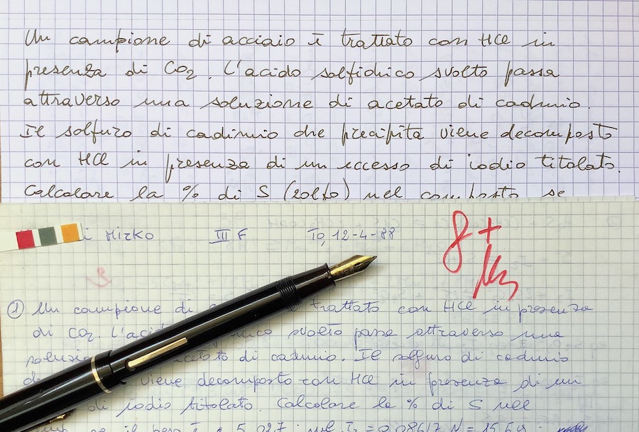 Ad essere sincero, per fare prima, ho utilizzato degli esercizi già svolti che ho trovato tra i miei vecchi libri e quaderni. Questo ad esempio era un compito in classe ; a ben vedere mi sorprendo come tutto sommato la mia grafia "di base" non sia cambiata nel corso degli anni.