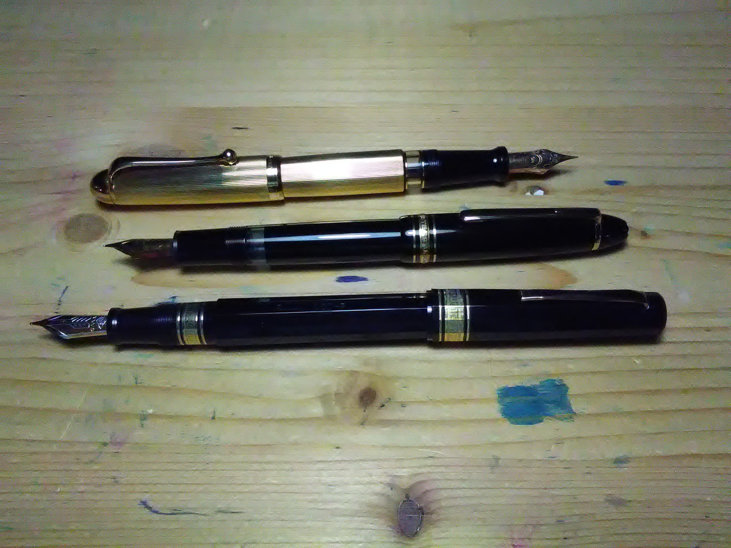 una 88 Big con punte lunghe, pennino senza sigla ma penso che si avvicini a un XF, una MB 146, pennino F e una Omas 557 F, pennino M, il cappuccio si avvita fino in fondo senza problemi.