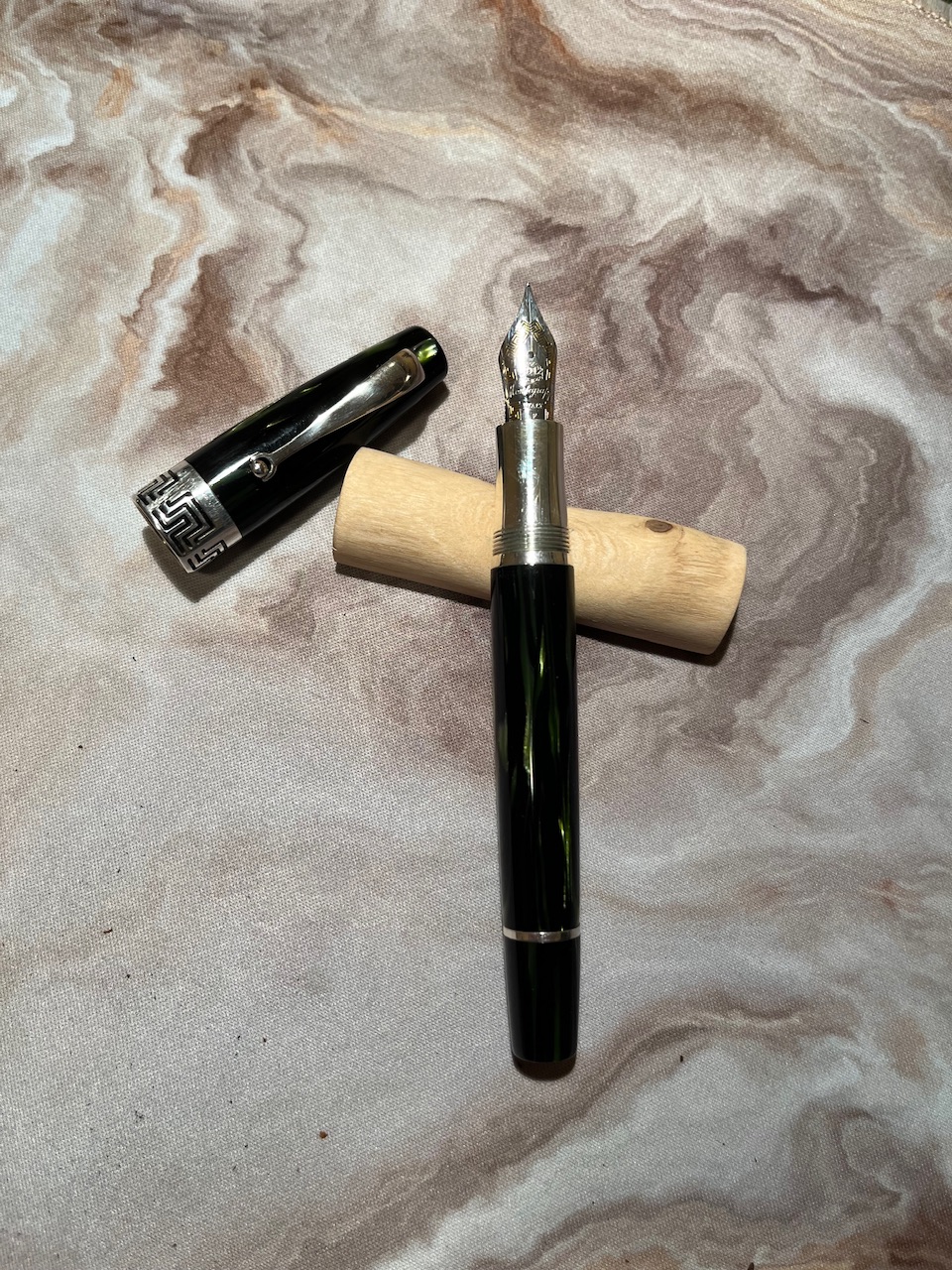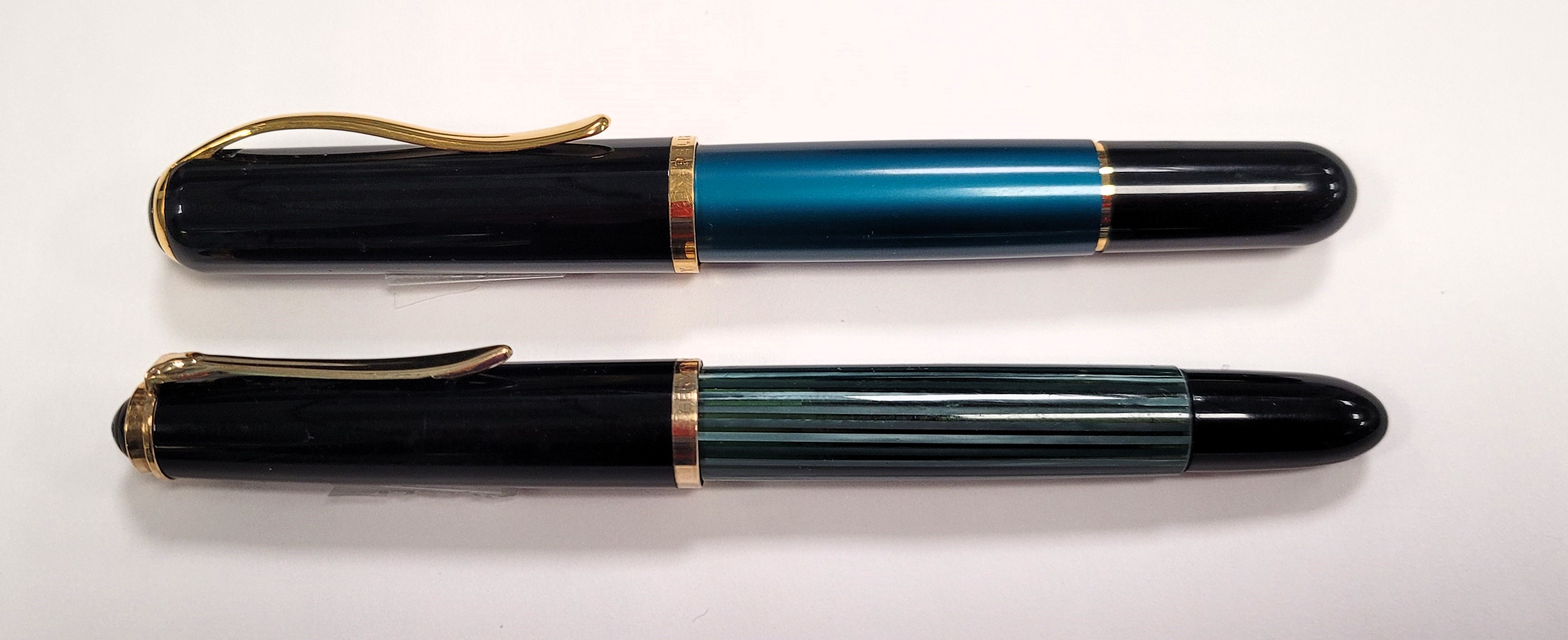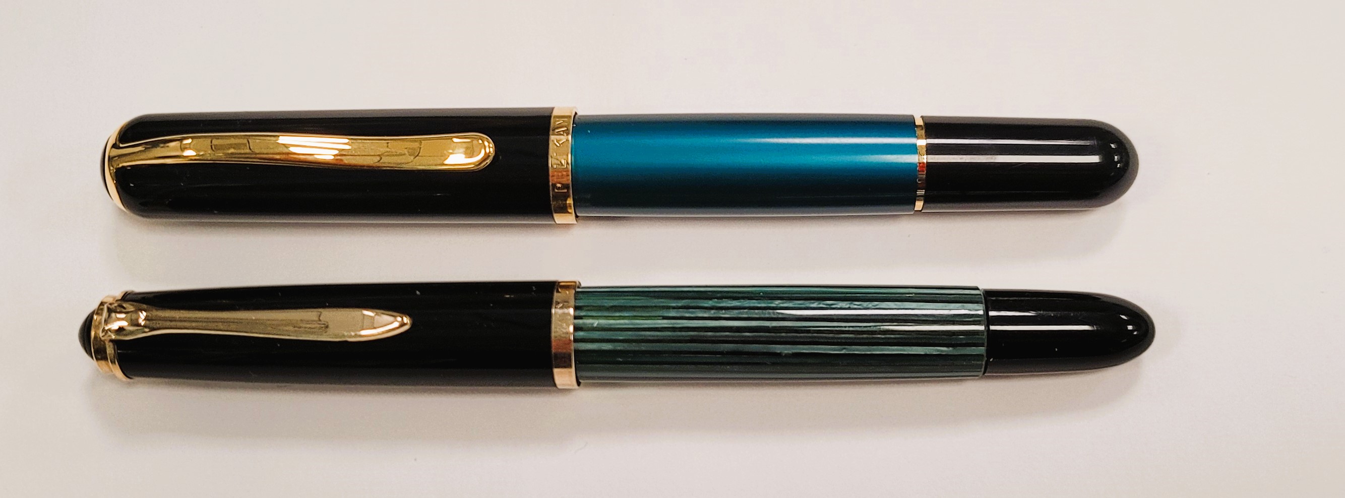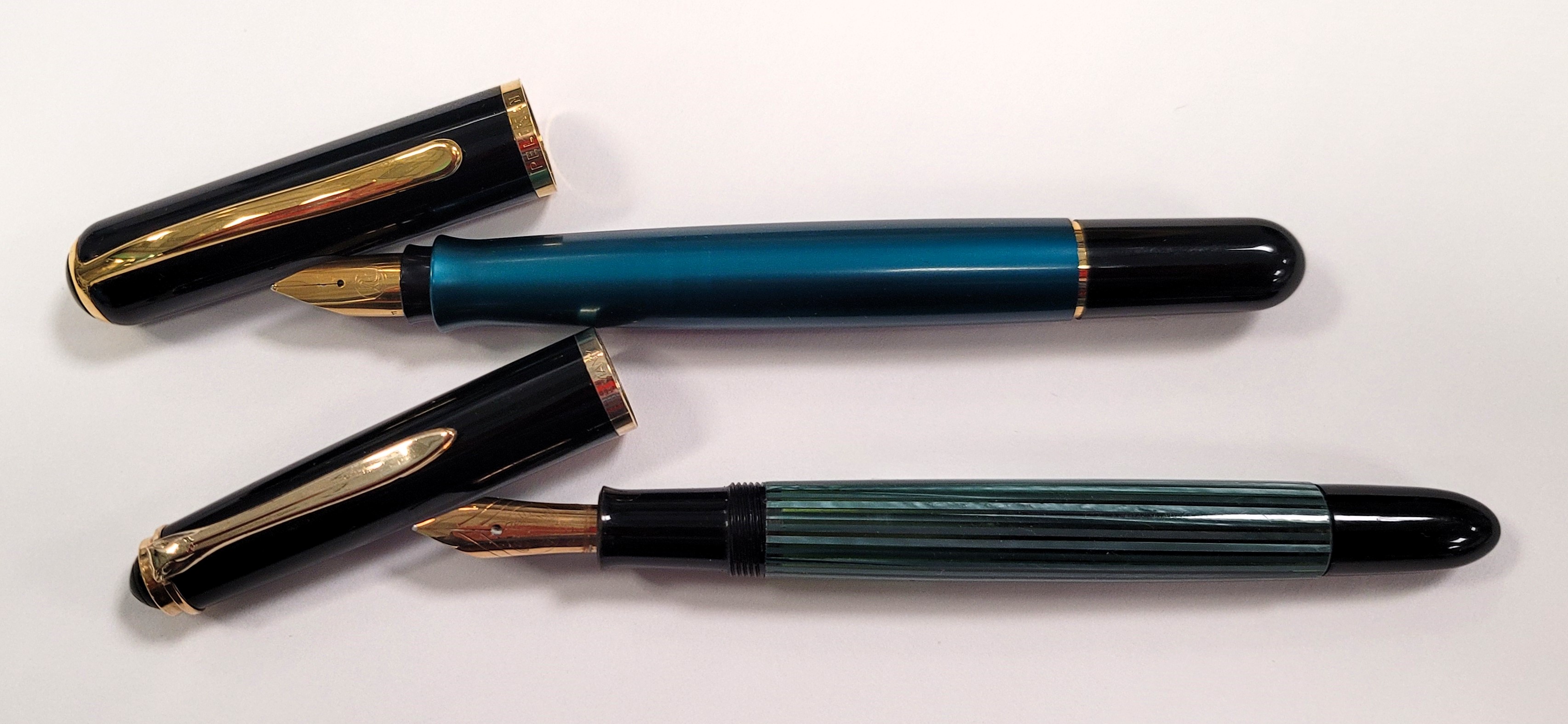 Qui il confronto diretto che sua nonna, un 400nn degli anni '50 '60 Dalle foto il fusto della Epoch sembra più sul blu, in realtà è un colore "complesso" dipendente dalla luce, a volte Blu tendente al Verde smeraldo a volte Verde tendente al Blu. La clip ha una forma ad onda molto carina e non ha i classici occhielli di Pelikan Particolare anche la sezione. Il pennino è placcato, in questo caso F A me piace molto