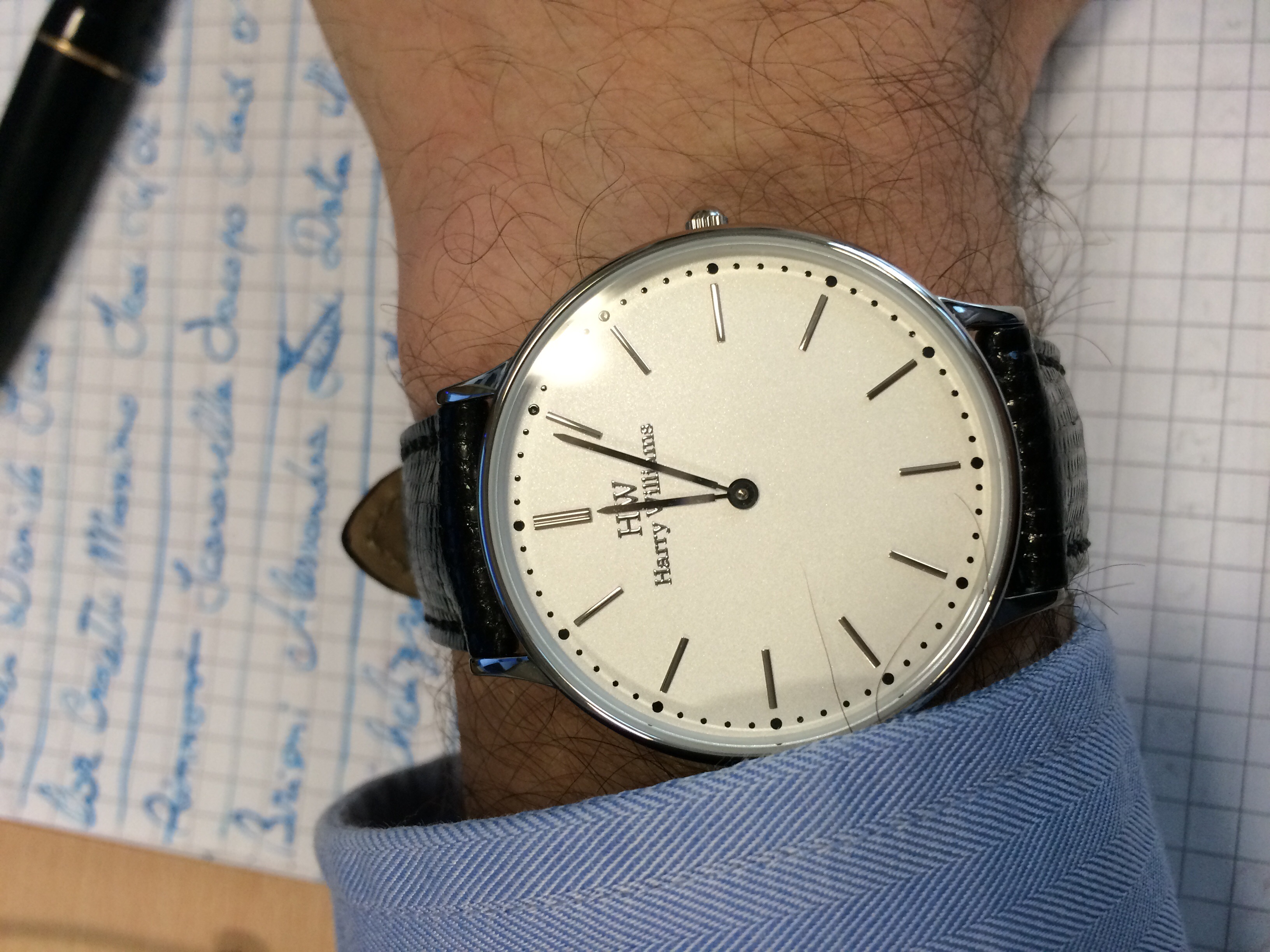 Ben fatto!La penso esattamente come te! La vetrina di quel negozio, infatti, l'avevo già guatdata senza trovare nulla che mi ispirasse; stamattina, complice la carenza di tempo, sono entrato ed ho pronunciato questa frase (conscio della sua pericolosità in un posto dove si vedono solo Rolex e orologi da tasca in oro e argento): "Buongiorno, io cerco un orologio con quadrante bianco, indici a bastoni o numeri romani, cinturino in pelle nera. Se quarzo, automatico od altro, non importa. Ah, diametro della cassa inferiore a 40mm.". Ora, sarà stata la marea di gente ancora presente nonostante mancassero 5' alla chiusura, sarà che mi sono 'presentato bene', sta di fatto che mi è stato mostrato quel quadrante e mi è stato detto "se le va bene, tenendo presente che ha un ottimo quarzo, le cambiamo il cinturino". Dopodiché è iniziata la scelta del cinturino, con l'unica richiesta di evitare il coccodrillo (per questioni 'morali' dovute ad un video in cui si mostrava il metodo di uccisione per farne, appunto, cinturini da orologi, borse ed altri oggetti per il 'mercato del lusso'); alla fine per finitura - ovvero ardiglione color acciaio - e misura, sono andato sulla lucertola Tejus e dubito che queste bestiole vengano trattate meglio dei 'cugini'...