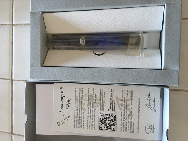 Penna 074 arrivata con il corriere DHL come avvisato. Busta protettiva di plastica gialla e rossa classica e pluriball di protezione intorno alla scatola di cartone. Sono d'accordo con il Boss che era inutile investire sul guscio (nonostante io collezioni ogni cosa): non è quello l'oggetto del desiderio! Stranamente gli inviti per l'apertura sono a metà dei lati corti, troppo lontani per aprire la scatola con una sola presa. All'interno c'è un cartoncino a ponte di presentazione, busta trasparente con chiave di apertura ramata (sopra lucida e incisa con i loghi di Fp.it e Reiki ma sotto piena di impronte che non se ne vanno, uffa) e un gommino di scorta (ma non dovevano essere due? Vedi presentazione ufficiale). Segue cartoncino con la filosofia che ha ispirato e guidato la realizzazione della nostra stilo con tanto di QR code per l'accesso ai video di Daniele caricati sul suo canale Youtube; firma sua e dell'artigiano (M.C.?). Sotto, finalmente, la Reiki in una bustina di plastica anti-polvere. Dopo la guarderò per bene, dai, devo aspettare solo pochi minuti.