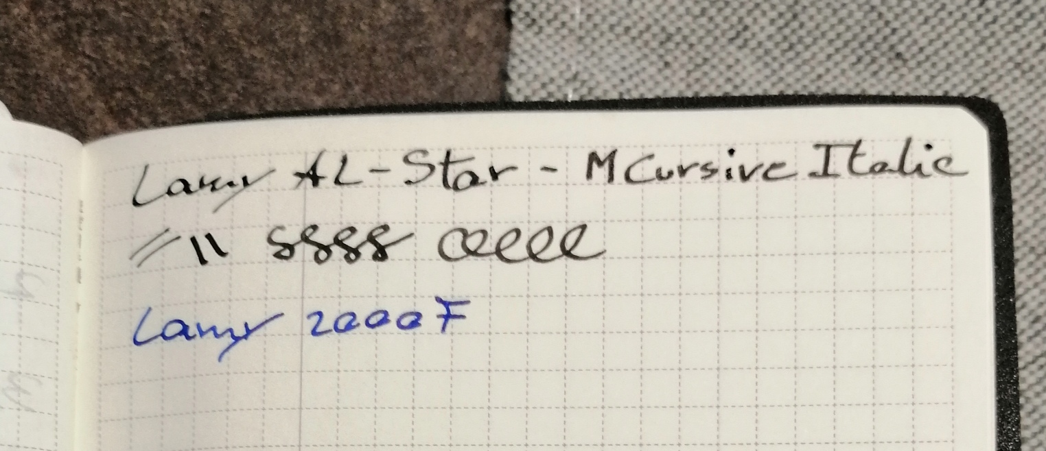 La mia esperienza con le lamy è per lo più positiva. Anche se recentemente ho beccato un paio di pennini M sgradevoli da usare, e non per disallineamento dei rebbi ma per problemi costruttivi. Uno aveva addirittura la pallina di iridio leggermente più lunga su uno dei 2 rebbi. Ho colto l'occasione per trasformarlo in corsivo italico con buoni risultati. L'operazione è abbastanza semplice e ora il pennino è ottimo da usare e dà una buona variazione di tratto piacevole da vedersi. Mi scuso per la scrittura. Ho aggiunto una scritta con lamy 2000 f per confronto.