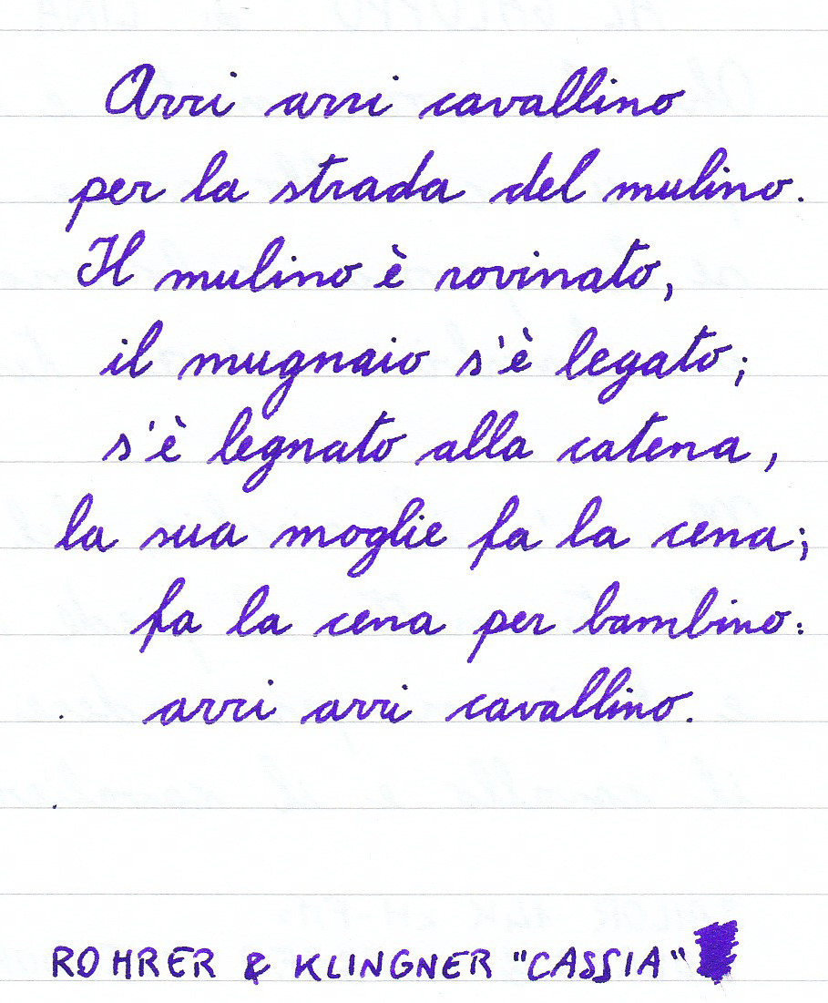 Questo è Kaweco Sommerlila in una Faber-Castell Loom M, su carta Fabriano EcoQua. Davvero uno splendido viola. Sono molto grata a uno dei miei corrispondenti per avermene regalato una cartuccia. La boccetta è nella mia lista degli inchiostri desiderati.