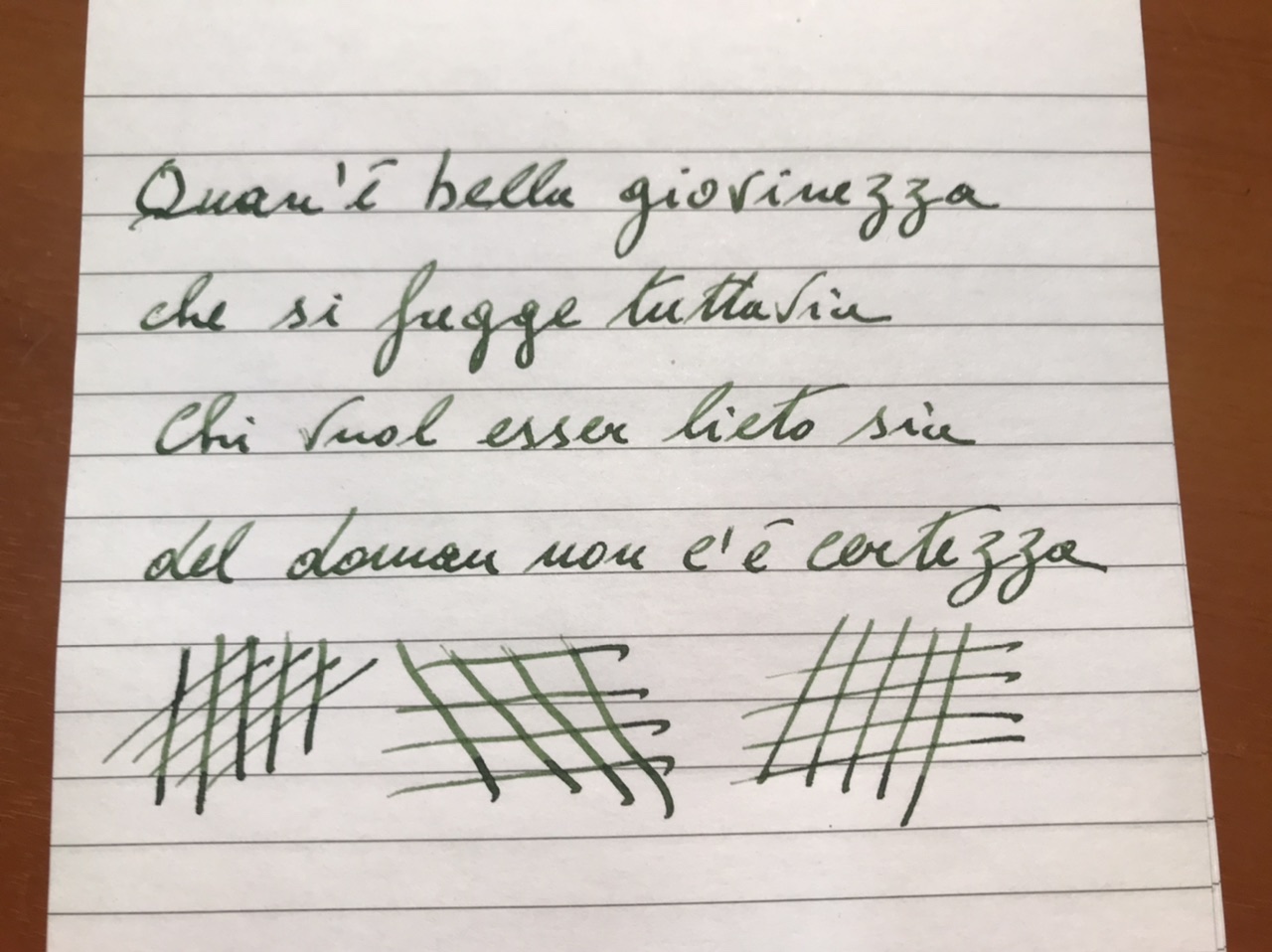 Io la prova la metto perché l’hai chiesta ma con lo stub non sono proprio capace! Comunque è molto morbido ed anche flessibile, in questa prova però non ho fatto pressione. Forse ho sbagliato inchiostro perché tunnpo troppo liquido è un Robert Oster eucalyptus lega.