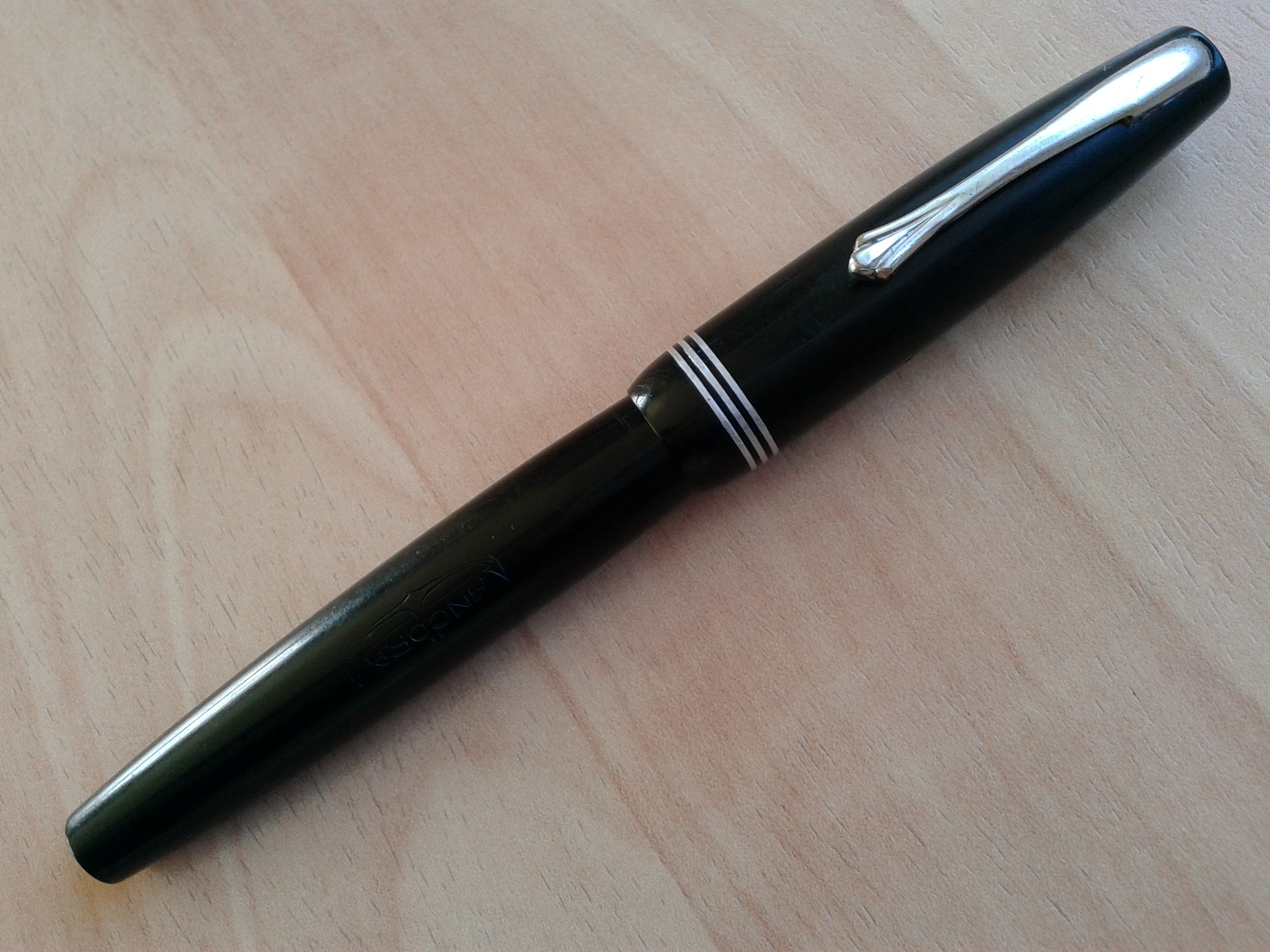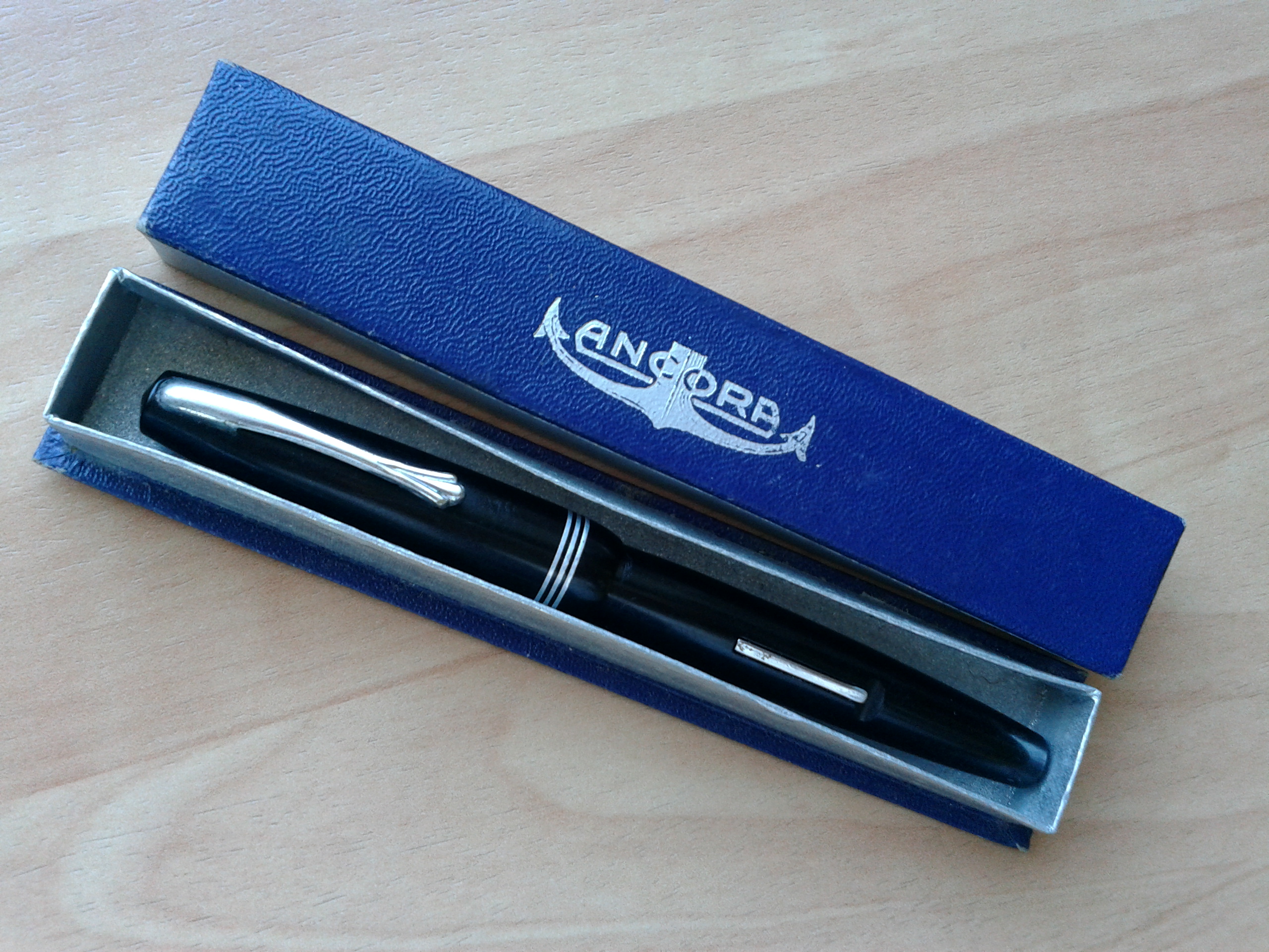Dopo aver atteso invano per oltre un anno di imbattermi in un pennino Ancora in acciaio (commercialmente chiamato "Zanio"), ho deciso di presentare comunque la penna con un ritrovamento della scorsa settimana, poichè le probabilità di trovare un pennino corretto in condizioni decenti sono assai scarse, e il premio del ritrovamento, forse, potrebbe non essere la qualità di scrittura. Aspetterò ancòra