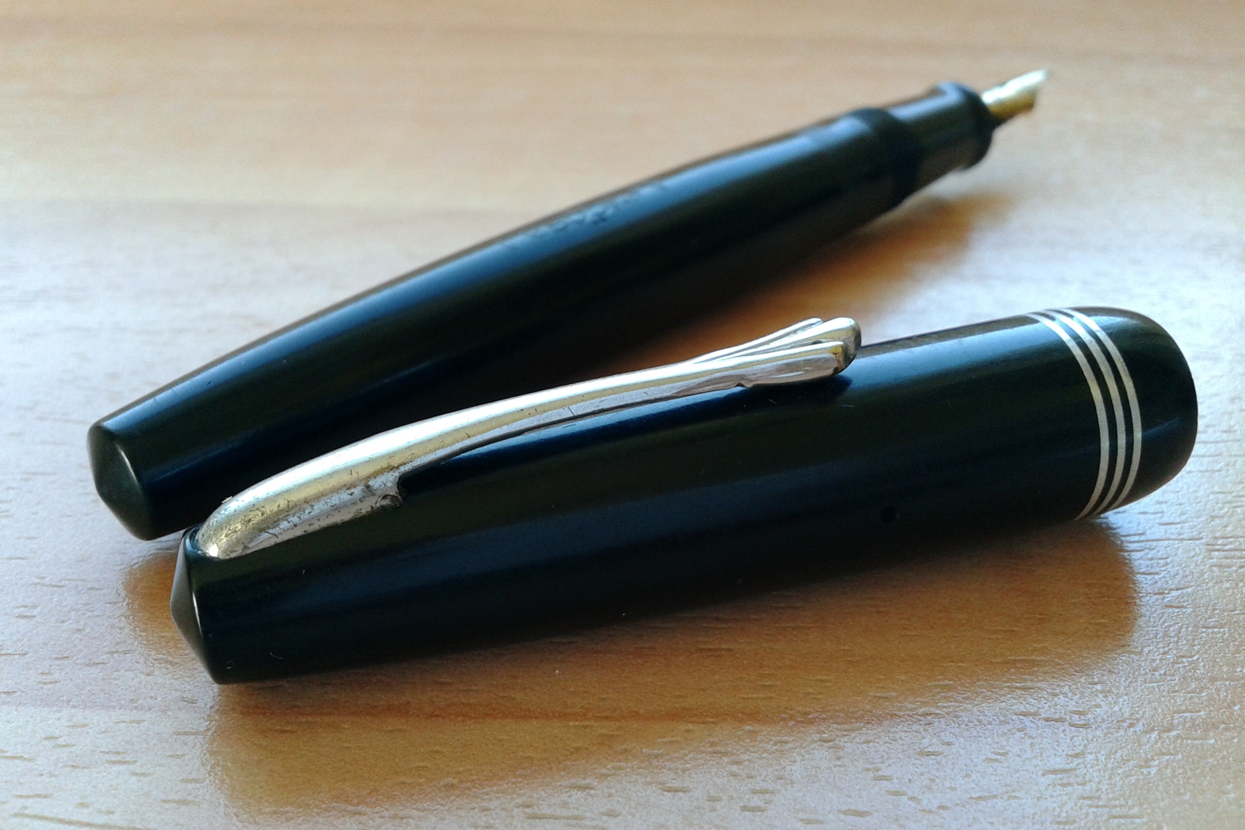 Le parti metalliche, che ora appaiono di metallo bianco, potrebbero essere state dorate in origine: la clip (dove si nota un residuo di doratura) e gli anellini (che parrebbero addirittura in alluminio) sul cappuccio quindi, oltre a pennino e levetta di caricamento, potrebbero avere ricevuto una placcatura talmente leggera da essere repentinamente svanita per semplice strofinamento...