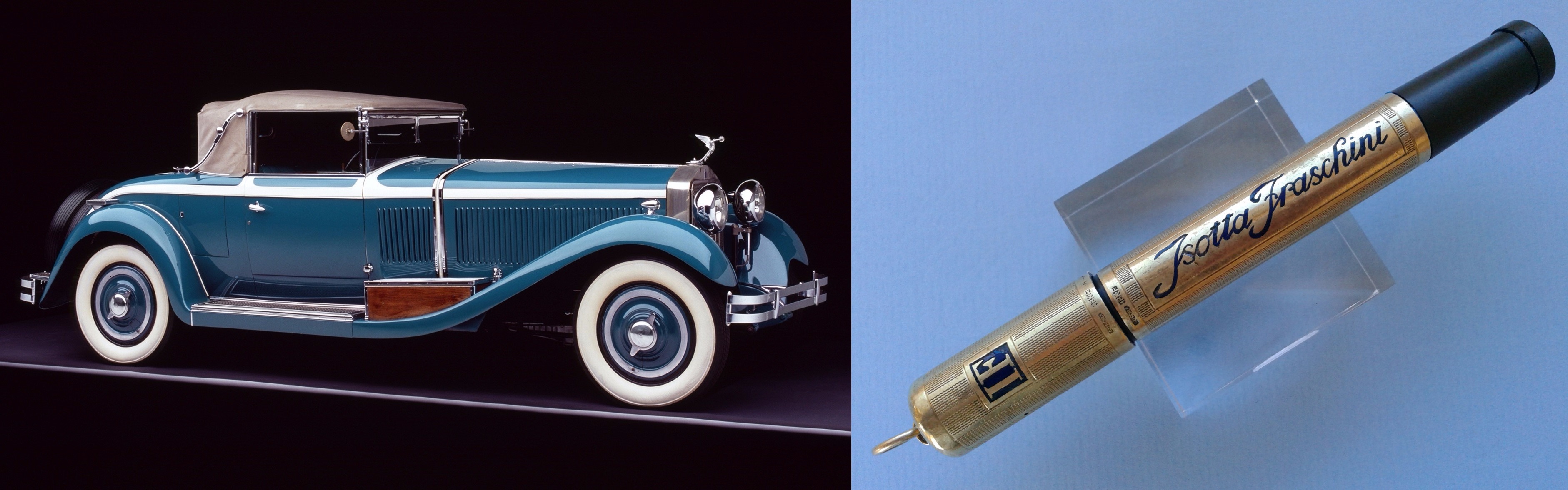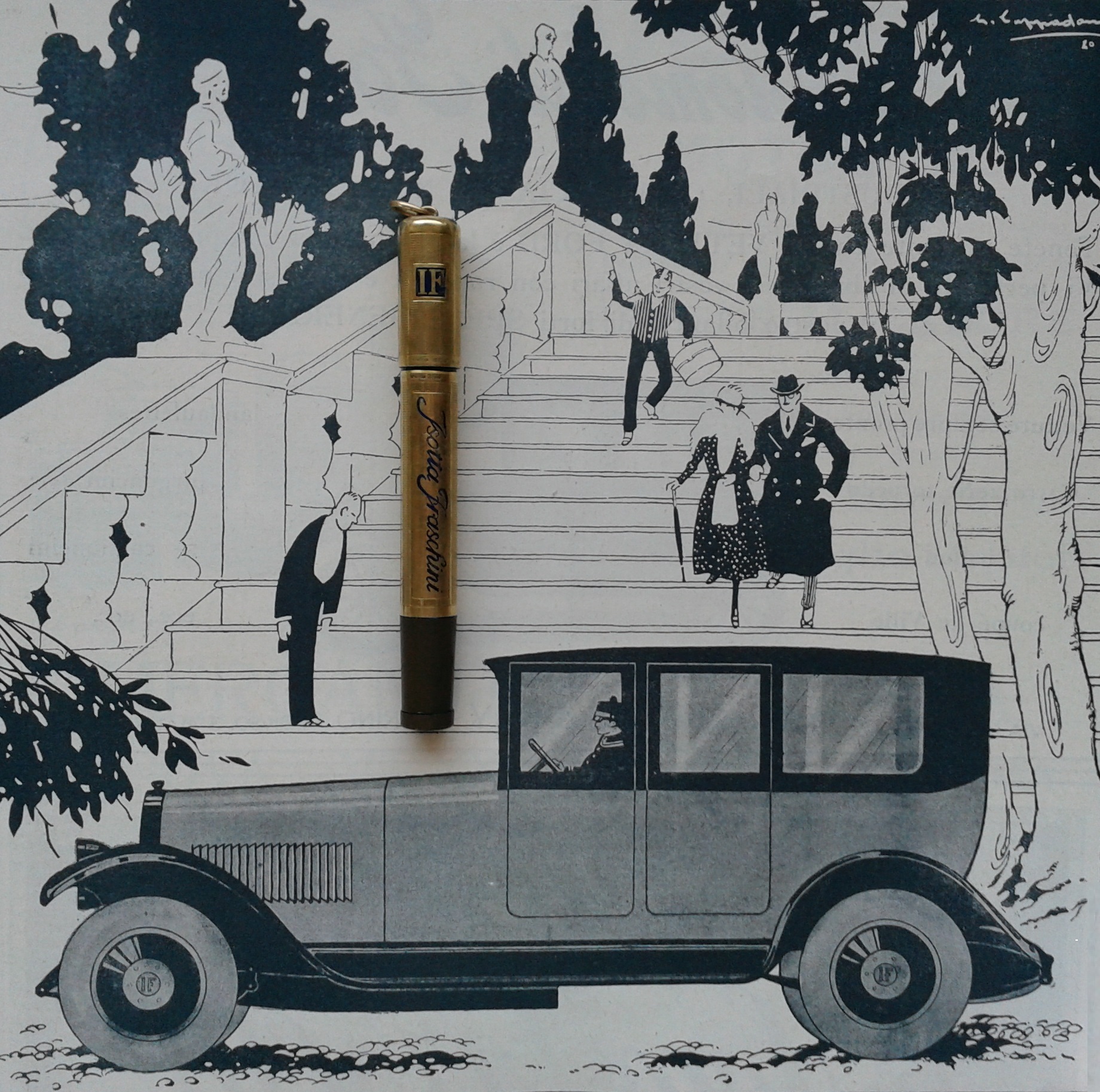 Nulla di quanto vediamo nel volantino, tuttavia, si avvicina alla complessità di lavorazione evidentemente richiesta dall'incisione della scritta in corsivo, con tratti fini e spessi da realizzare in smalto, della ragione sociale di "Isotta Fraschini",