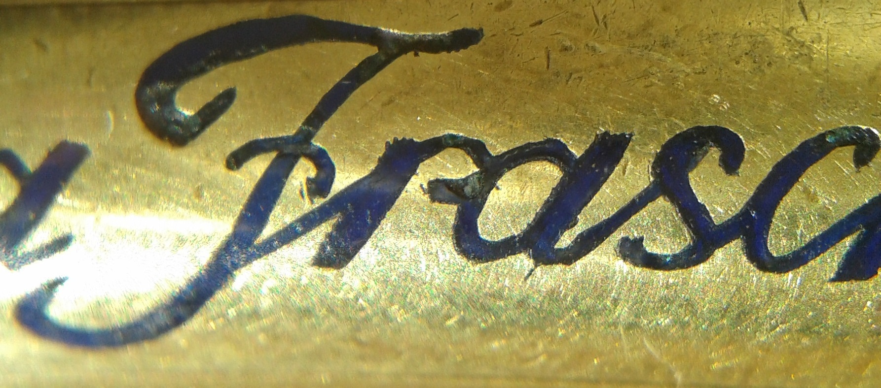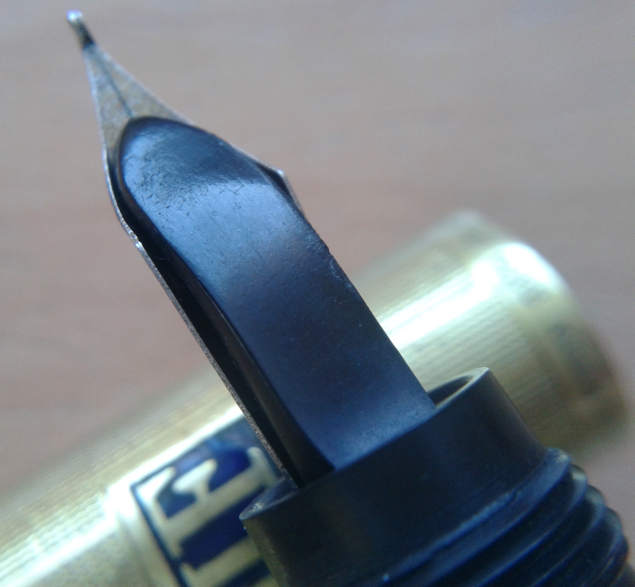 Dovremo (solo per il momento, perchè non è troppo difficile trovarlo) rinunciare a mostrare l'iscrizione del pennino originale, mancante. Secondo il nostro Wiki deve essere punzonato oro 14k, avere foro di areazione circolare, essere marchiato con il logo ovoidale dell'azienda contenente la scritta "Aurora Torino" ed il numero relativo alla misura: nel caso di una RA2 dovrebbe ovviamente essere il #2, ma anche il # 2 e 1/2 è a volte presente (terzo aiuto! ;) )