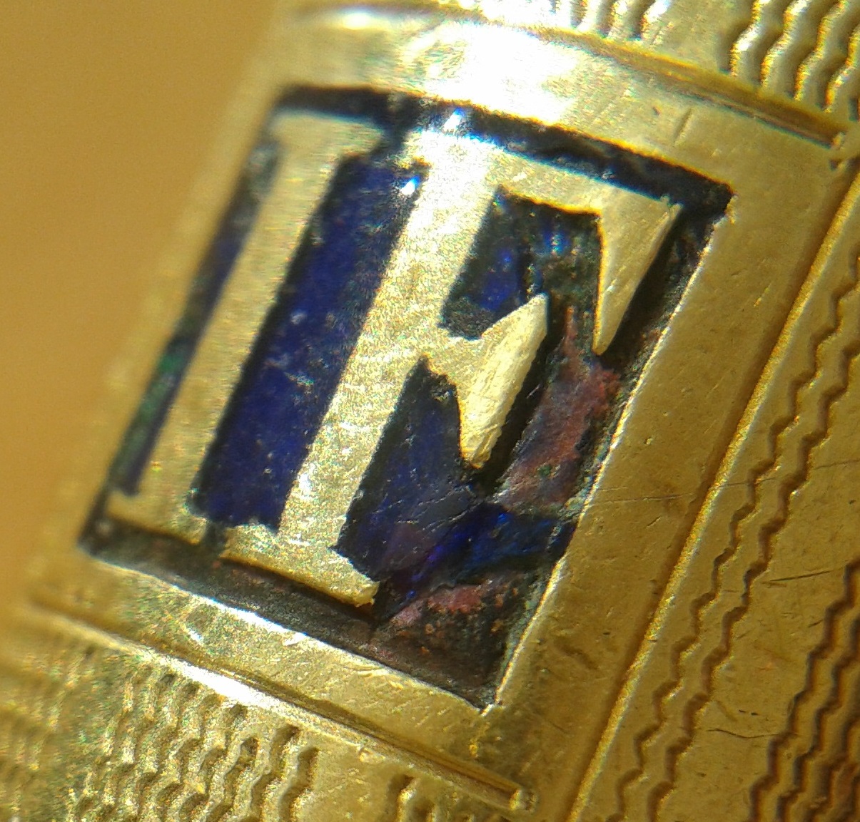 Come si può vedere, qui come in altri punti una porzione dello smalto è andata perduta, ma l'effetto generale della decorazione rimane comunque netto e vivido.