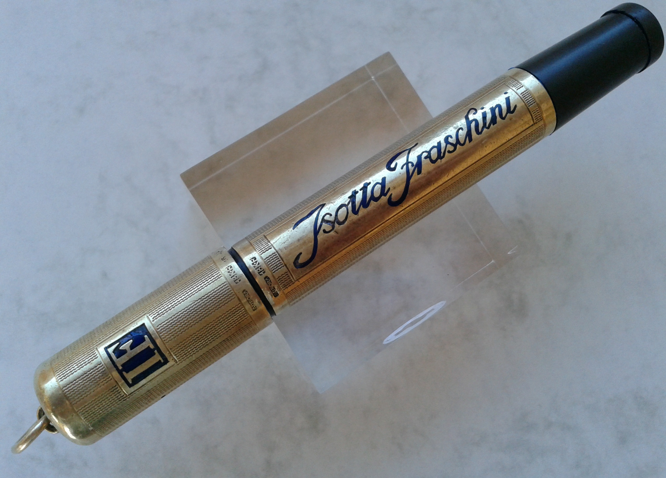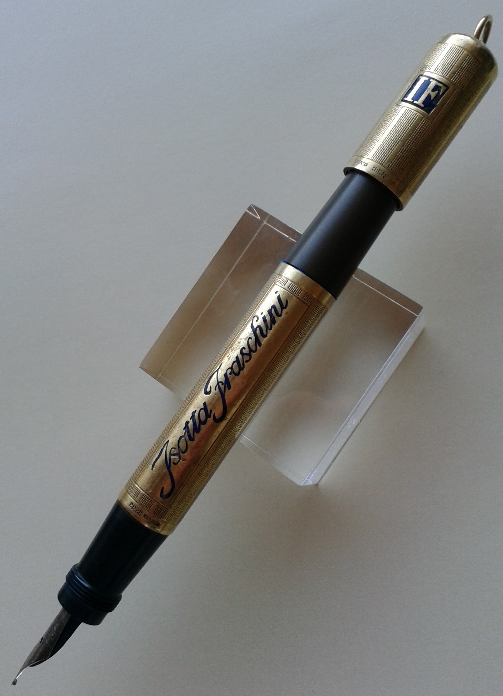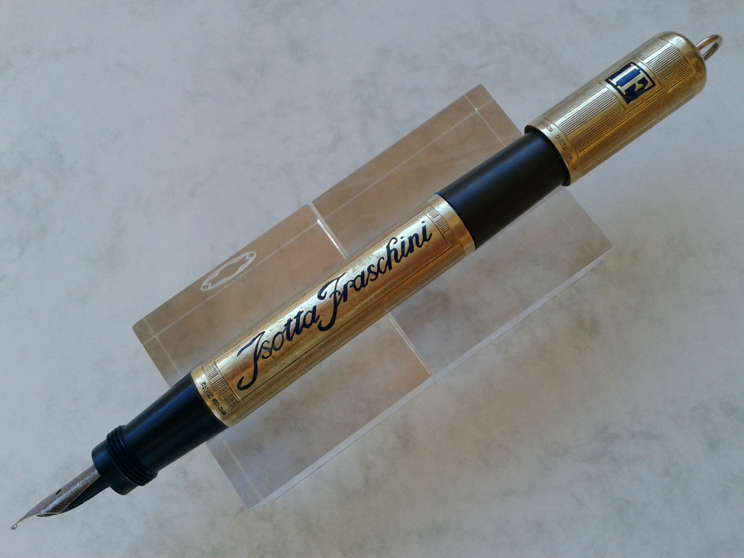 AURORA RA2 per ISOTTA FRASCHINI in ebanite nera, laminata in oro 18 K.R., decorata con smalti blu, caricamento safety, pennino non originale, produzione Italia seconda metà anni 1920.