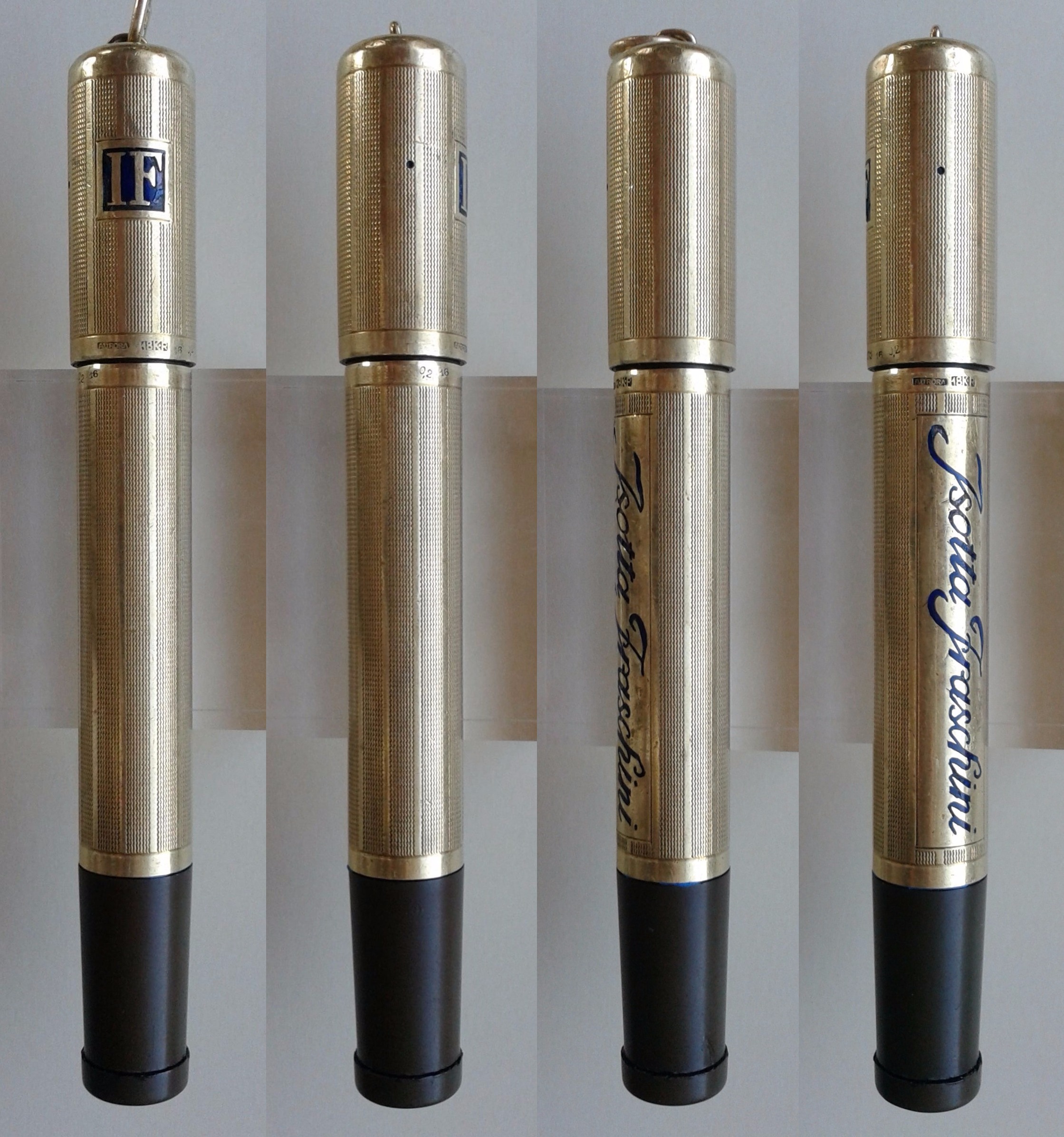 Come si può vedere, Aurora marchiava per il Committente o il cappuccio (sulla parte cilindrica oppure sulla sommità, chiaramente quando priva di anellino), oppure il fusto, in un cartiglio rettangolare. Oppure ancora, come apprendiamo però da una RA2 pubblicitaria per Cinzano, contributo di Maxpen2012 visibile qui