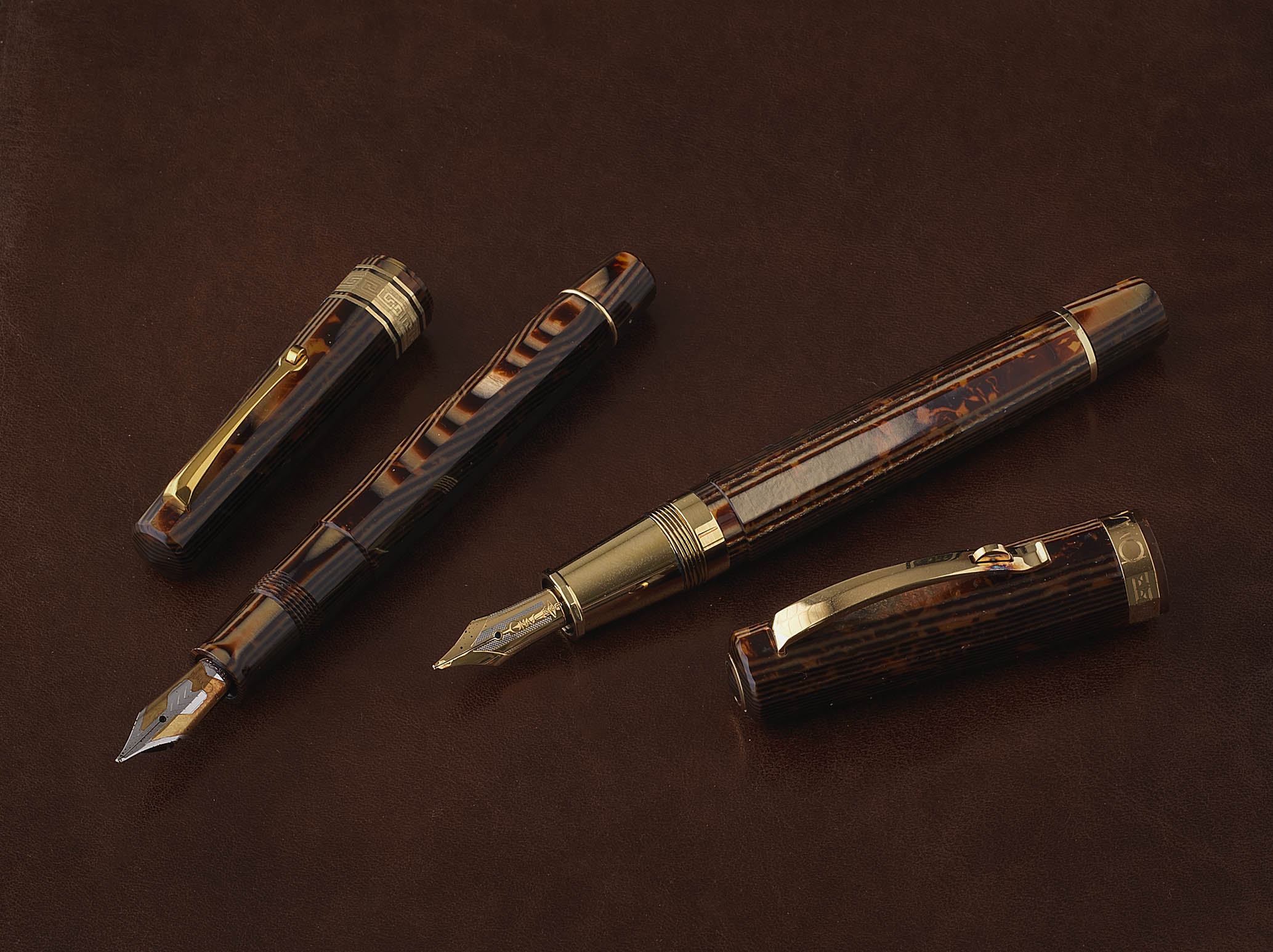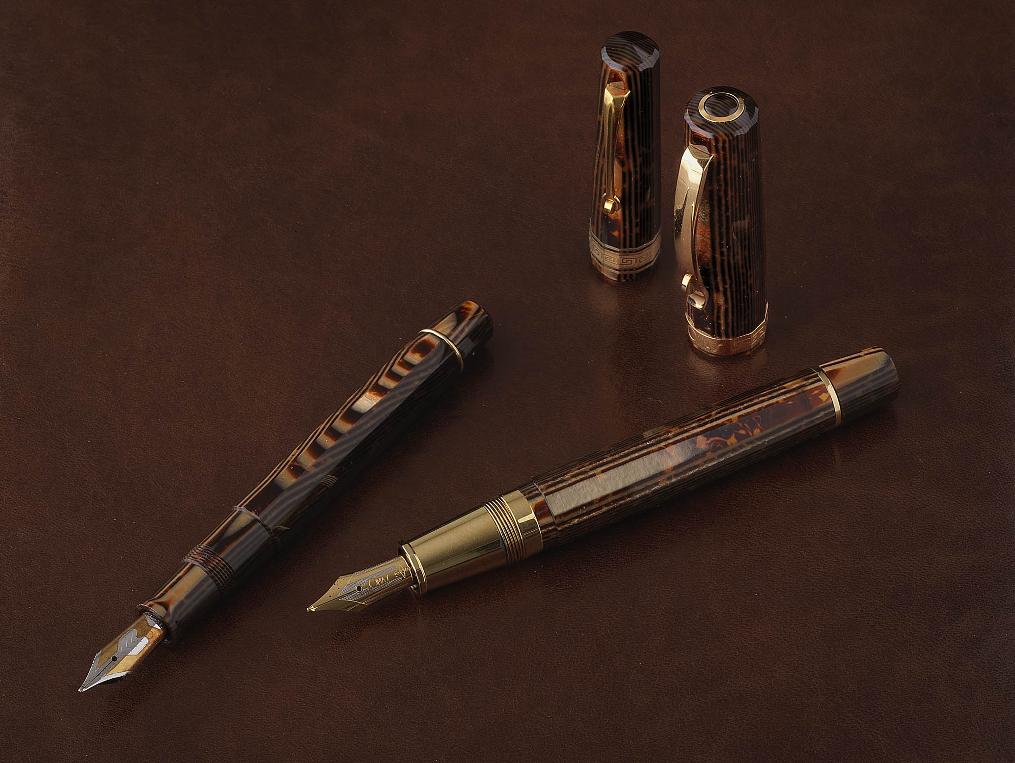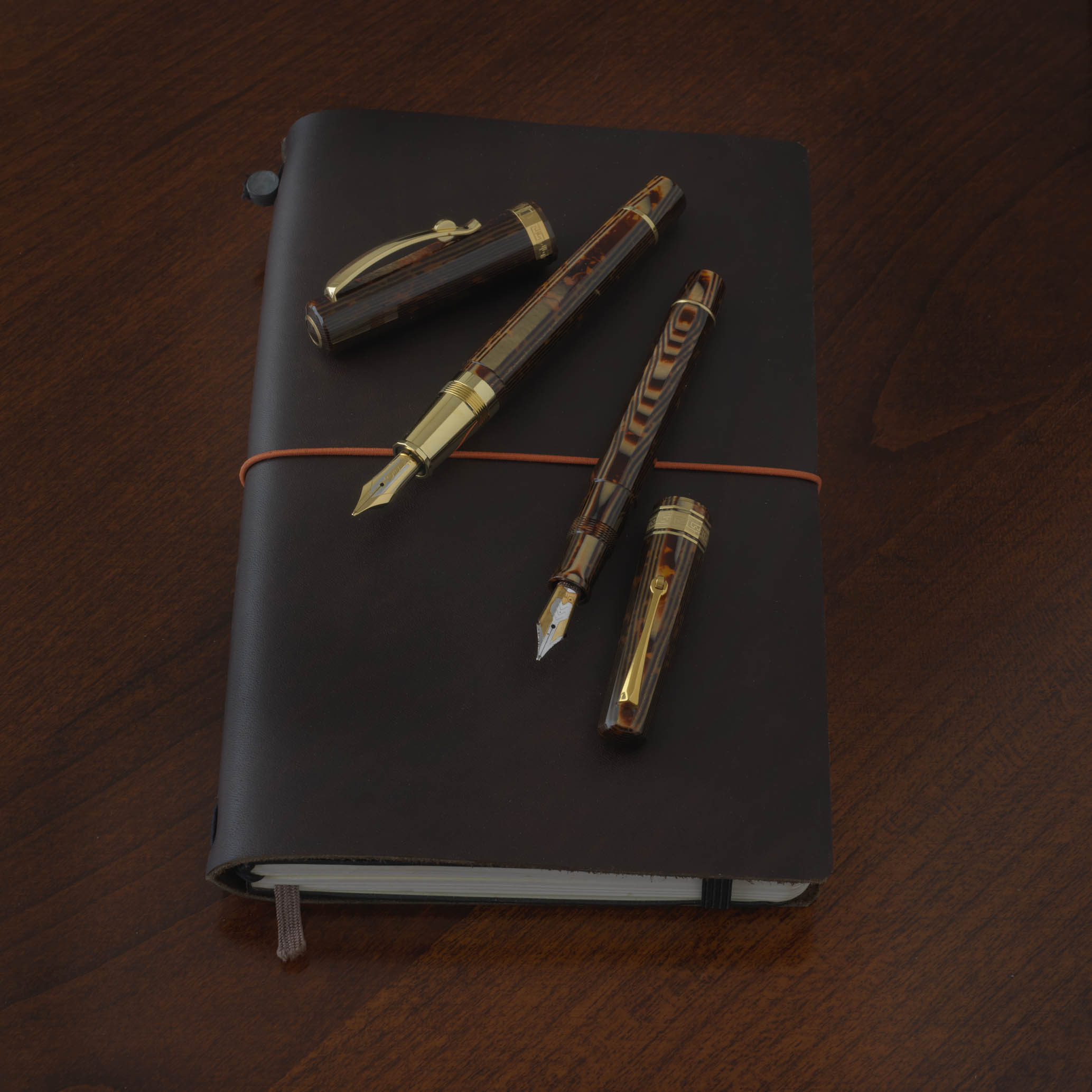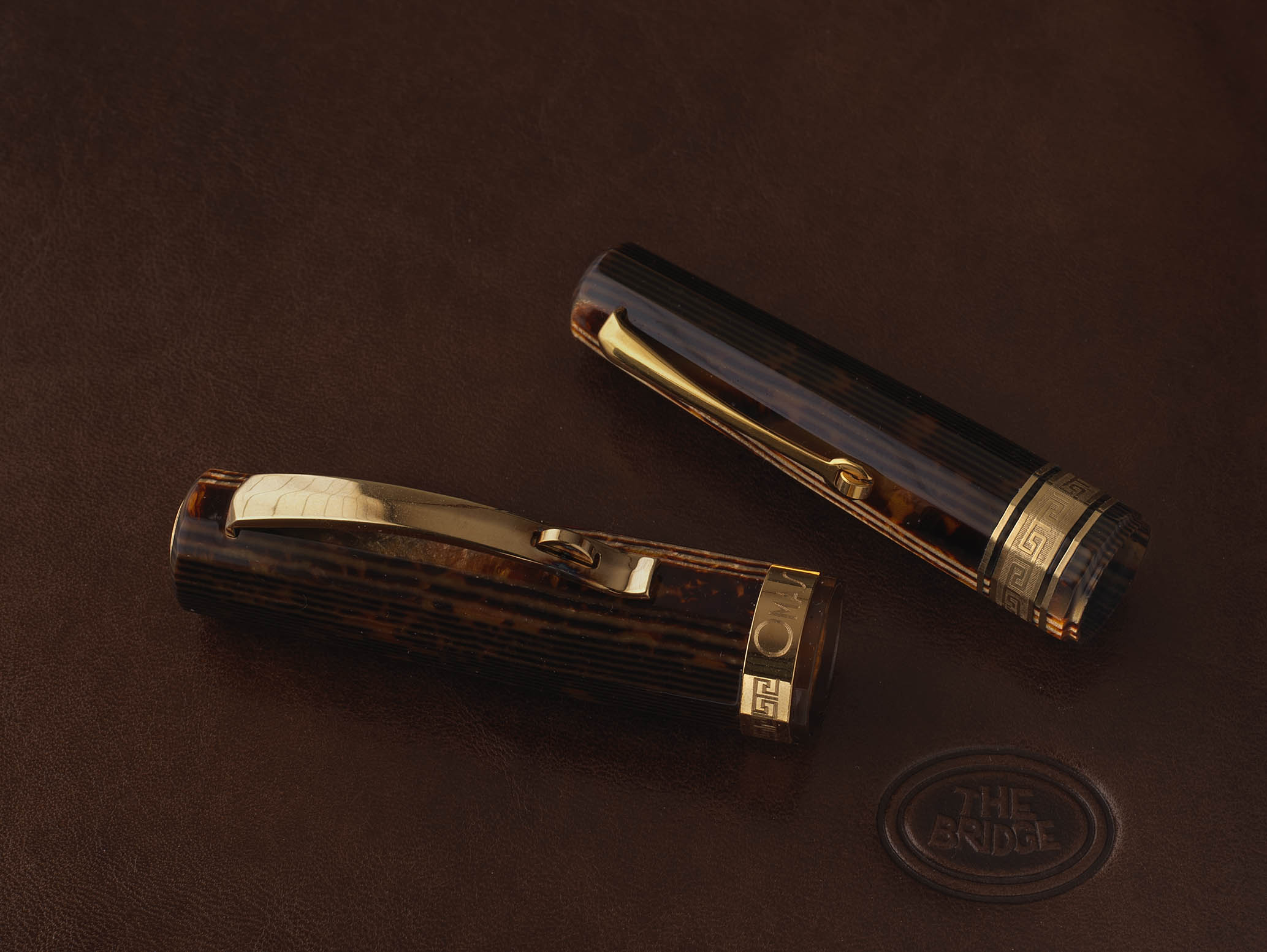 E poiché, per il Natale scorso, ho ricevuto in regalo una nuova Arte Italiana Paragon in celluloide Arco marrone (la “nuova” Paragon), ho colto l’opportunità per discutere le mie due penne insieme, presentando le mie impressioni e considerazioni sulla loro estetica e funzionalità. Siccome considero entrambe le penne veri e propri capolavori dell’artigianato italiano, ho usato cone sfondo “naturale” per le mie foto di queste penne straordinarie qualcosa che considero anch’esso un’opera d’arte funzionale in termini di materiali e di fine mano d’opera artigiana (un altro graditissimo regalo natalizio): un blocco per conferenze prodotto da The Bridge in pelle vegetale tamponata a mano. In altre immagini, le penne riposano sulla pelle ingrassata, marrone scuro, di un faux-Midori nella elusiva taglia A5, che la Midori stessa non produce. In altre, sono fotografate sullo sfondo marrone dorato di una scatola in radica, che proviene dallo storico (e purtroppo scomparso) negozio di Giudici in via Montenapoleone a Milano.