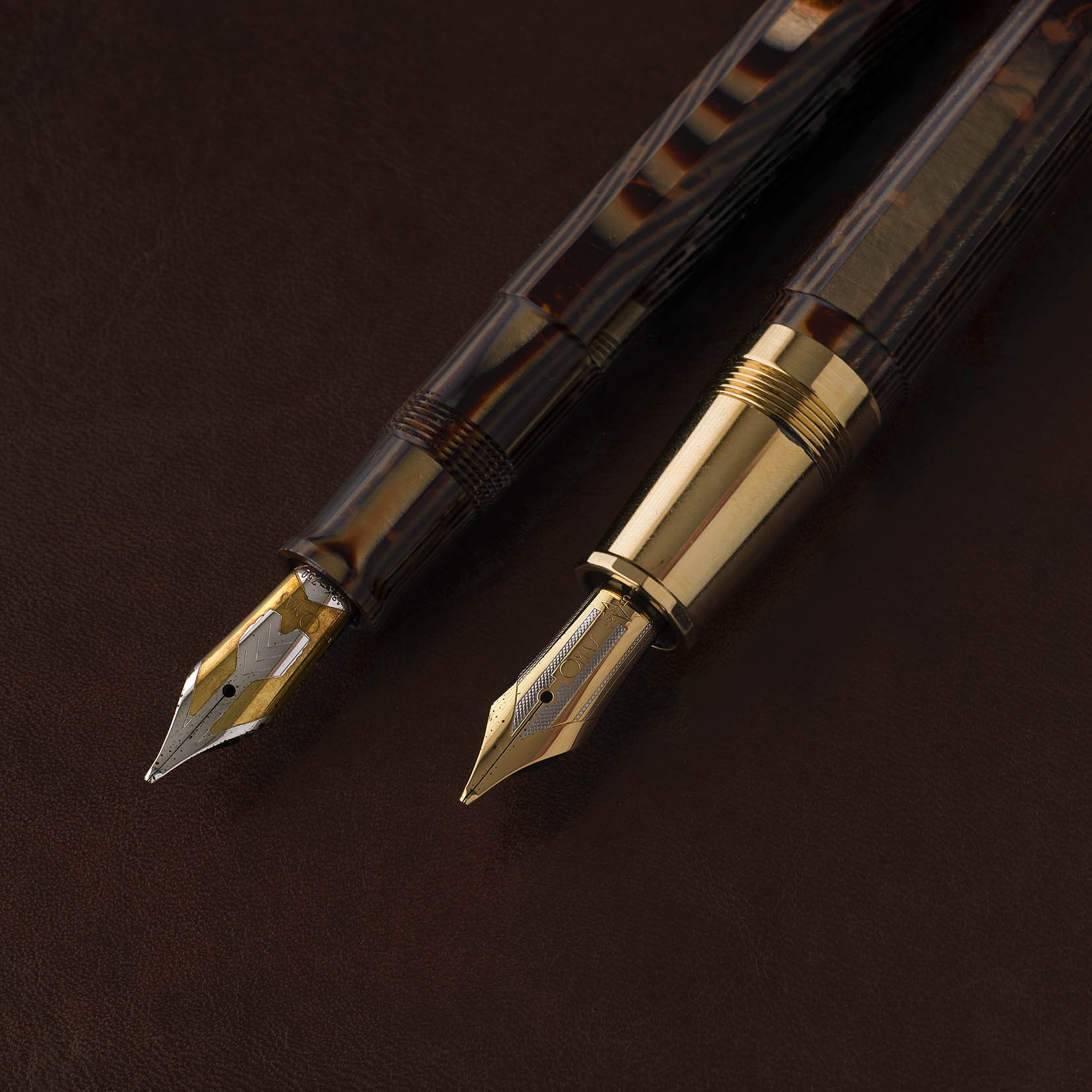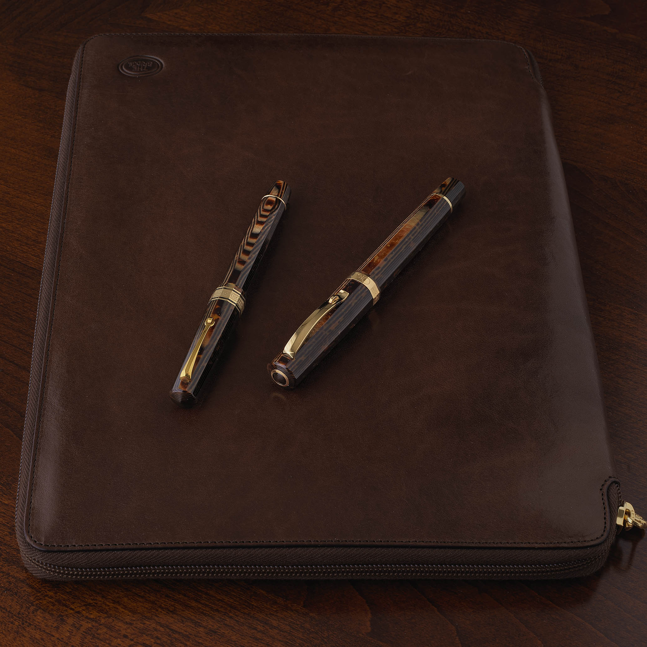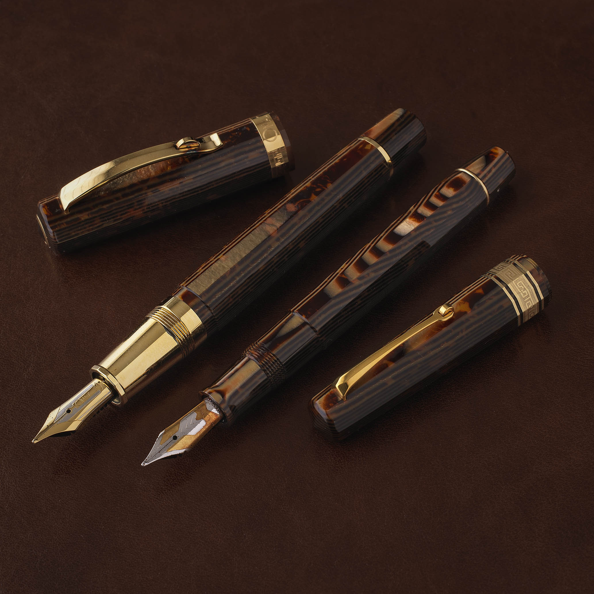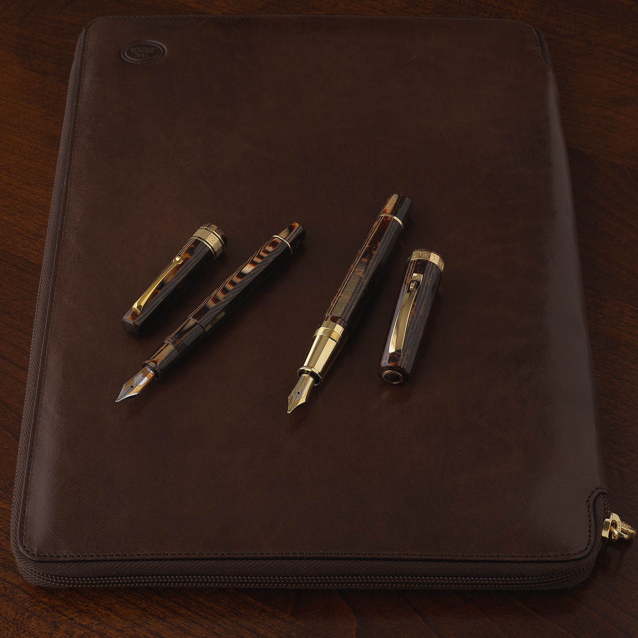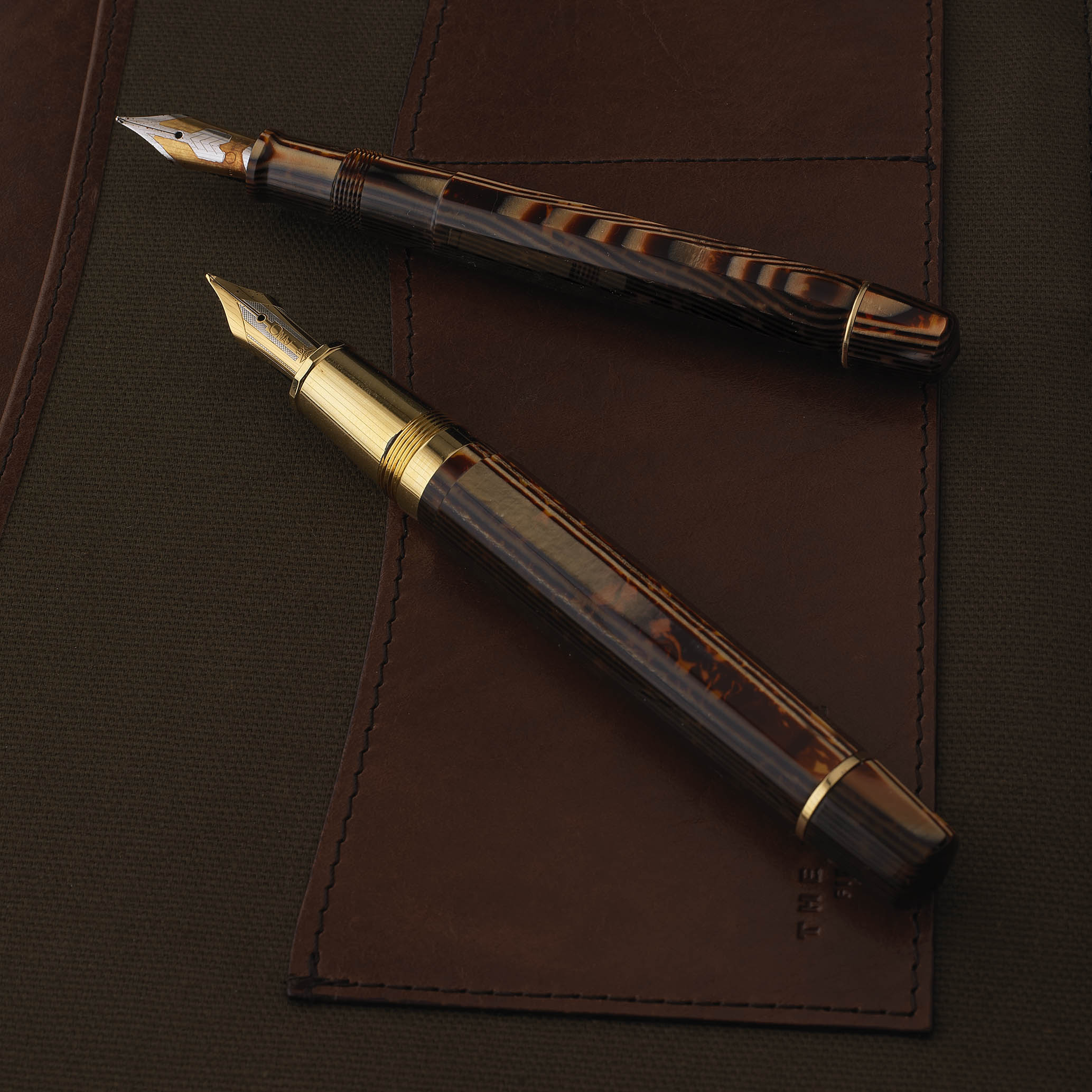 E poiché, per il Natale scorso, ho ricevuto in regalo una nuova Arte Italiana Paragon in celluloide Arco marrone (la “nuova” Paragon), ho colto l’opportunità per discutere le mie due penne insieme, presentando le mie impressioni e considerazioni sulla loro estetica e funzionalità. Siccome considero entrambe le penne veri e propri capolavori dell’artigianato italiano, ho usato cone sfondo “naturale” per le mie foto di queste penne straordinarie qualcosa che considero anch’esso un’opera d’arte funzionale in termini di materiali e di fine mano d’opera artigiana (un altro graditissimo regalo natalizio): un blocco per conferenze prodotto da The Bridge in pelle vegetale tamponata a mano. In altre immagini, le penne riposano sulla pelle ingrassata, marrone scuro, di un faux-Midori nella elusiva taglia A5, che la Midori stessa non produce. In altre, sono fotografate sullo sfondo marrone dorato di una scatola in radica, che proviene dallo storico (e purtroppo scomparso) negozio di Giudici in via Montenapoleone a Milano.