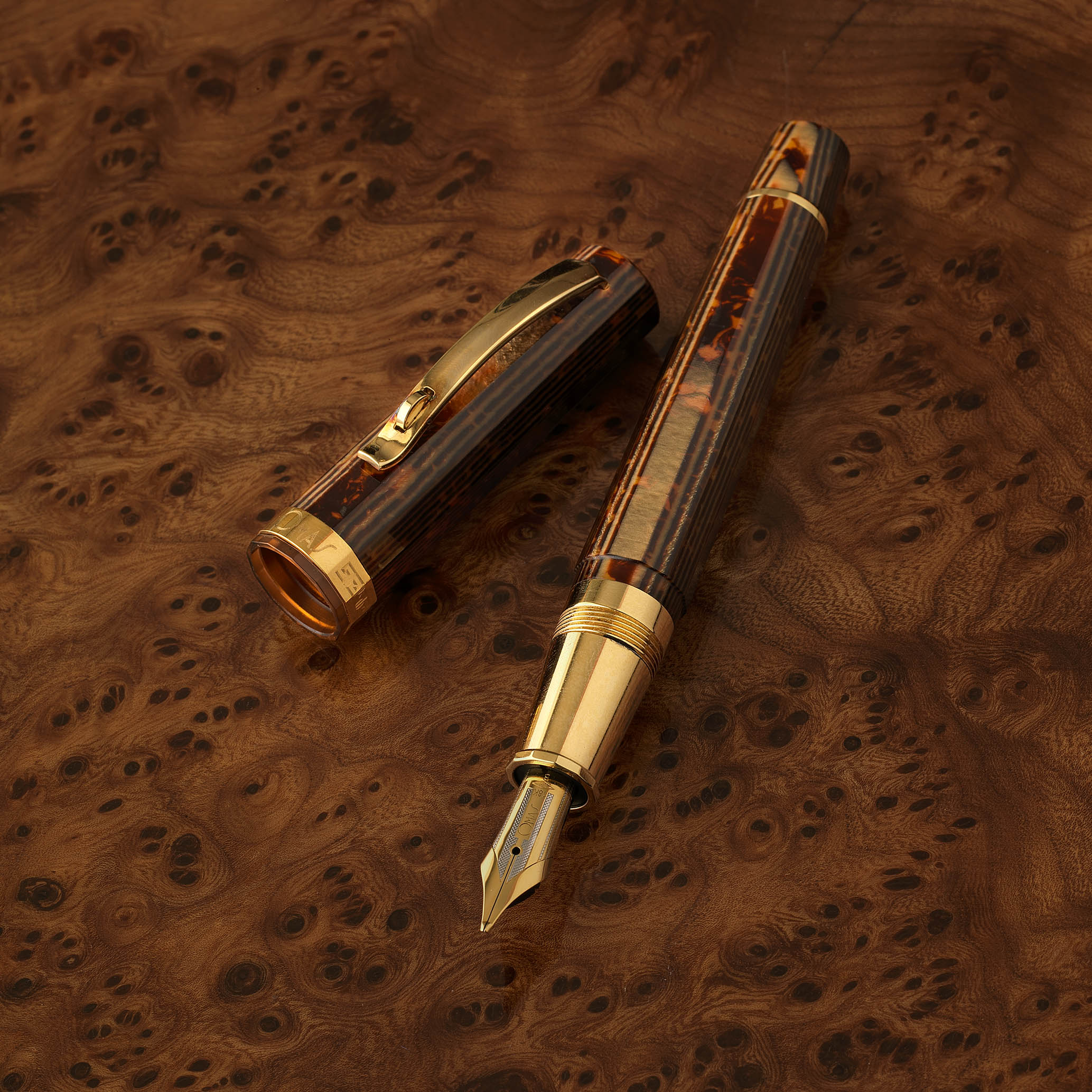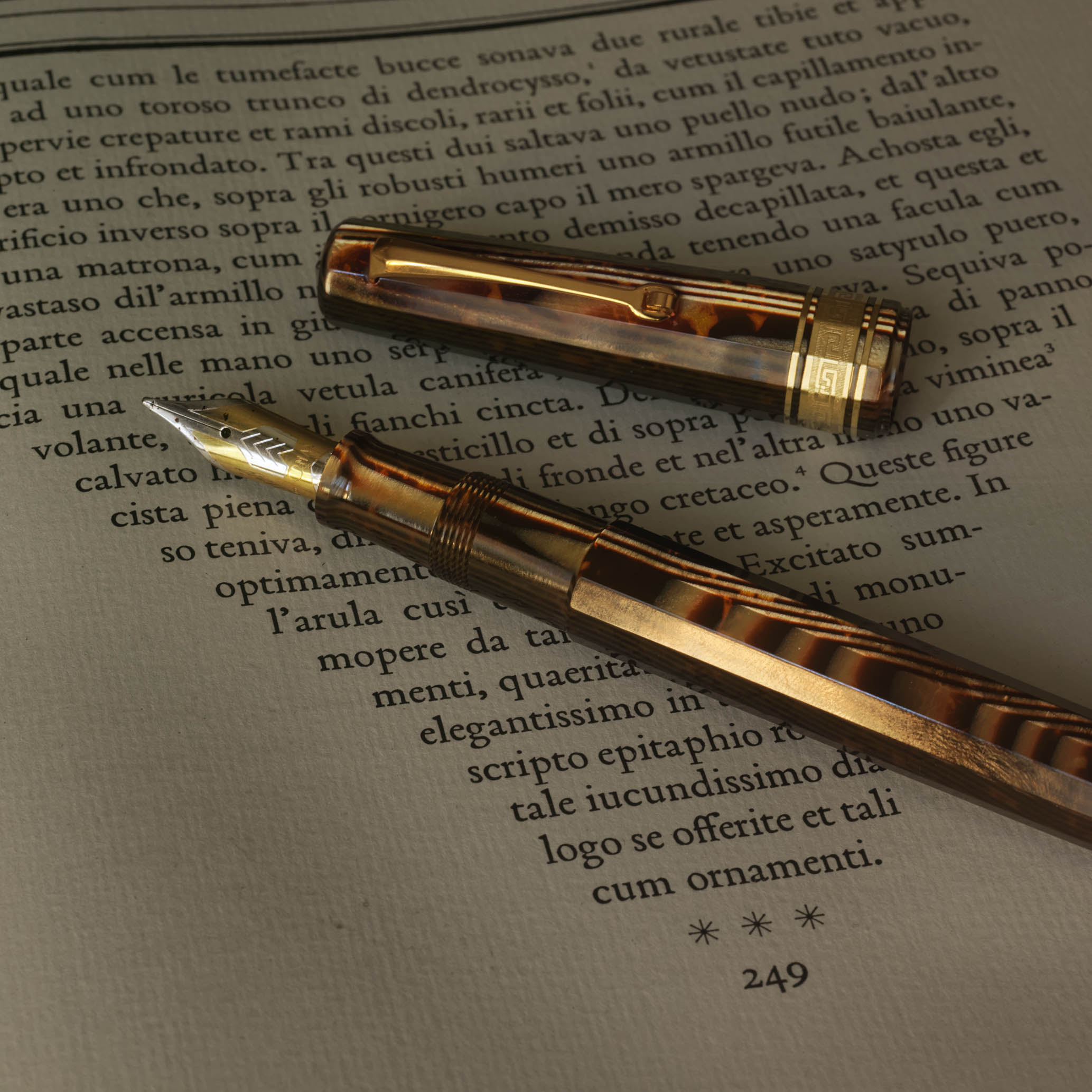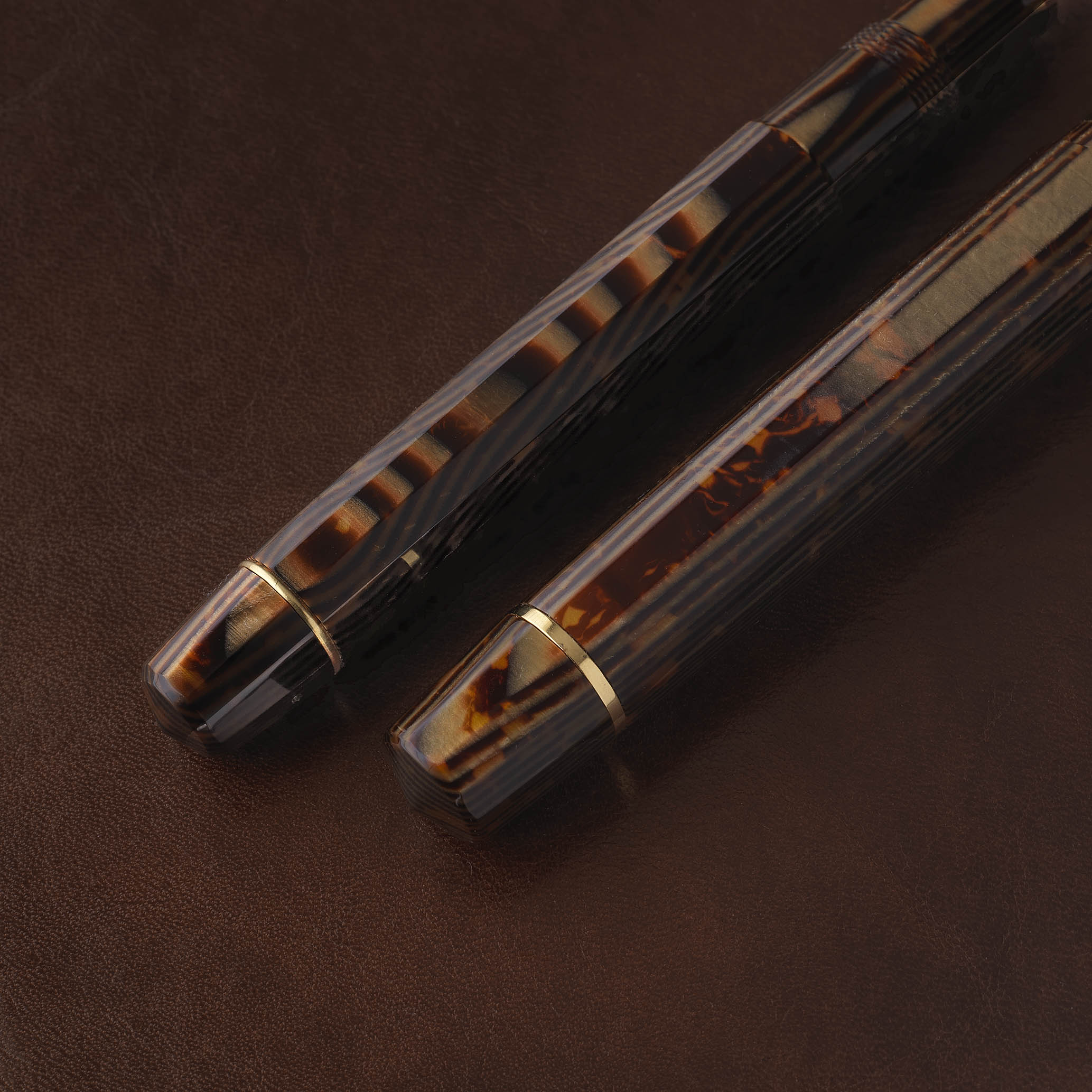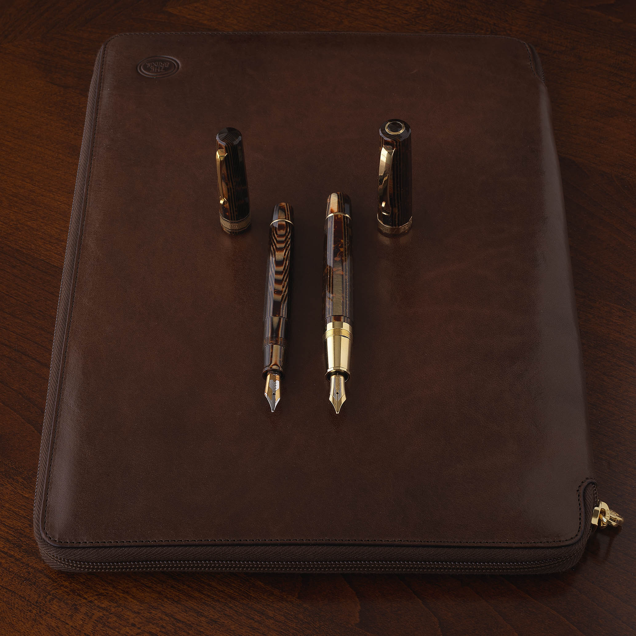 E poiché, per il Natale scorso, ho ricevuto in regalo una nuova Arte Italiana Paragon in celluloide Arco marrone (la “nuova” Paragon), ho colto l’opportunità per discutere le mie due penne insieme, presentando le mie impressioni e considerazioni sulla loro estetica e funzionalità. Siccome considero entrambe le penne veri e propri capolavori dell’artigianato italiano, ho usato cone sfondo “naturale” per le mie foto di queste penne straordinarie qualcosa che considero anch’esso un’opera d’arte funzionale in termini di materiali e di fine mano d’opera artigiana (un altro graditissimo regalo natalizio): un blocco per conferenze prodotto da The Bridge in pelle vegetale tamponata a mano. In altre immagini, le penne riposano sulla pelle ingrassata, marrone scuro, di un faux-Midori nella elusiva taglia A5, che la Midori stessa non produce. In altre, sono fotografate sullo sfondo marrone dorato di una scatola in radica, che proviene dallo storico (e purtroppo scomparso) negozio di Giudici in via Montenapoleone a Milano.