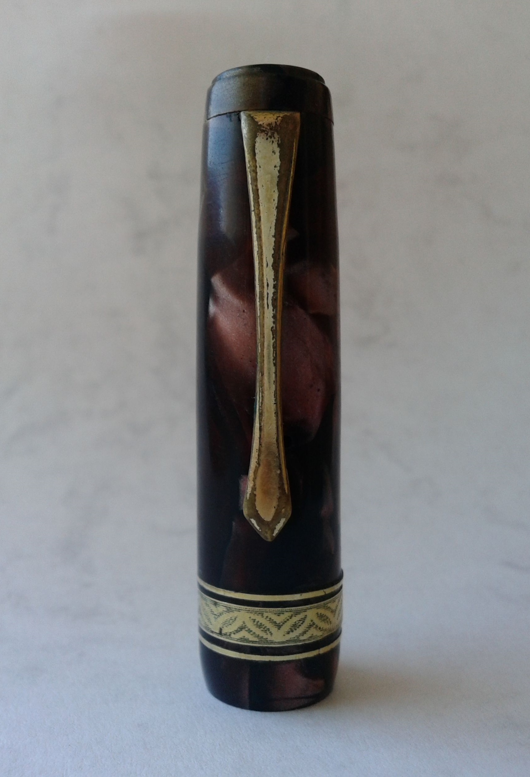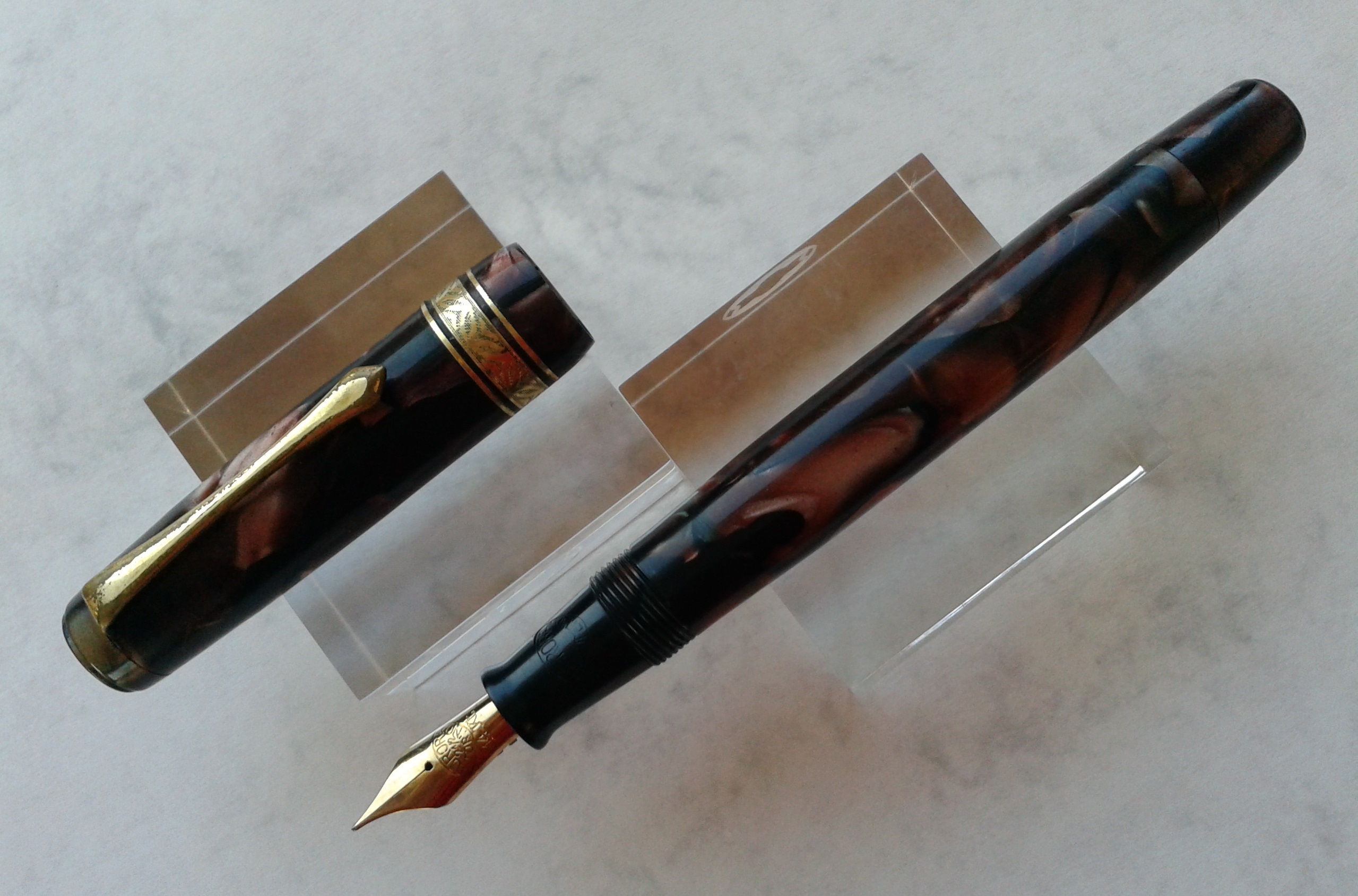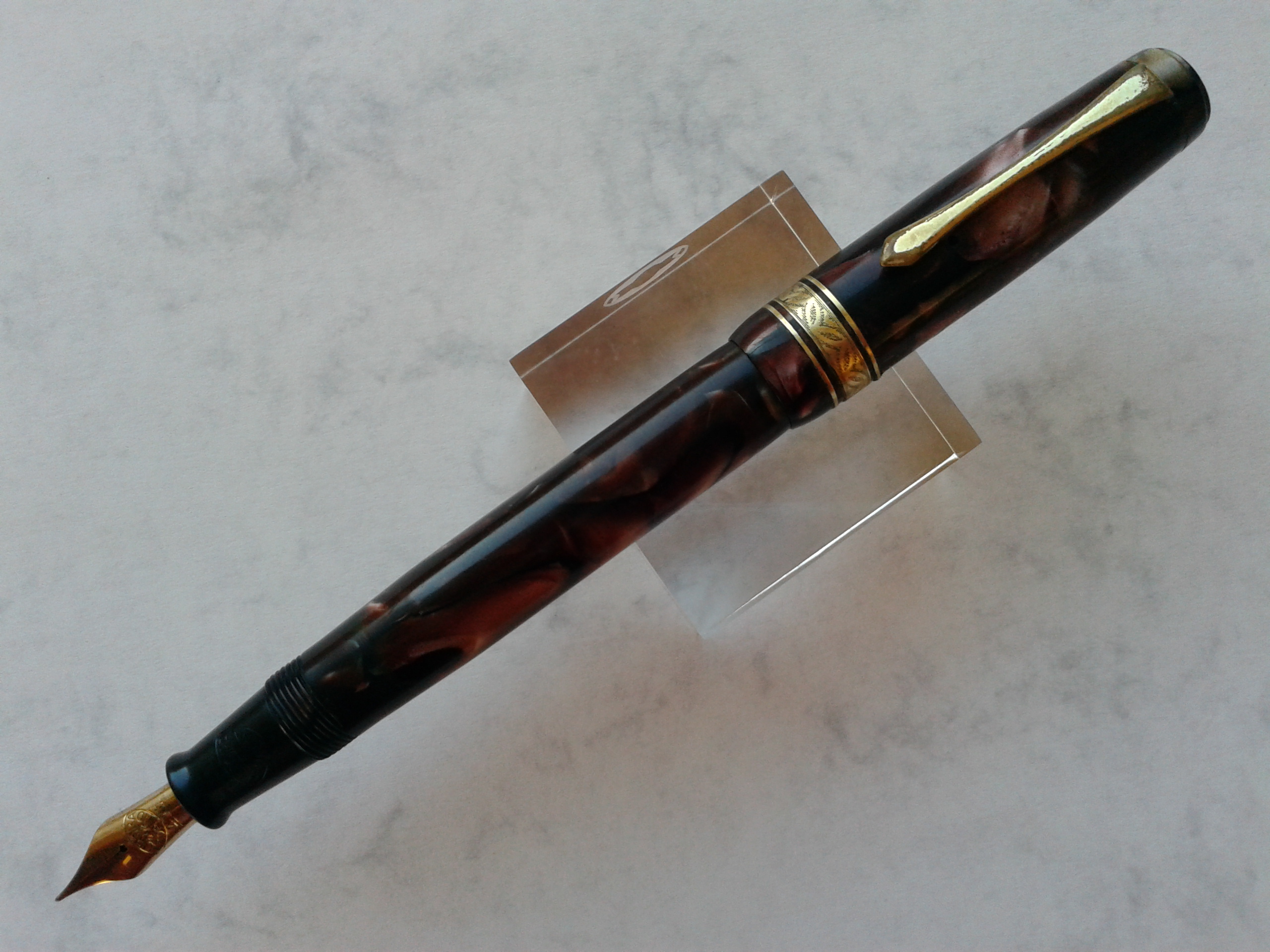 AURORA SUPERNA taglia media, in celluloide borgogna (rosso marmorizzato) tornita da barra piena, parti metalliche a vista laminate e placcate oro, pennino originale Aurora in oro 14 Kt., caricamento a levetta di fondo (variante), produzione Aurora metà anni 1930.