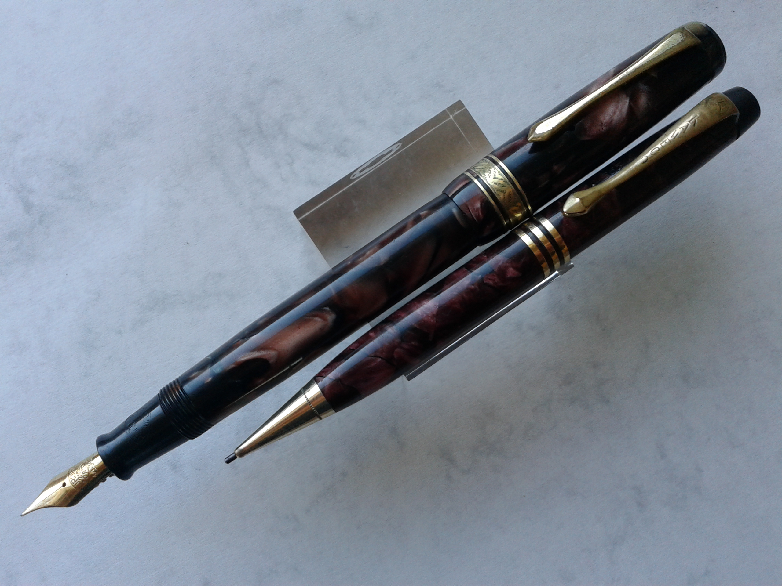 Per coloro tra noi che amano anche i portamine, ecco un piccolo esempio di come a metà anni 1930 si poteva assemblare una parure prestigiosa con strumenti da scrittura di Marchi differenti, puntando sulle affinità tra le celluloidi e sull'omogeneità delle dorature...