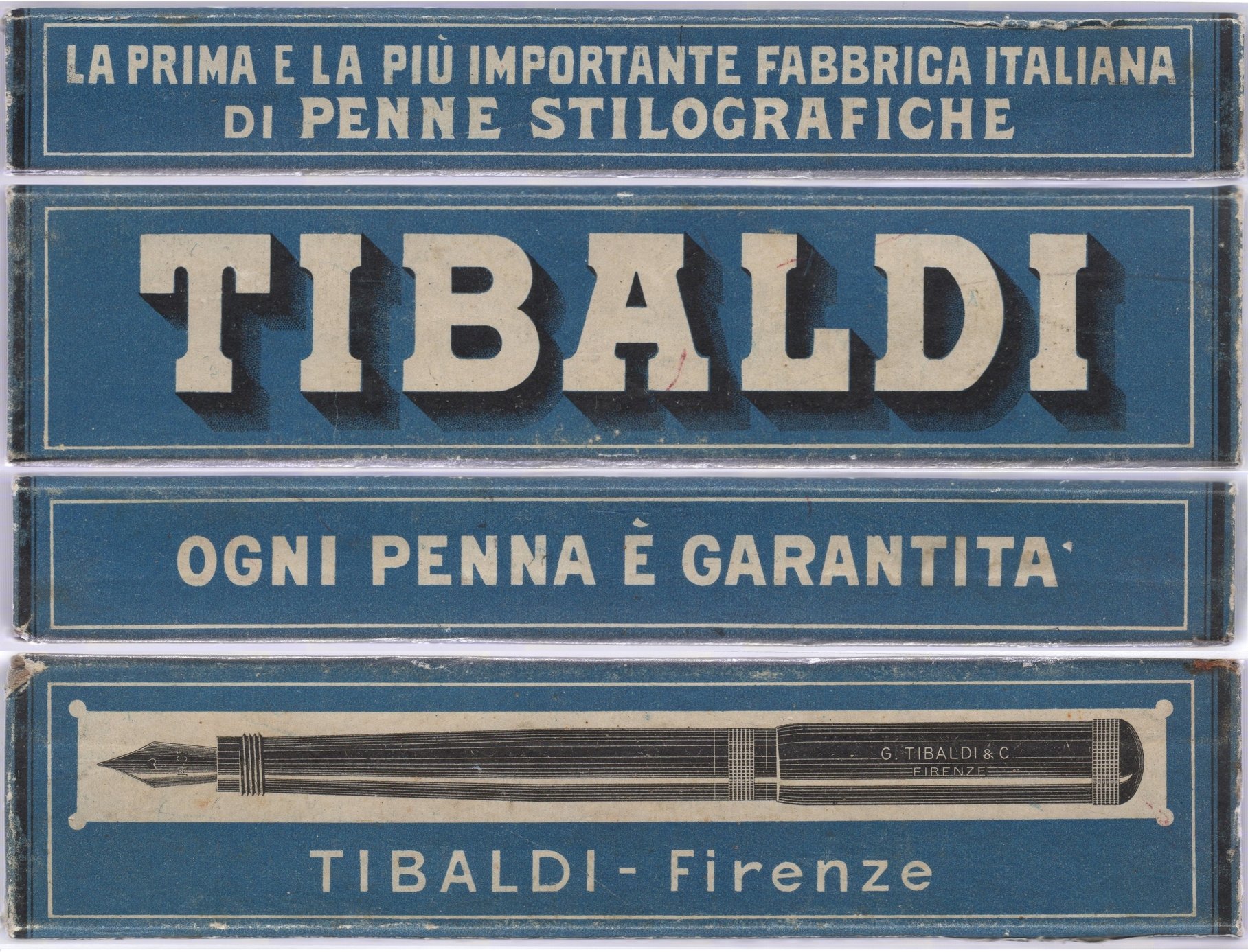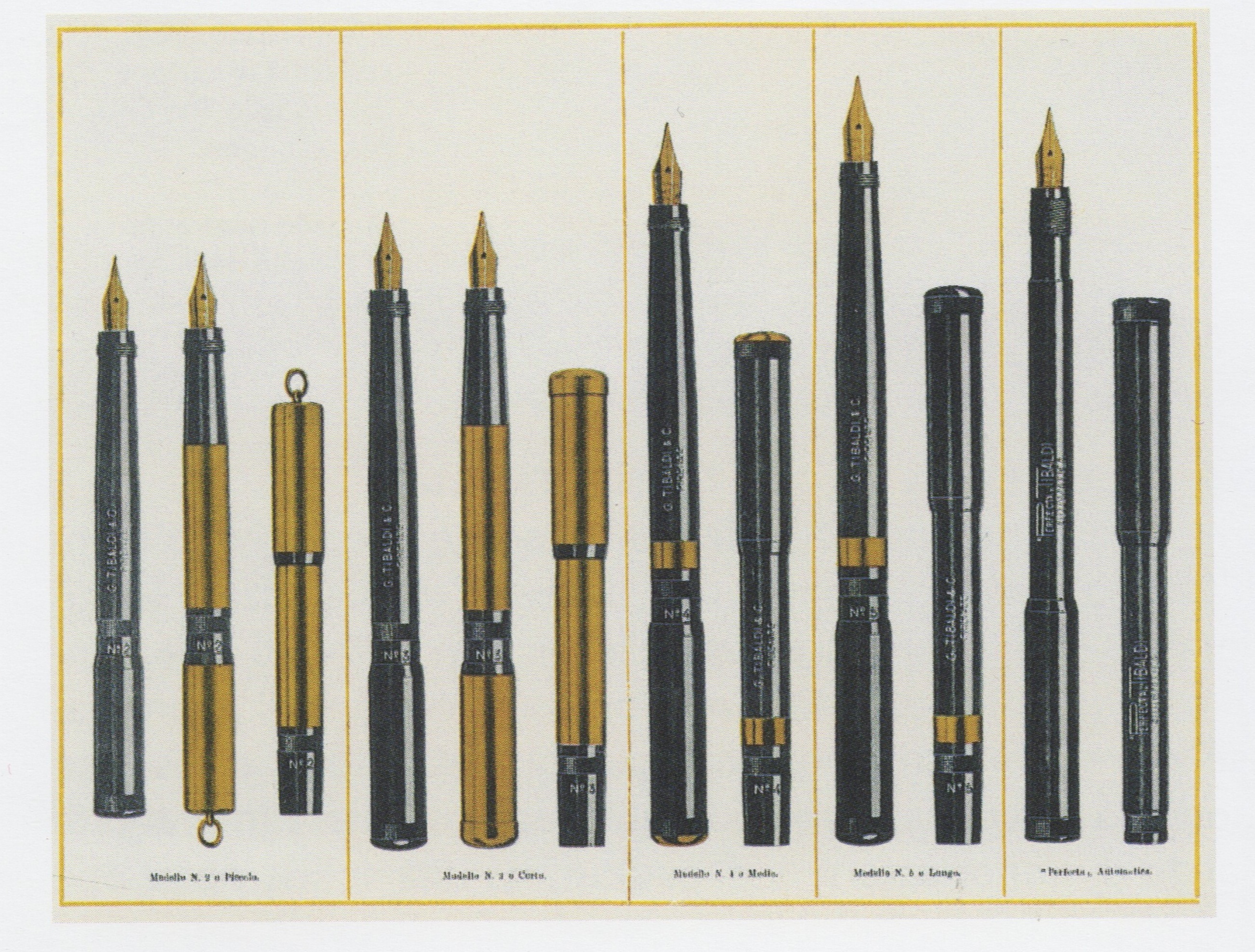 Nell’enciclopedia di Letizia Jacopini, a pag.148 compare una pagina di quello che dovrebbe essere il Listino n°1, presumibilmente risalente al 1920, che mostra la limitata gamma dei modelli di primissima produzione a marchio TIBALDI, dopo le prime esperienze fatte dalla Casa sotto l’esterofilo (e volutamente fuorviante) marchio “The GBT Pen - London”: si tratta di quattro misure di rientranti (#2 piccola, #3 corta, #4 media, #5 lunga) e del top di gamma, il modello “Perfecta” (offerta significativamente senza decorazioni).