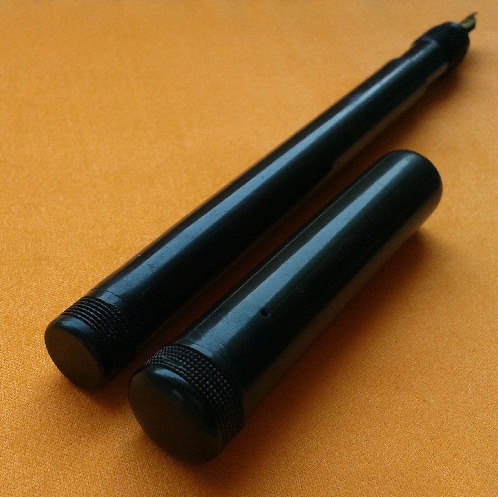 TIBALDI “PERFECTA” AUTOMATICA misura unica, in ebanite nera liscia, pennino retrattile a molla (Warranted 14 Kt), caricamento a torsione, prodotta in Italia nell’anno 1920. Inquadramento generale