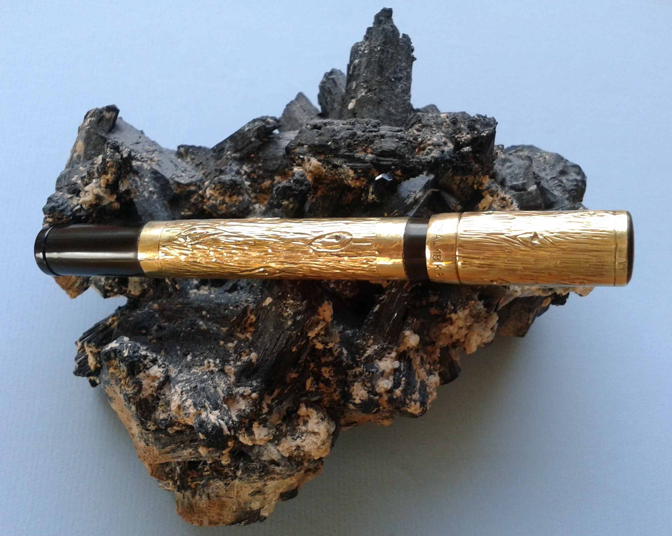 La riproduzione artistica di una nodosa corteccia d’albero sull’oro della laminatura, ben si accosta in questa reinterpretazione stilografica della “