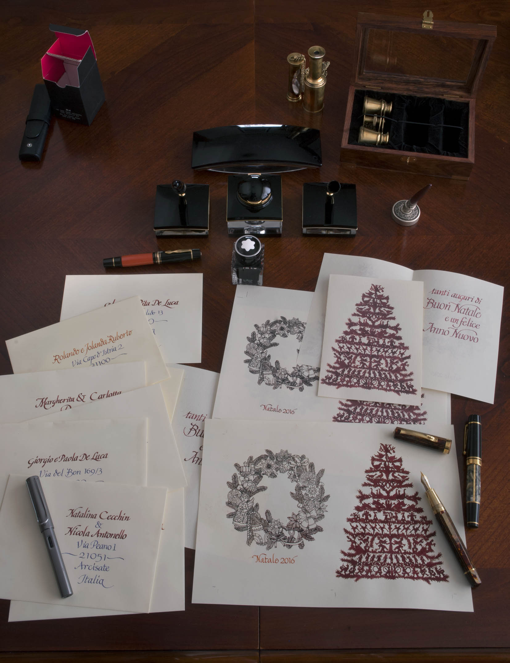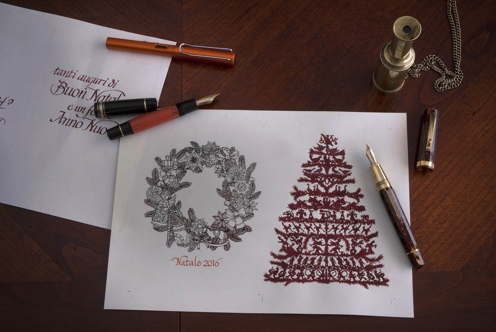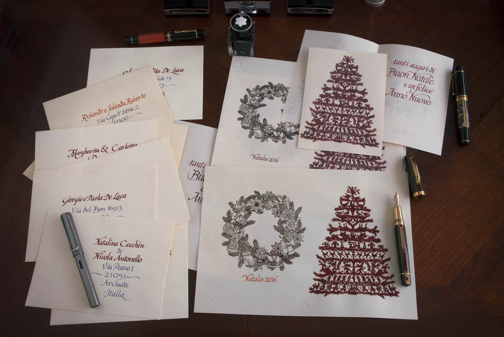 Per la pagina posteriore ho disegnato, con la Hemingway e l'inchiostro Montblanc Toffee Brown, una ghirlanda natalizia. La scritta "Natale 2016" é fatta con una Lamy e pennino da 1.1 mm, usando l'inchiostro Lamy Copper Orange, in cartucce.