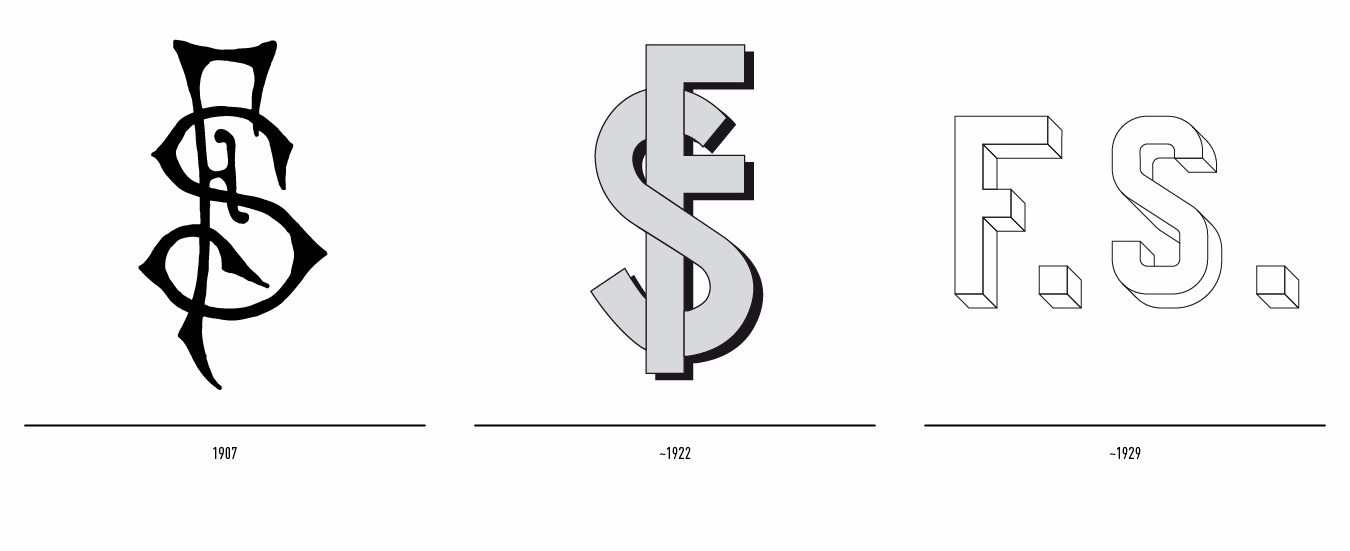 Di seguito allego l’evoluzione del logo delle Ferrovie (informazioni tratte dal sito museodelmarchioitaliano.it) dal 1907 (anno in cui furono accentrate tutte le tratte locali indipendenti) al 1922 al 1929 (il cambio successivo avverrà dopo la II Guerra nel 1946).