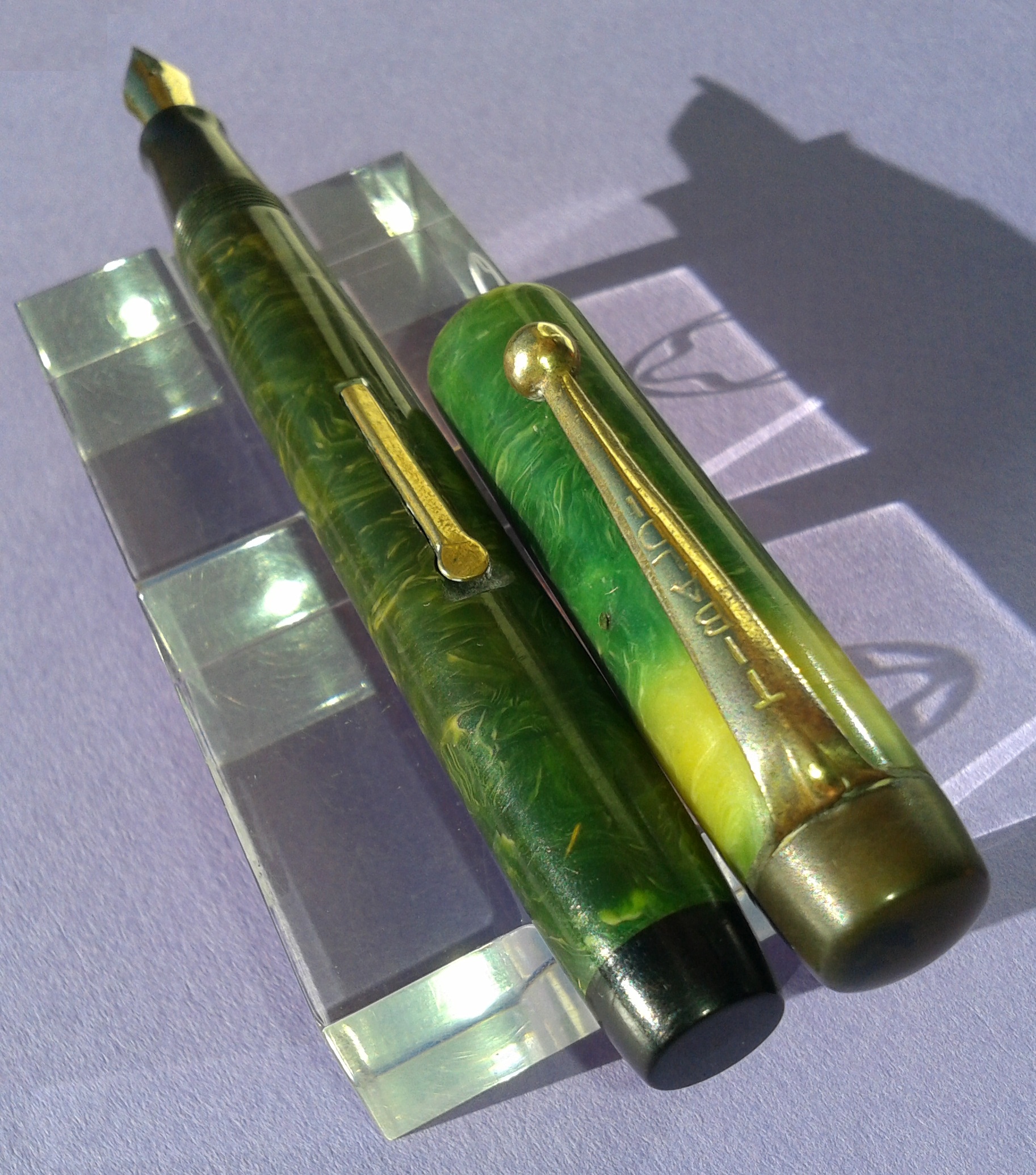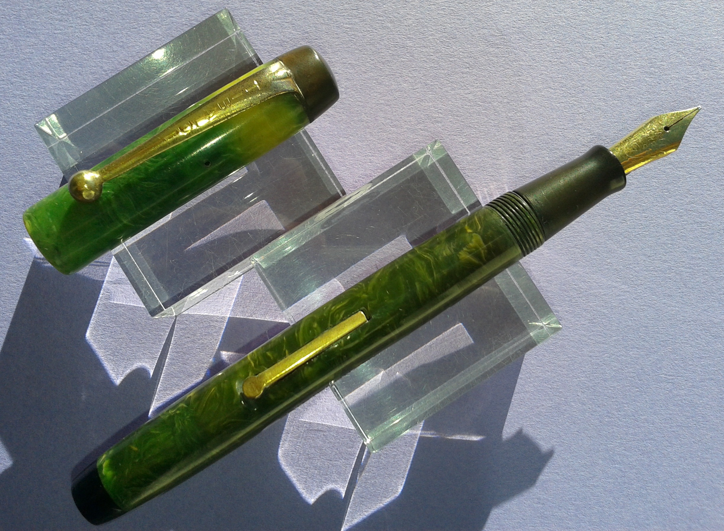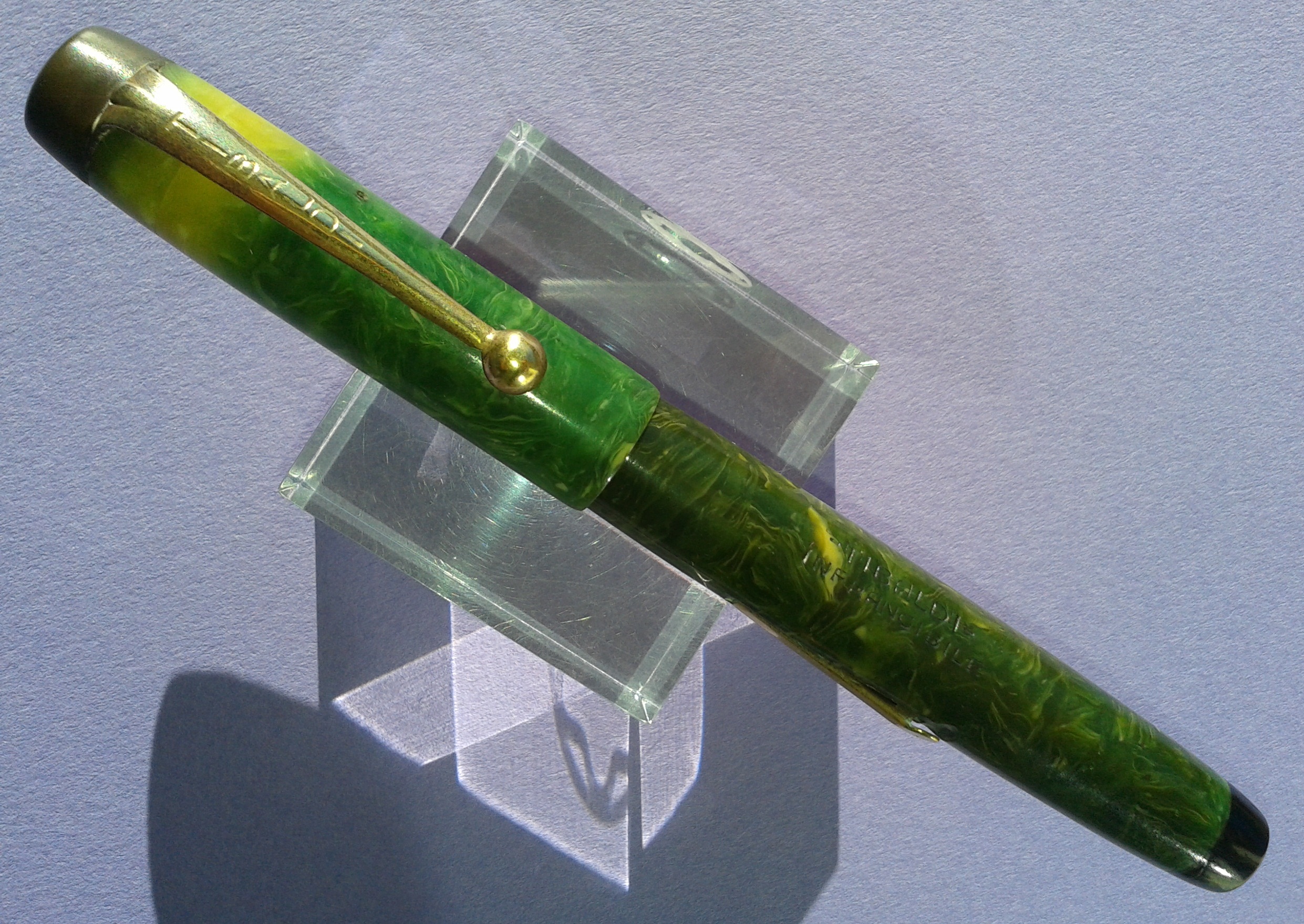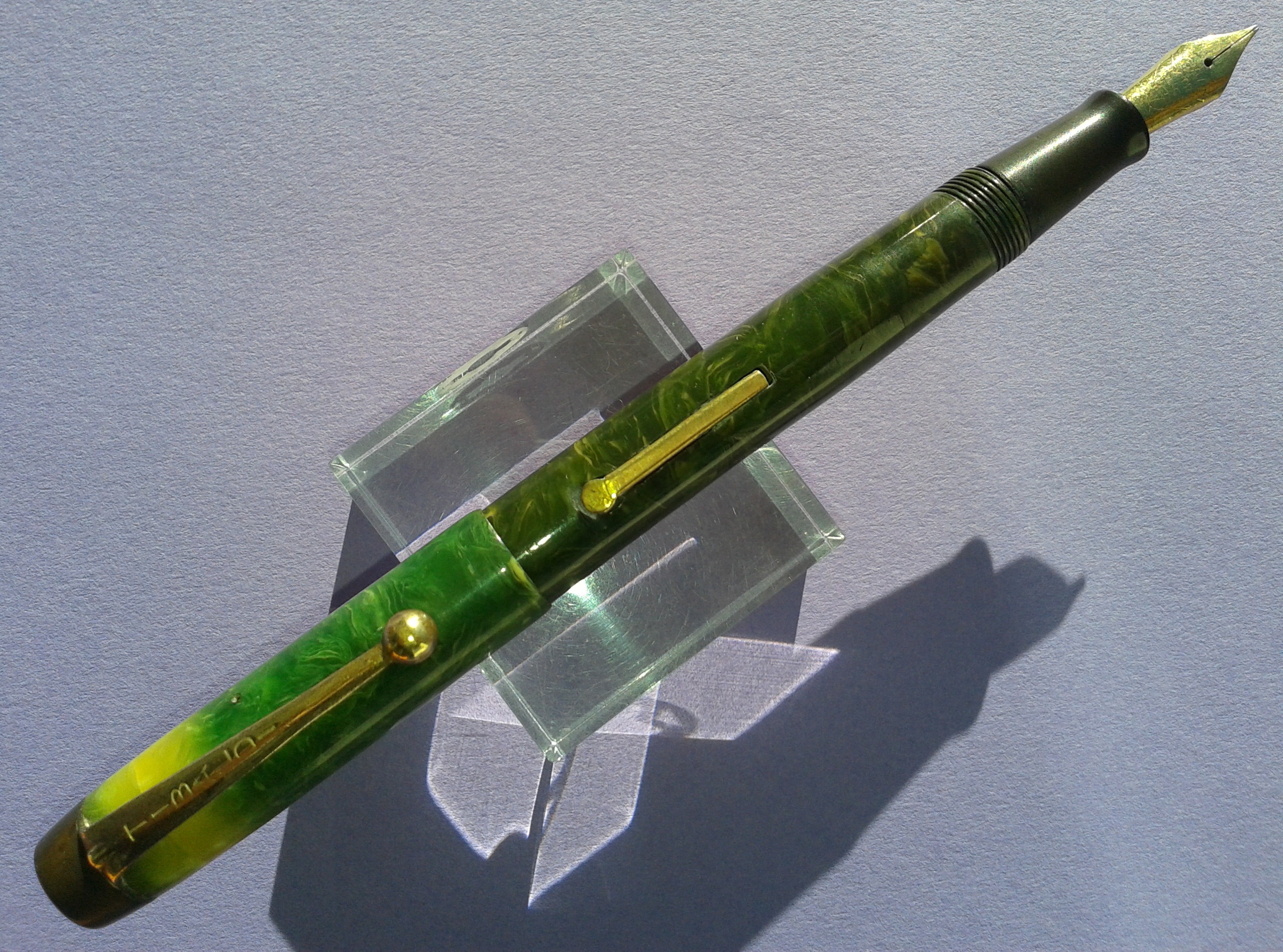 TIBALDI INFRANGIBILE misura media [#20] in celluloide “verde lapislazzolo” [sic] tornita da barra piena, parti metalliche a vista laminate oro, pennino Tibaldi Extra 14 Carati, caricamento a leva, produzione Italia anno 1930.