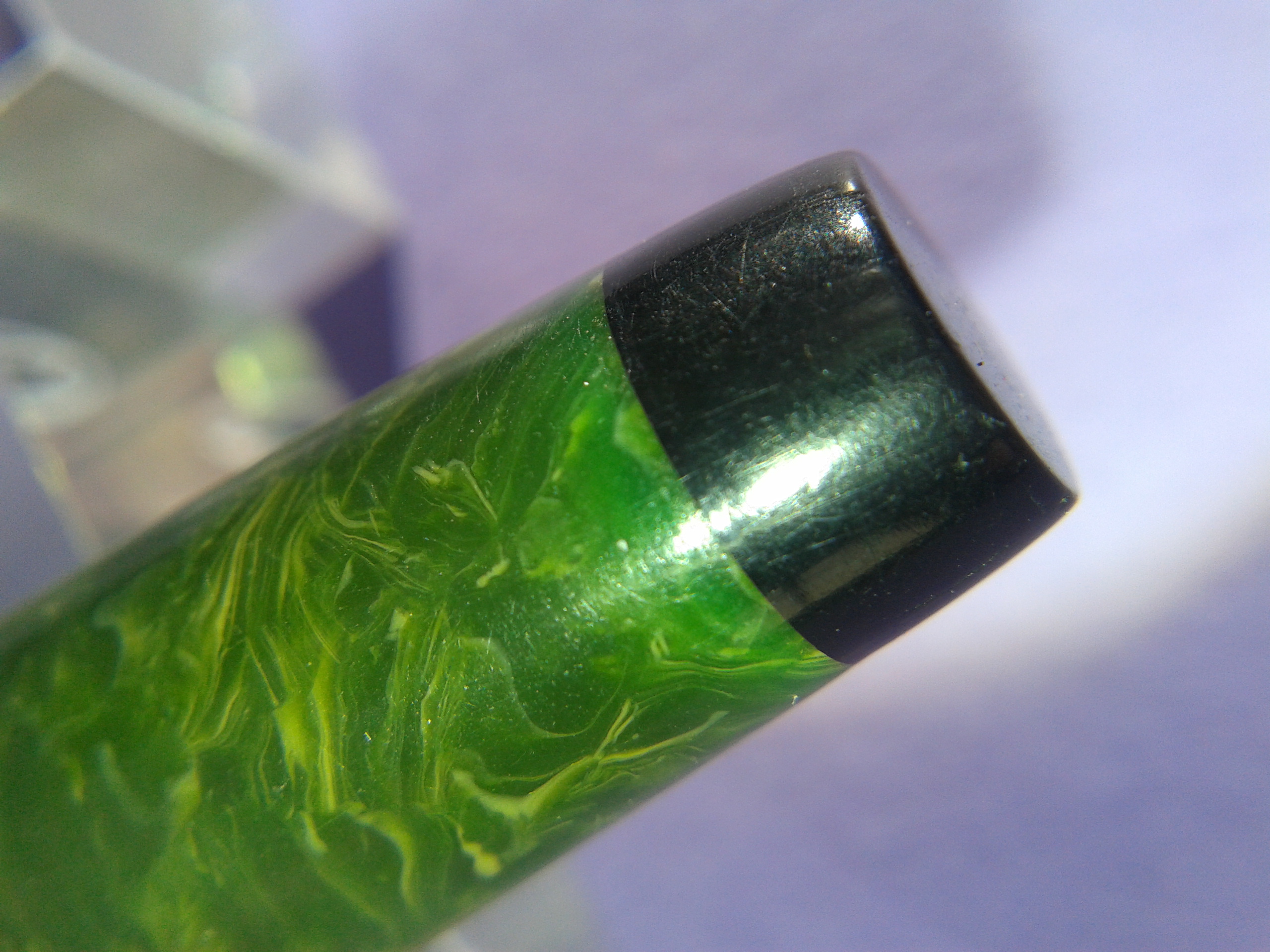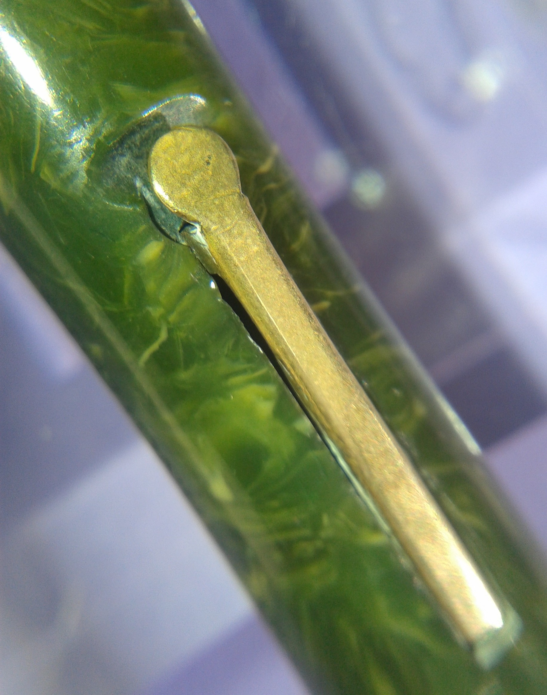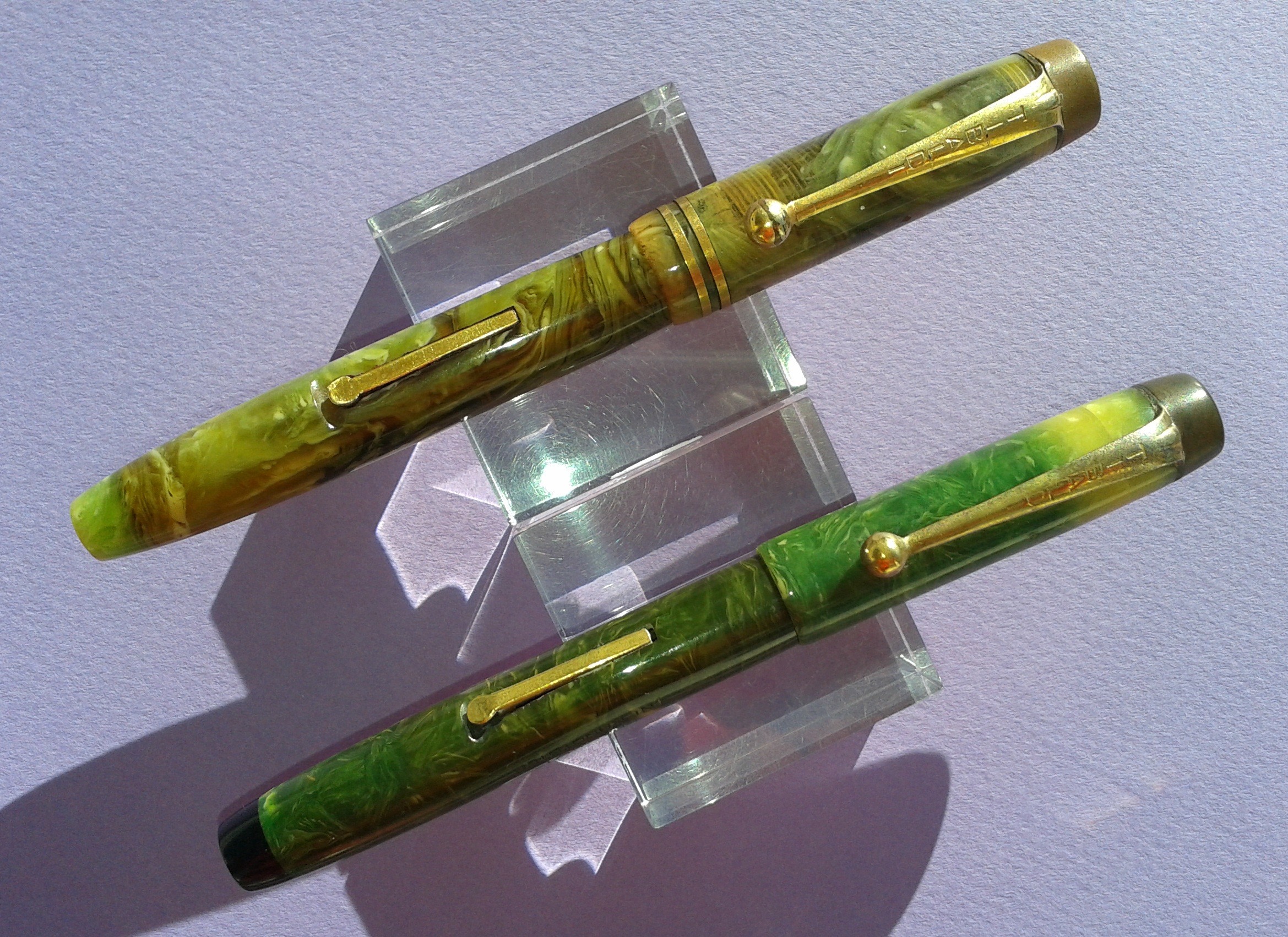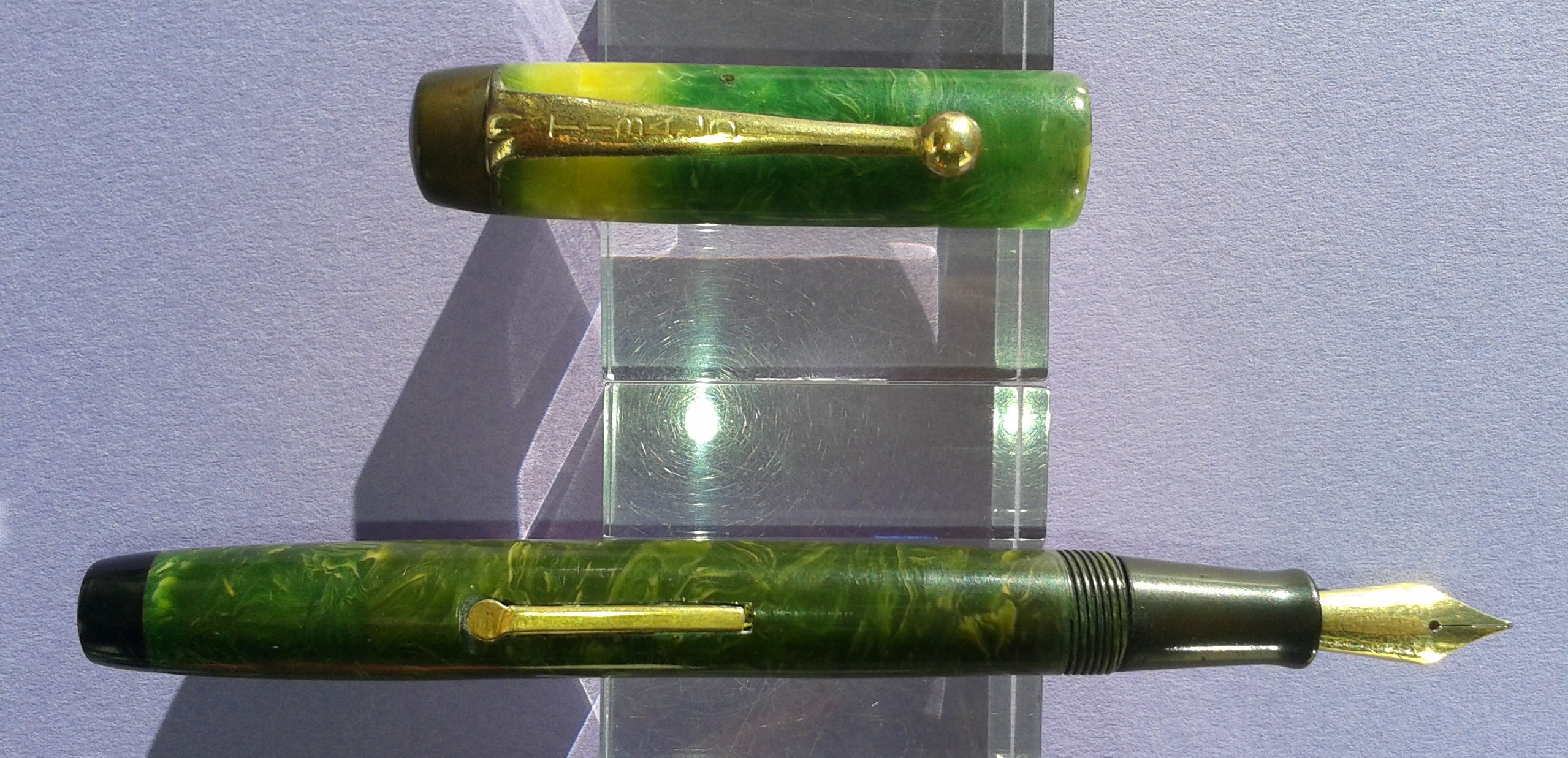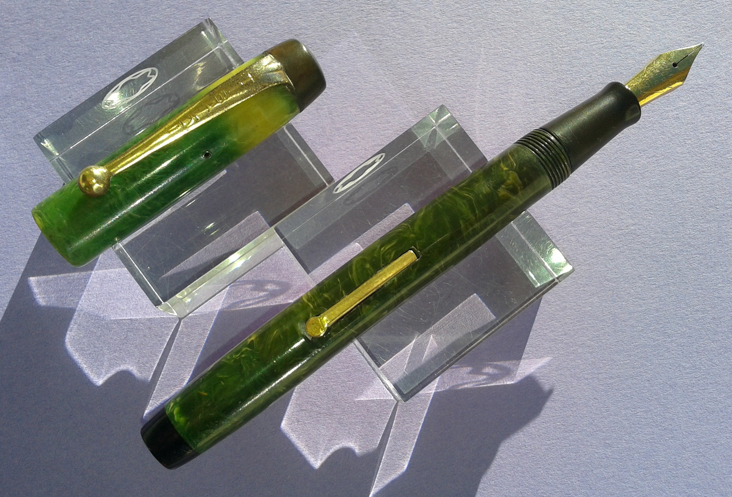 TIBALDI INFRANGIBILE misura media [#20] in celluloide “verde lapislazzolo” [sic] tornita da barra piena, parti metalliche a vista laminate oro, pennino Tibaldi Extra 14 Carati, caricamento a leva, produzione Italia anno 1930.