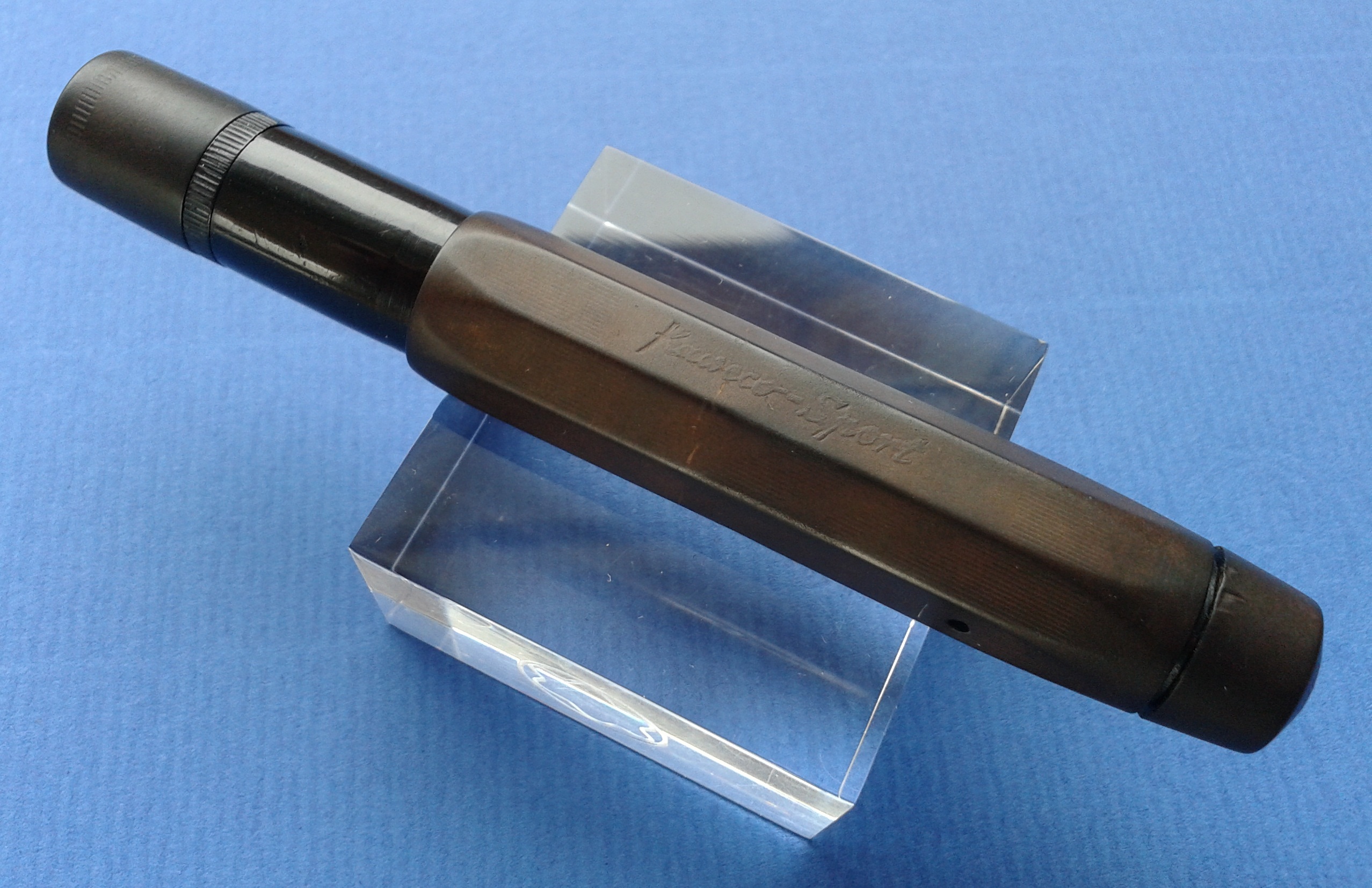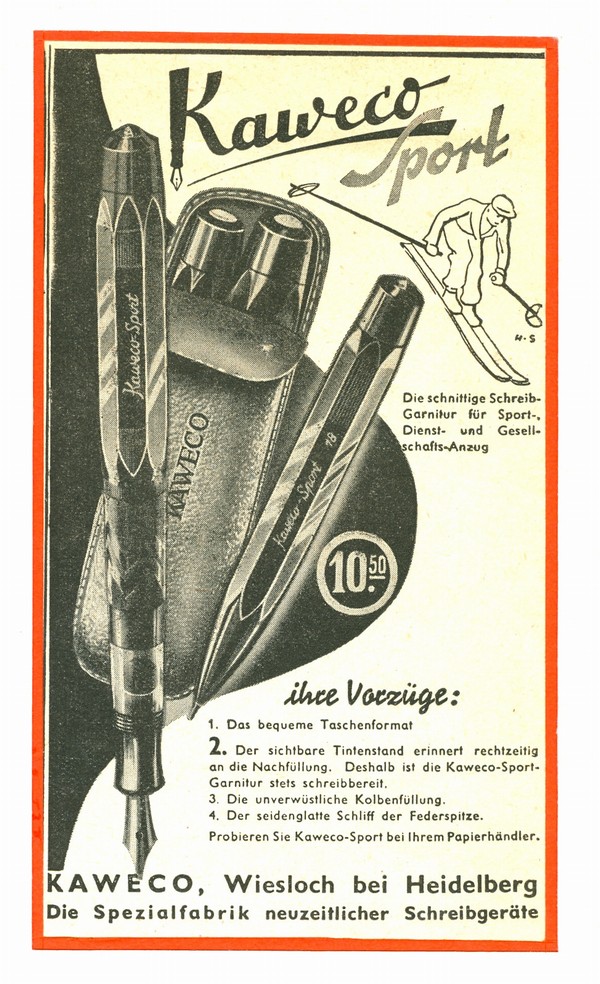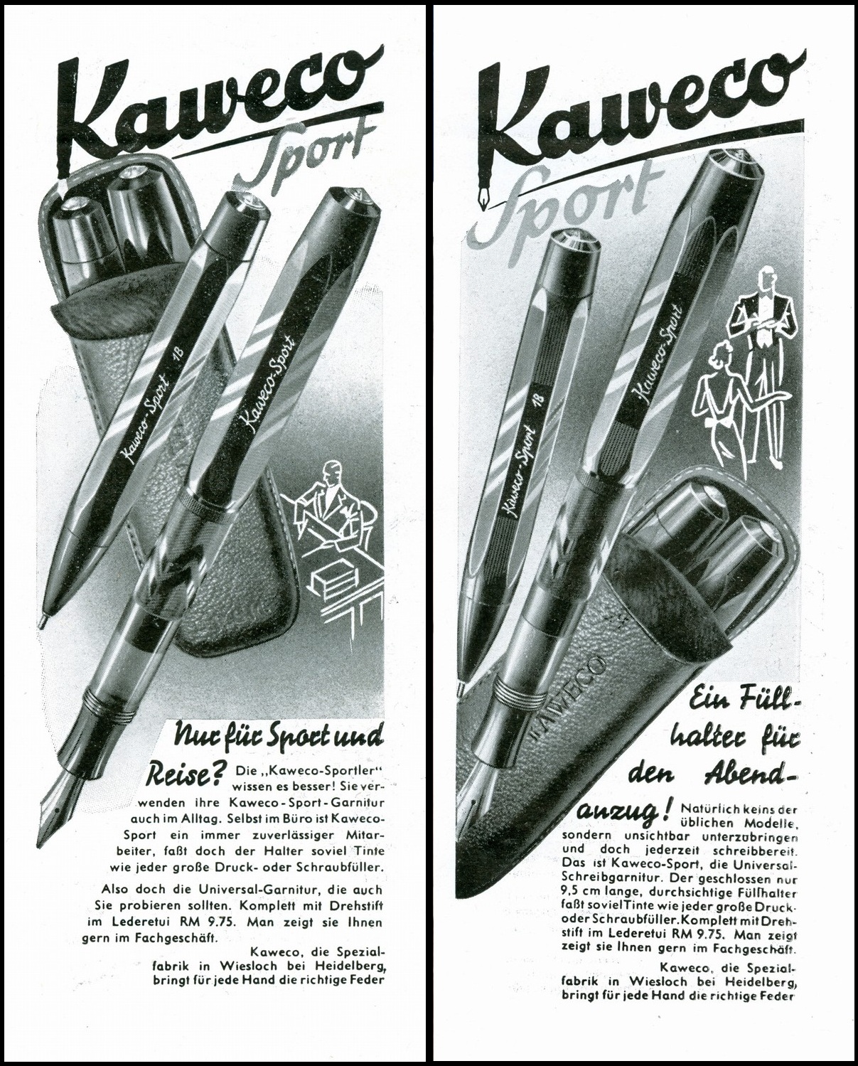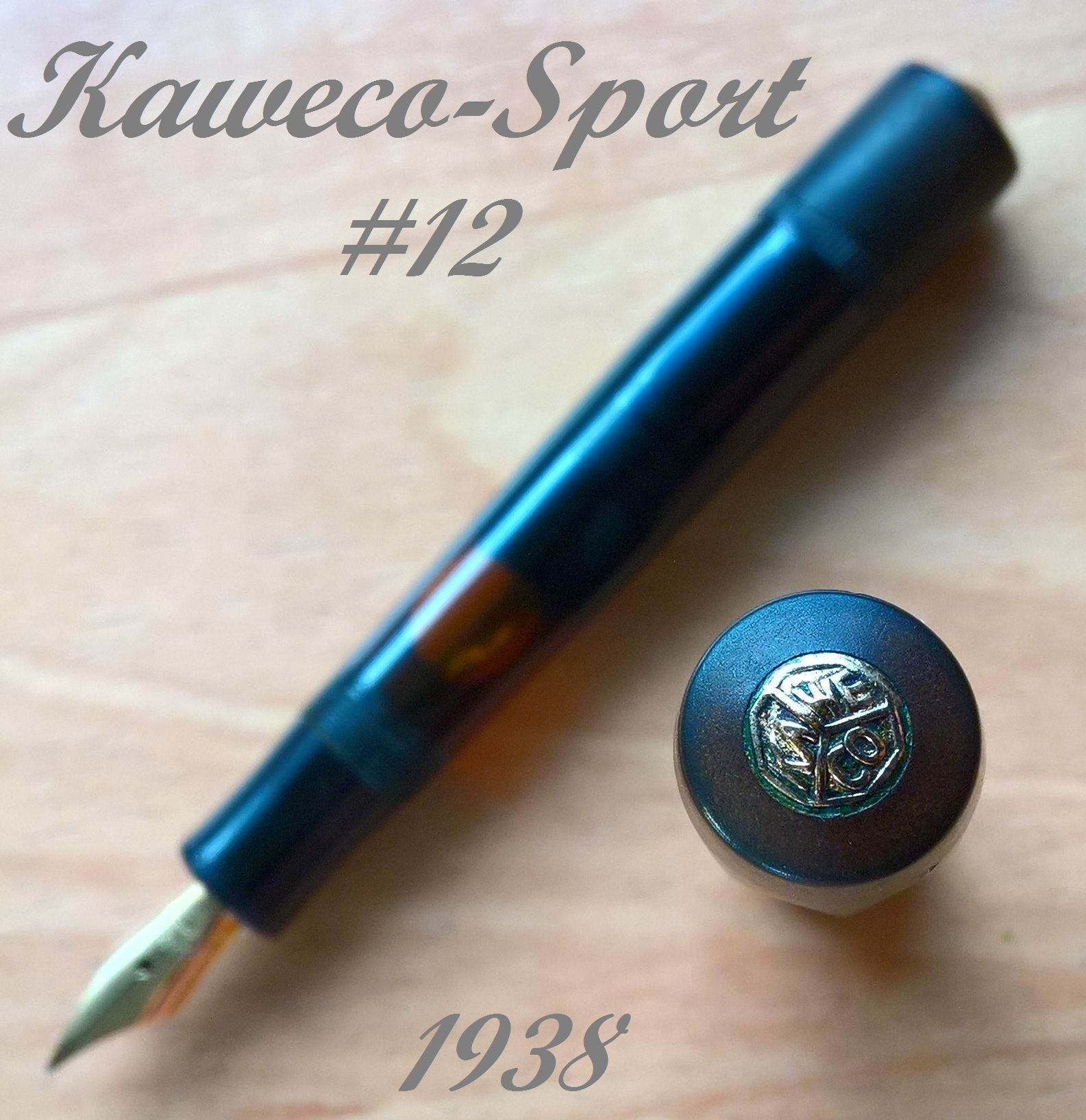In realtà, fu solo nel 1934 che il nome “Kaweco-Sport” venne effettivamente assegnato a (e scritto su) una penna: questa penna era caratterizzata da un cappuccio abnorme, e venne presentata prima (?) con il fusto da rientrante in ebanite e contestualmente o subito dopo (1935?) anche con il fusto in celluloide per il caricamento a pistone.