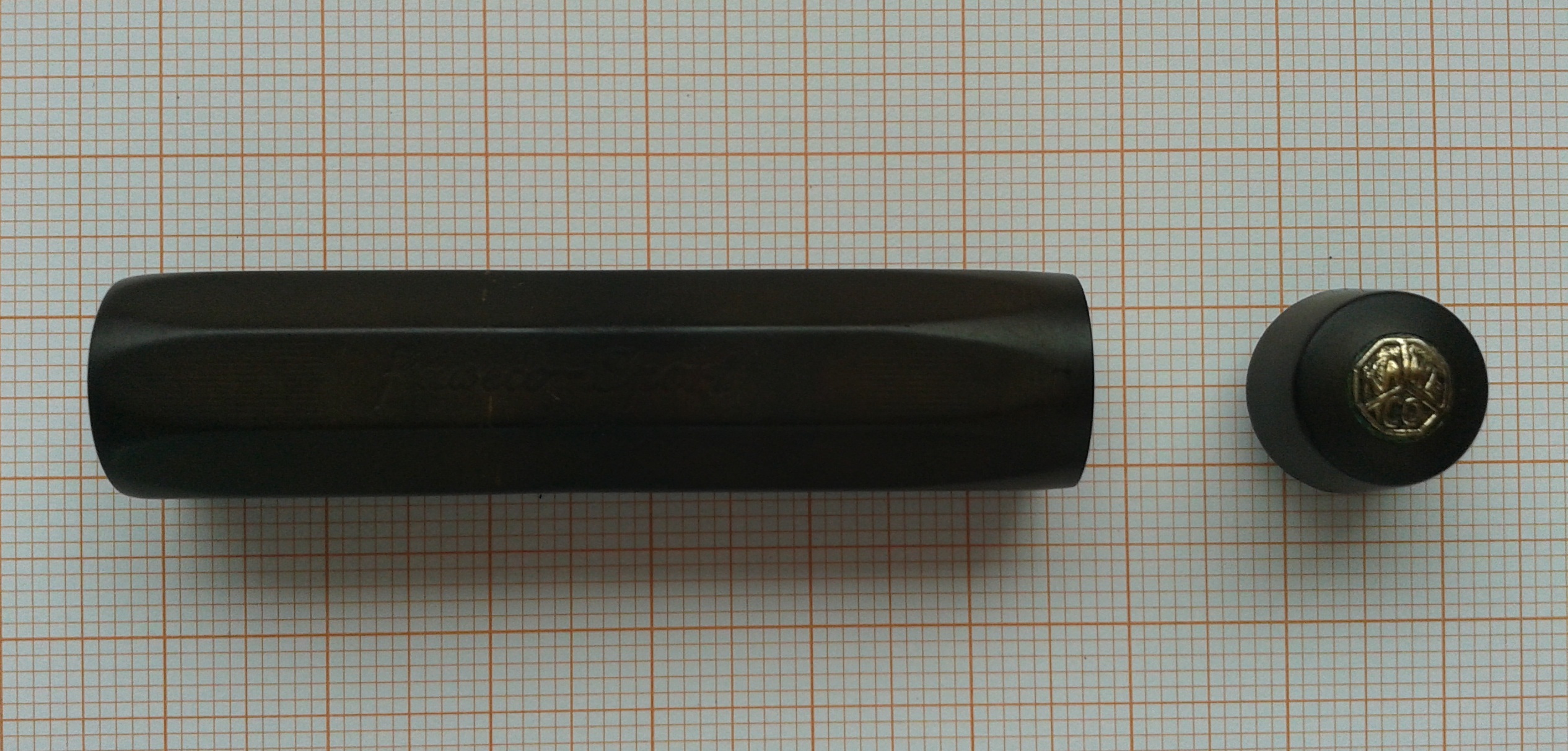 Il cappuccio, interamente in ebanite, è faccettato su base ottagonale e mostra un impianto cilindrico per quasi tutta la sua lunghezza, ripiegando solo impercettibilmente verso il labbro in basso, e rastremandosi di non più di un millimetro dalla linea retta verso l’alto. Le faccette non sono squadrate alle estremità, dove assumono piuttosto una forma lanceolata che muove sapientemente le superfici, creando preziosi chiaroscuri dinamici, più accentuati verso l’alto.