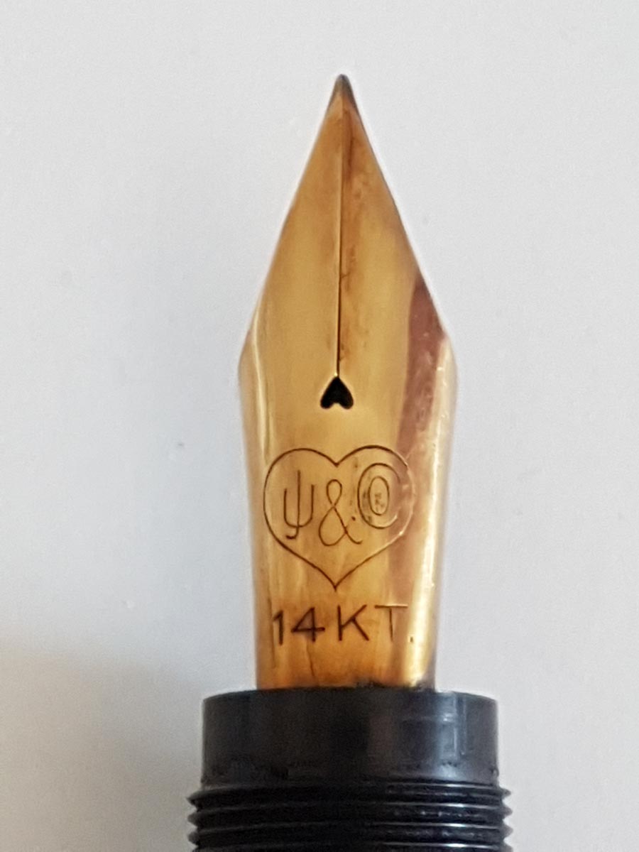 Per quanto riguarda il pennino, quello che sembra un tridente si può forse interpretare come una lettera greca psi, e anziché di una "O" credo si tratti di un "Co." stilizzato. In questo caso la scritta si potrebbe leggere "Psi & Co.", ma non ho trovato nessuna notizia di una ditta con questo nome.