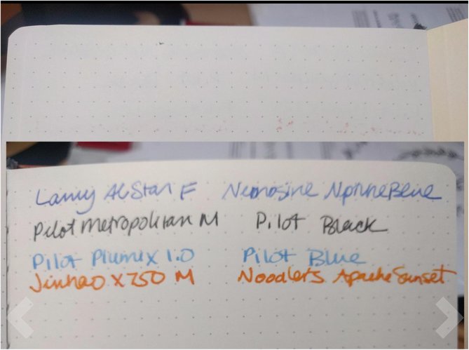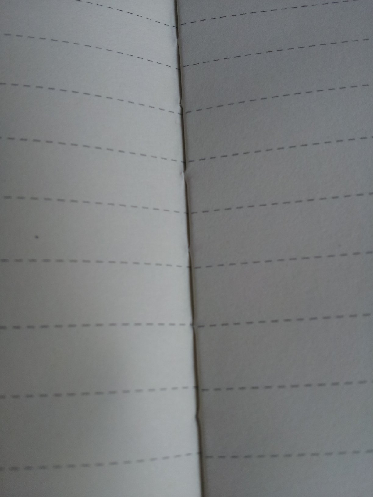 La carta è bianca (non candida), liscia al tatto e le righe non sono continue bensì costituite da una serie di trattini grigio scuro. Si tratta di un dettaglio che personalmente apprezzo molto poiché trovo che interferiscano meno con le discendenti.