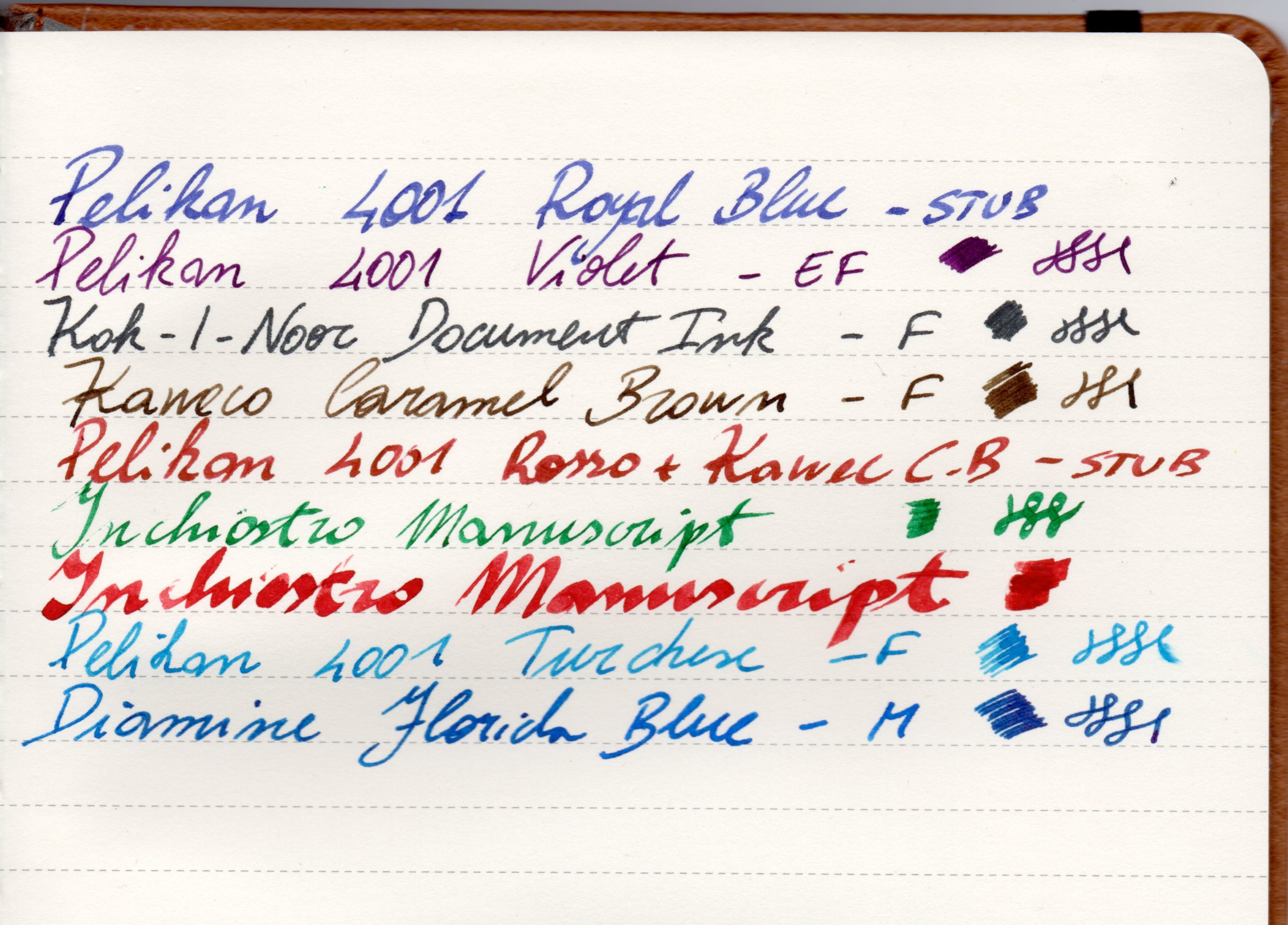 Ma veniamo al nocciolo della recensione: come si comporta la carta con gli inchiostri per stilografiche? Direi molto bene, quantomeno con la ristretta gamma di inchiostri in mio possesso. Solo con il Koh-I-Noor Document Ink (con penna Hero 9296 - F) mostra un leggero spiumaggio. Quasi nessun attraversamento della carta; volendo essere severi, si intravede un leggero accenno col Diamine che però ho usato a intinzione e anche dove ho insistito col pennino calligrafico e dove il pennino Zebra G con Pelikan 4001 Royal Blue (che nella scansione non vedete, ma nella foto successiva si) ha inondato il foglio.