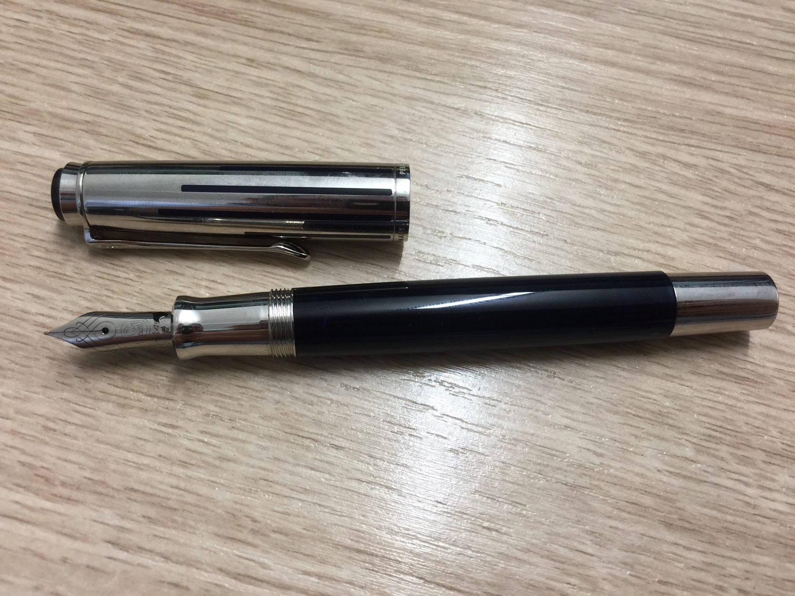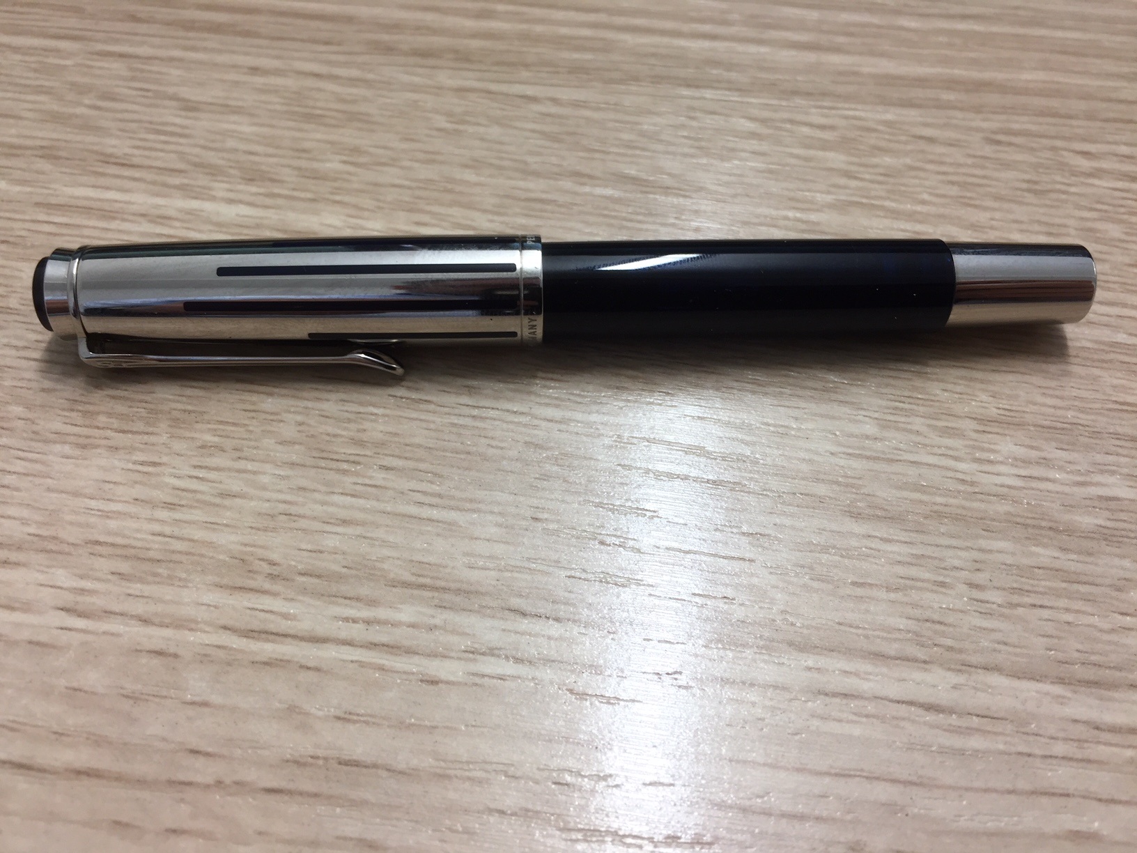 Sono venuto in possesso di questa Pelikan. Dalla misura mi sembra una M600 ha il cappuccio in argento con righe nere e anche il fondello è in argento. Il pennino rodiato è un F 18Kt. Il corpo è un blu molto scuro.