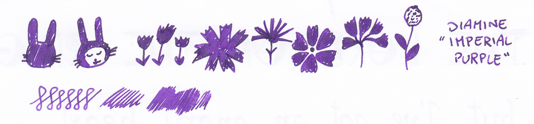Di solito provo gli inchiostri con questi disegnini o con citazioni. Le pubblico sia sull'argomento "E ora mostratevi come scrivete!" sia sull'argomento che ho iniziato intitolato "Lo sviluppo per mio italico." Ho 26 bottigliette di inchiostro al momento, e mi piace cambiare colori spesso e usare 4-5 tipi di carte diverse.