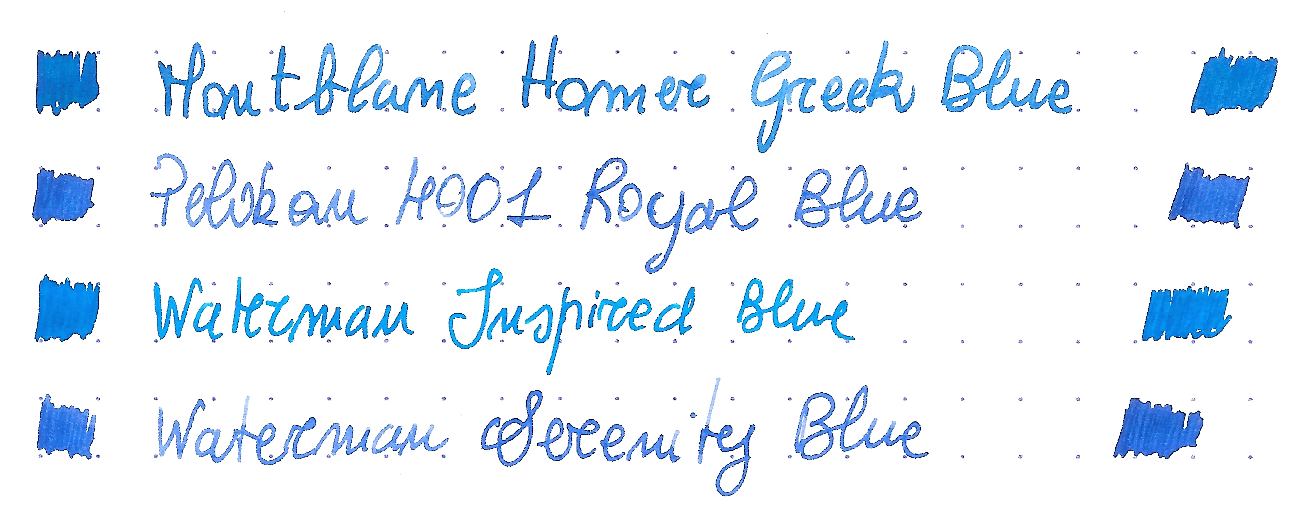 D'istinto l'ho usato con una (splendida) Platinum President con pennino M (à la japonaise...) in oro 18kt con la quale mi sono trovato subito a mio agio e forse complice la qualità della penna sono arrivato ad apprezzare questo inchiostro. Si presenta freddo e più scuro del dovuto appena steso ma asciugando rivela le sue tonalità azzurre chiare e si addice perfettamente a quella penna. Scorrevolezza media/buona, come altri MB é forse più sul lato asciutto direi.