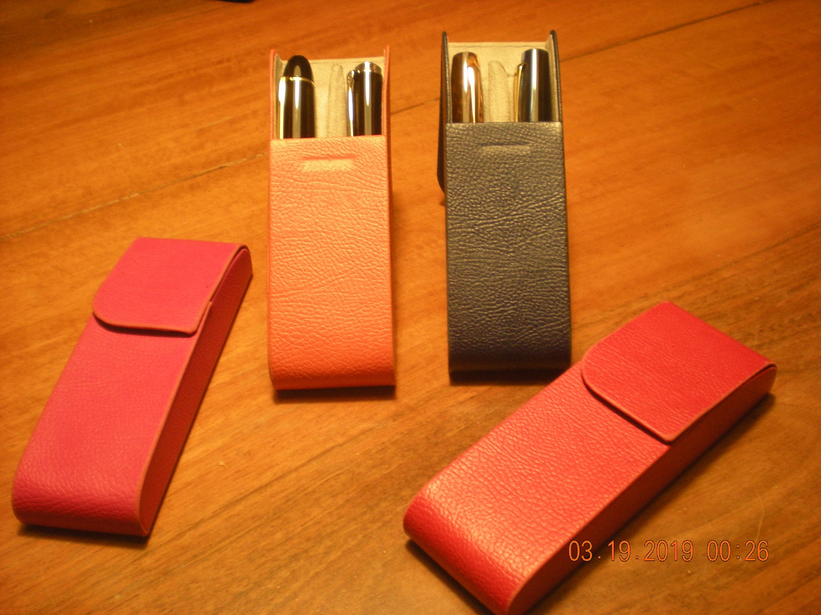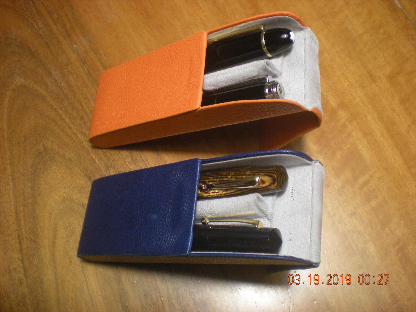 L'altro ha lo spazio per una penna in più e per un fazzoletto di carta. I singoli alloggiamenti sono di dimensioni analoghe al primo e la pelle di capra è grossa e, penso, meno cedevole.