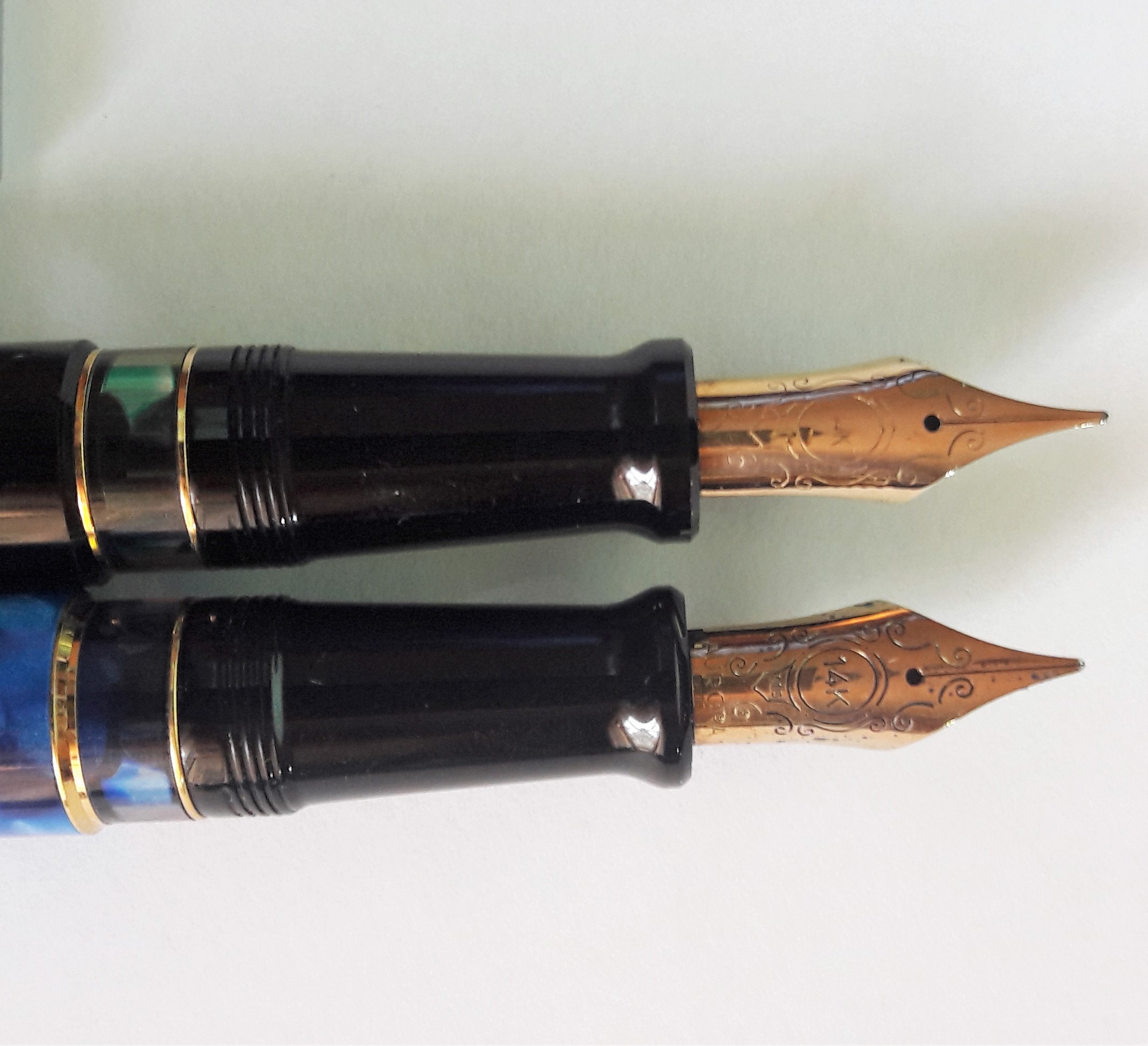 La penna è forse inusata, o comunque tenuta molto bene, ma non ho trovato indicazioni della misura del tratto; "e dopo un anno di forum, ancora non sei in grado riconoscerlo ?" direte voi; in effetti mi risulta difficile, perche lo trovo molto variabile. Usato con la mia mano, forse più adusa alla zappa che alla penna, direi M. Però se la penna viene usata con mano leggera il tratto si assottiglia visibilmente. Perdonate la grafia, già pessima normalmente, ma in questo caso particolarmente brutta a causa del dolore al polso.