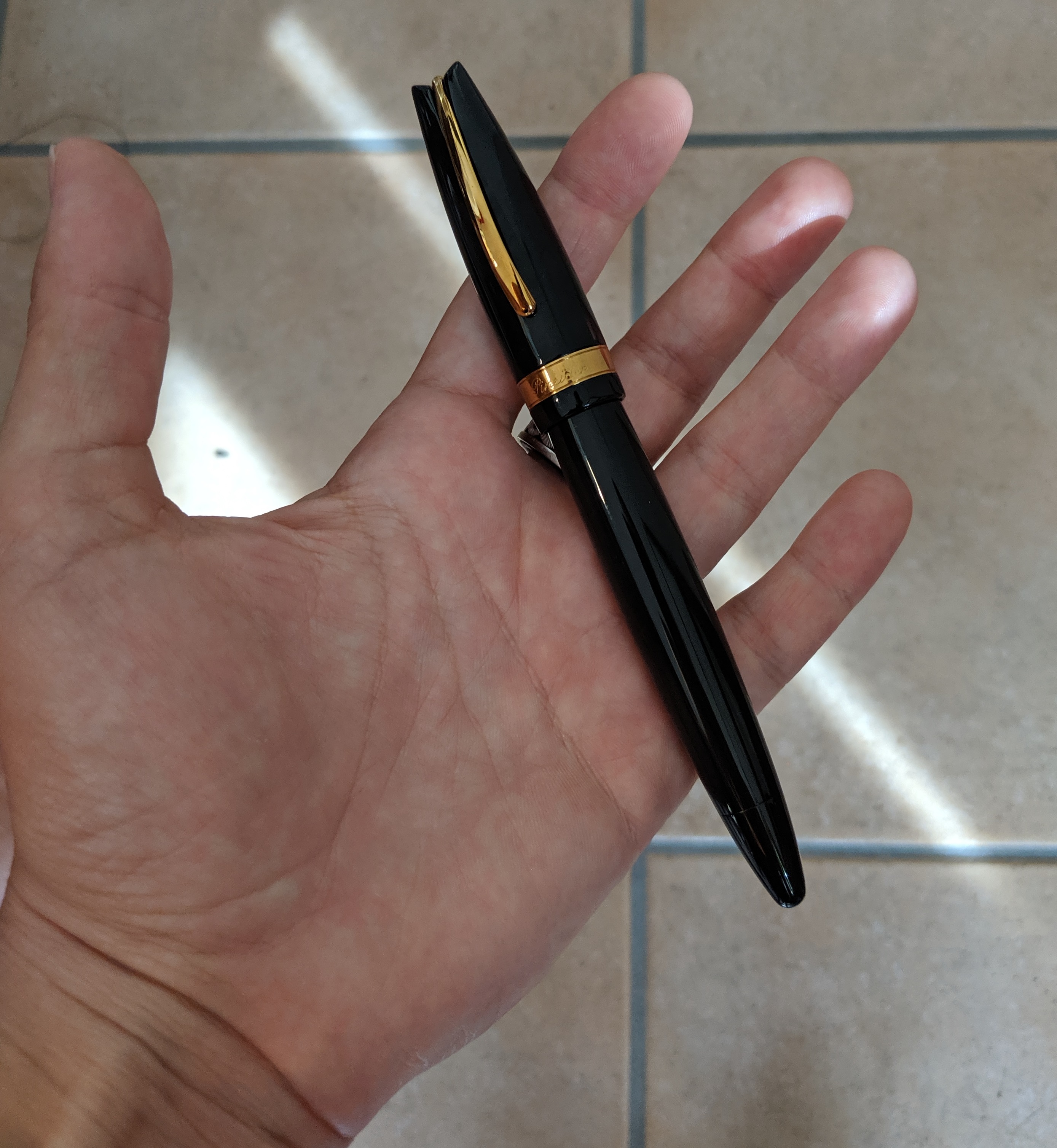 Credo sia una penna piuttosto cicciotta: col cappuccio è circa 15cm, senza poco più di 13.5. La sezione del fusto nel punto più largo è di 1 cm.