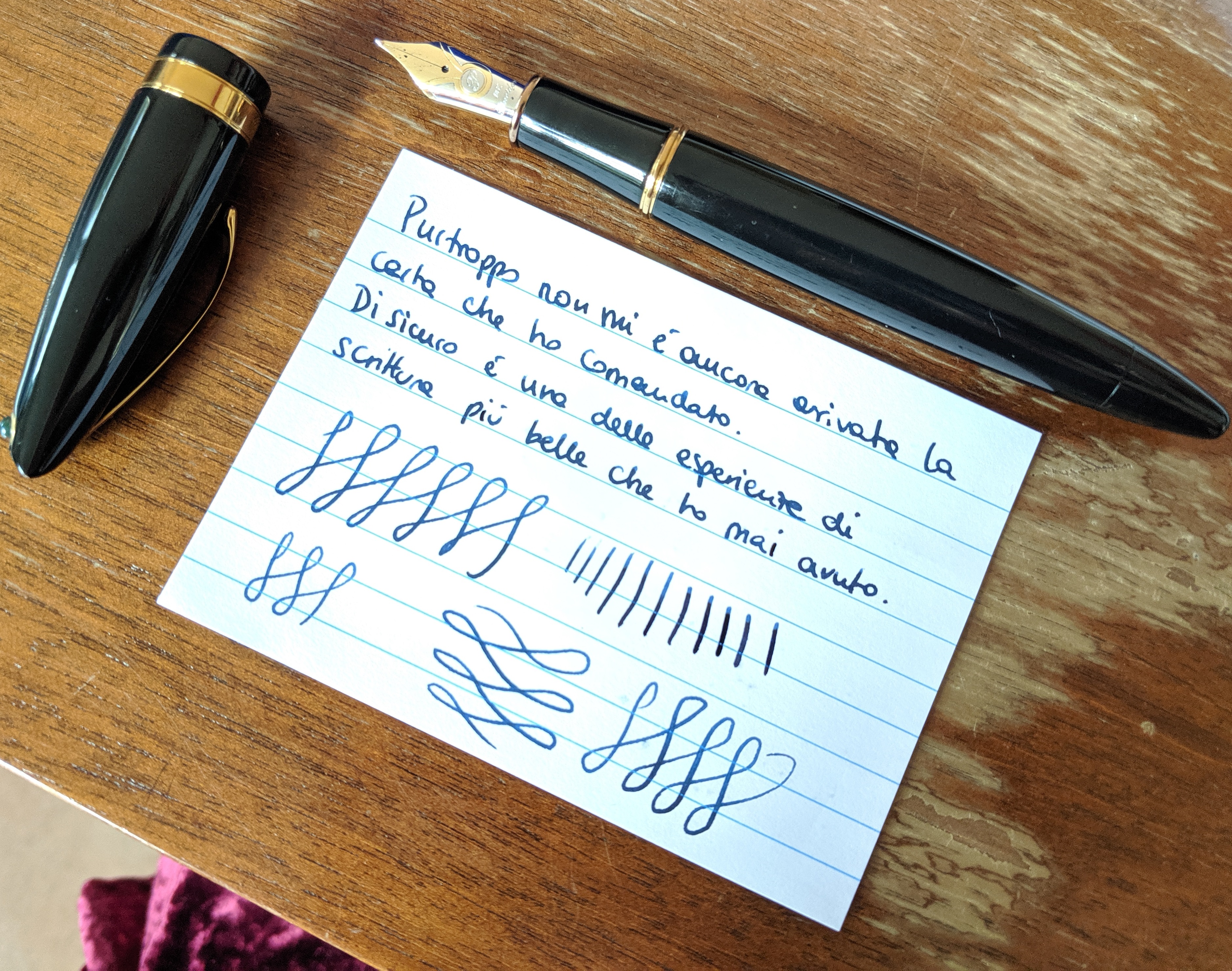 Non ho ancora potuto inchiostrarla, sto aspettando un pacco di inchiostri che apparentemente è bloccato in dogana da una settimana (evviva la Svizzera!).