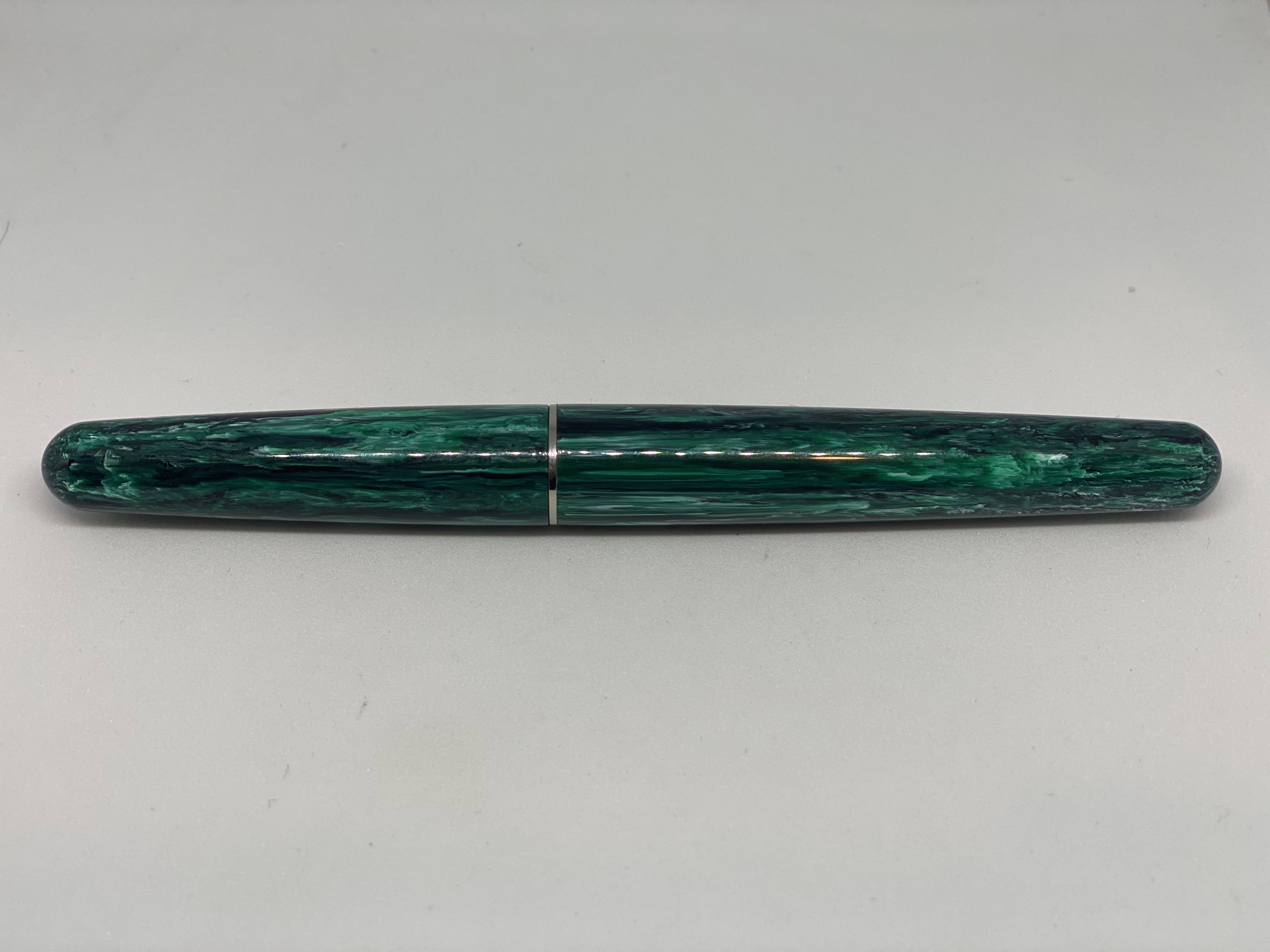 La Elmo 01, è una penna semplice ed efficiente, ed è da questo che si vede il legame con l’Ing. Helm, da cui viene proprio la denominazione Elmo, che si ispirò ai dettami della scuola Bauhaus e del movimento modernista nelle sue realizzazioni. La penna ha delle linee molto pulite, è di taglia media, usa un buon gruppo di scrittura in acciaio JoWo ed implementa un efficace sistema di ricarica a cartuccia/converter. Personalmente era da molto che puntavo ad una Elmo, poi questa edizione limitata con una delle nuove resine note come Montegrappite, mi ha fatto decidere all’acquisto. La versione specifica è la Elmo Chrysocolla, prodotta in soli 300 esemplari per un eShop statunitense. Tra le nuove resine Montegrappite trovo che sia una delle più belle, finora l'avevo vista usata precedentemente solo su una versione speciale della Mia.