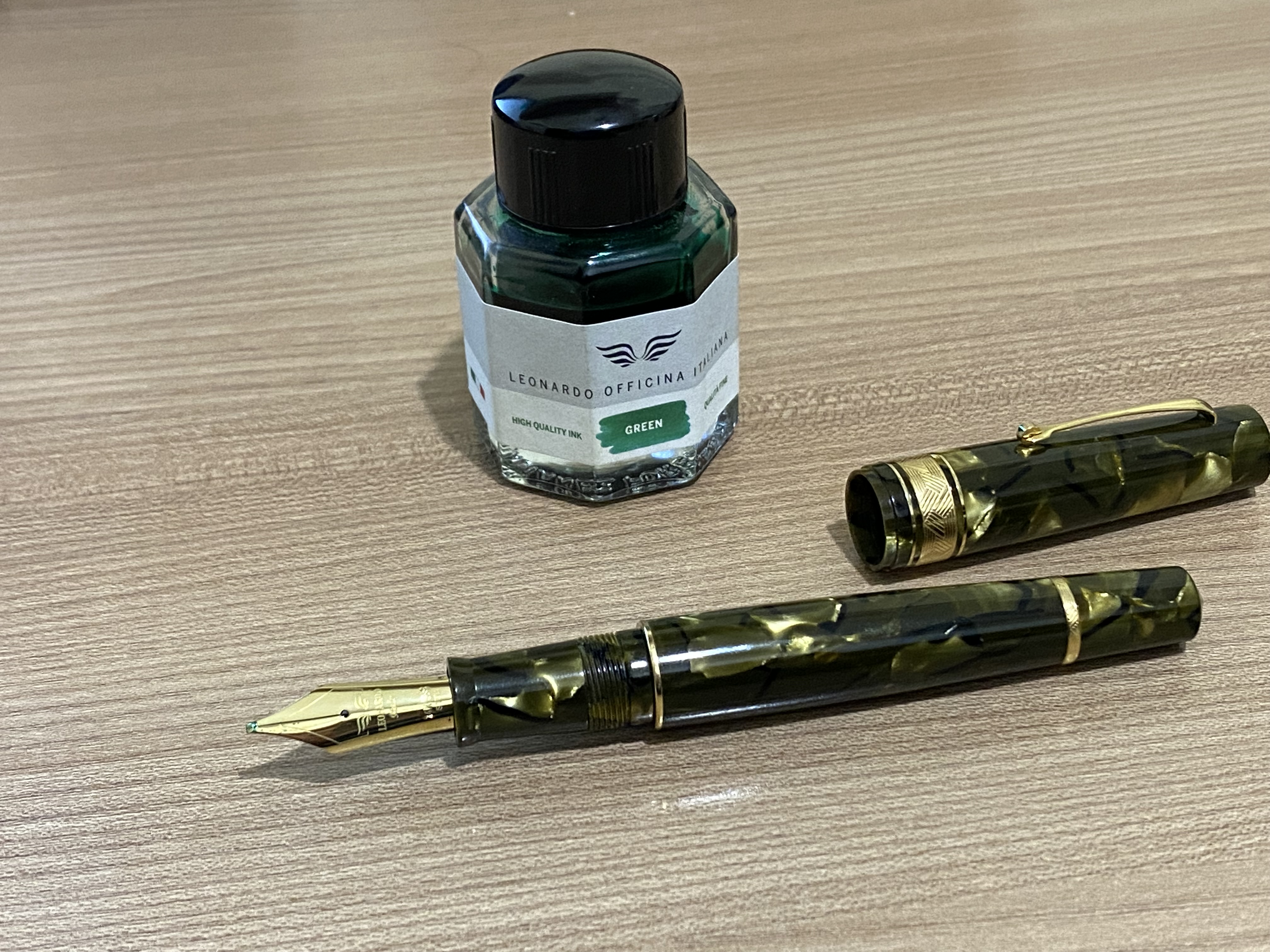 La sezione, a differenza della Momento Zero Grande, è lineare e visto il diametro alla base trovo che si abbini bene al pennino nr.8 installato. In generale però trovo che la forma della sezione della Momento Zero Grande sia più confortevole, cosa che si avverte nelle lunghe sessioni di scrittura. Il gruppo scrittura è composto da un conduttore in ebanite giapponese realizzato in casa accoppiato ad un pennino nr. 8 prodotto da Bock, ma non è il solito e canonico Bock perché questo è uno stub 1.3 rivisto e rifinito da Salvatore, un pennino che offre un suo carattere con una tratto più da Cursive Italic che da Stub. Appena tirata fuori dalla carta ha iniziato a scorrere sulla carta molto piacevolmente, un pennino morbido e setoso con un flusso a dir poco generoso che offre una variazione di tratto più accentuata di uno stub ma senza le difficoltà d’uso di un vero italico. E' una penna che scrive sempre, senza mai fermarsi, con un tratto costante e senza smagrimenti del flusso, la sola cosa di cui necessita è l'inchiostro, quello in foto è il Waterman Harmonious Green. La critica che continuo a muovere a Leonardo è che usa pennini che non sono fatti in casa, fanno praticamente tutto anche le minuterie metalliche, credo che oramai è ora di dare un carattere distintivo alle sue penne anche nelle peformance di scrittura. Dimenticavo, l’altro difetto di questa penna è il prezzo… ma a caval donato non si guarda in bocca