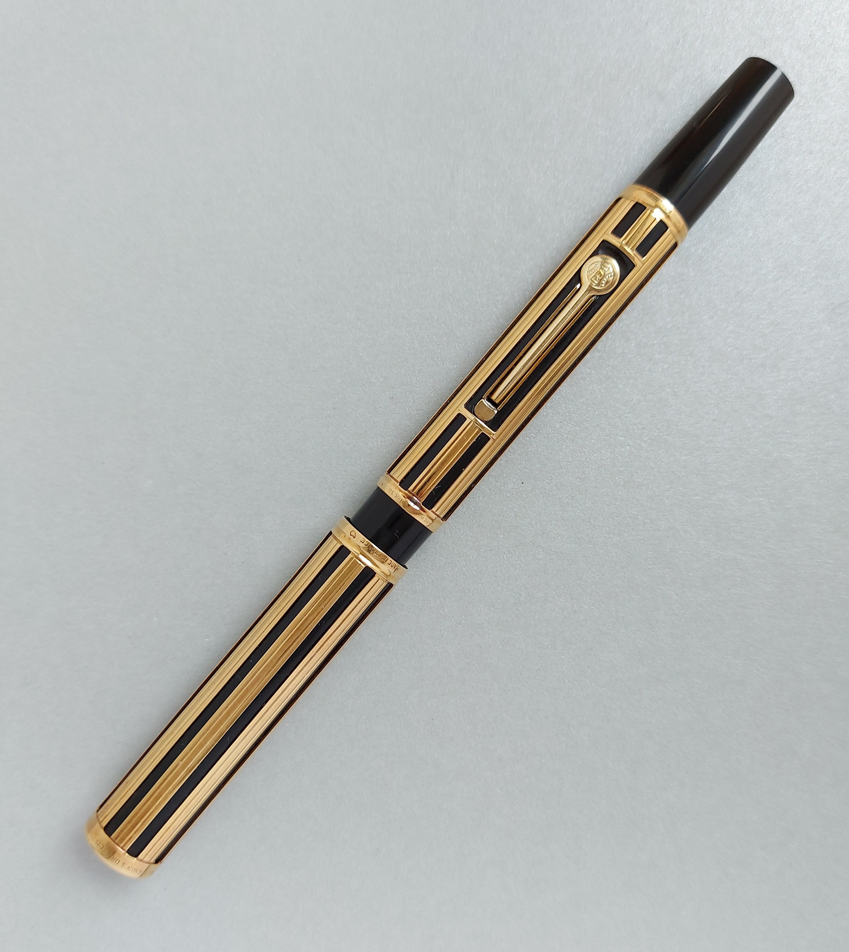 Lontana anni luce da certa produzione dozzinale italiana di rivestite di perenne gusto floreale, questa Night & Day è una penna dalla bellezza autenticamente “classica”, tanto da risultare sempre di una contemporaneità assoluta: lo era col tardo Liberty, per le sue forme armoniose e slanciate; lo era con l’avvento del Déco, per la rigorosa geometria del disegno, il rigore dell’impianto e la solidità costruttiva che le consentivano di riprodurre su carta pensieri altrimenti indomabili (come dimostra splendidamente l’opera di Jean D’Ylen); lo è oggi per l’assoluta eleganza, la ricercata asessuata purezza, diremmo l’ascetismo di forme e materiali: non si tratta però di una semplicistica, e dunque sterile, simmetria forzata di tutte le sue componenti, ma di una interpretazione affatto dinamica, con volumi che paiono cangiare in rotanti contrappunti con le parti in ebanite nerissima a vista: proporzione aurea a penna chiusa, sì, ma con la penna in assetto di scrittura incalzante susseguirsi di ritmi vivaci e inconsueti, in un teatrale simbolismo di Luce e Tenebre