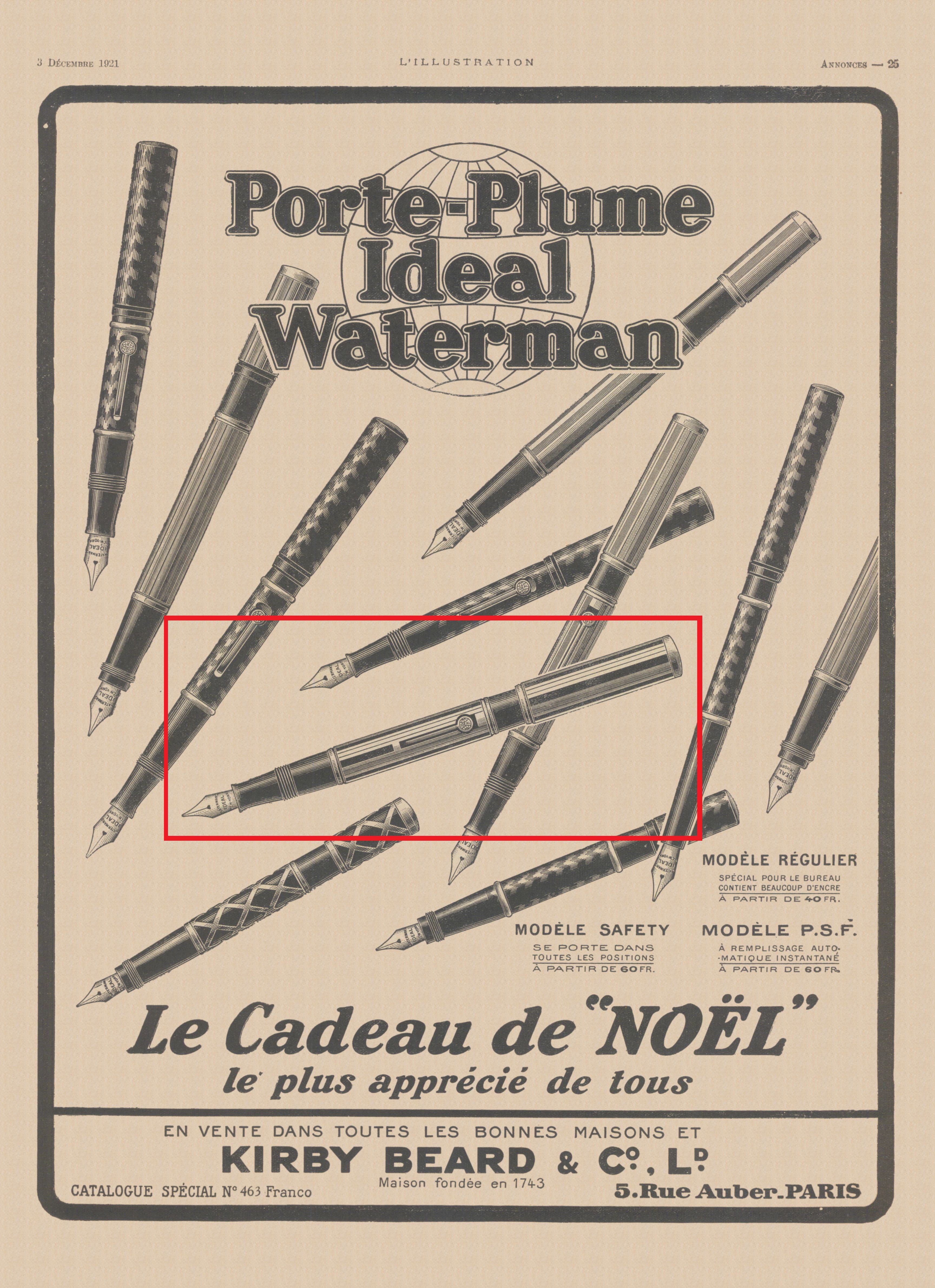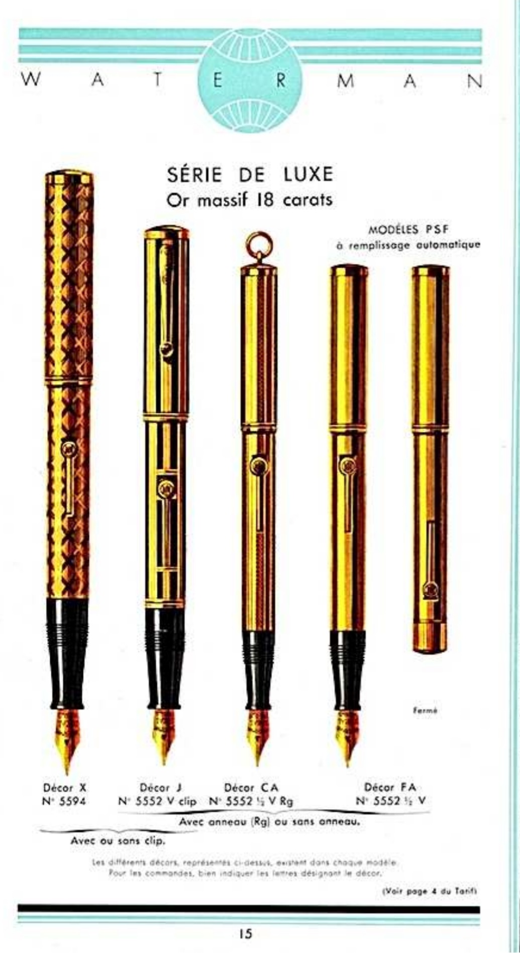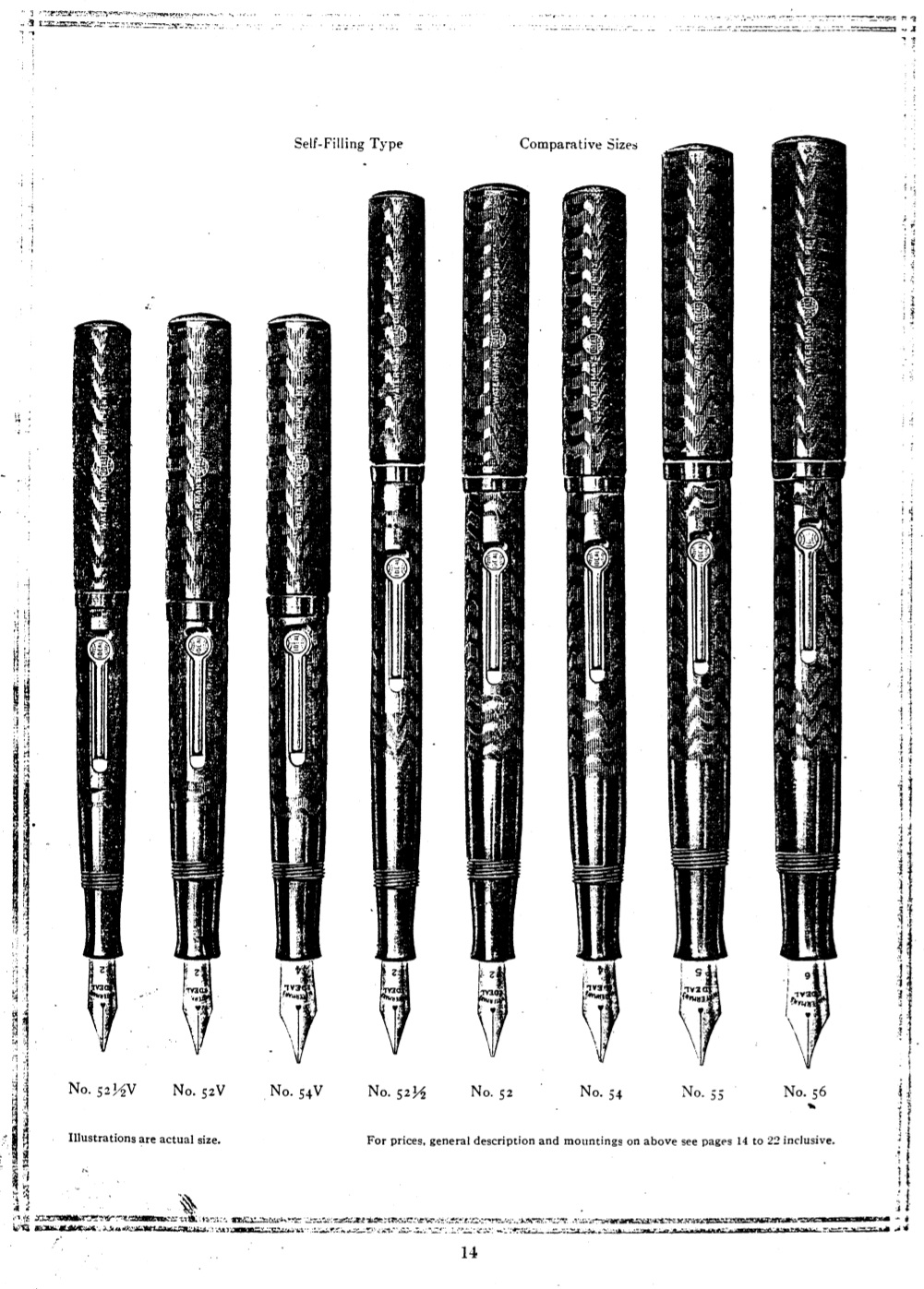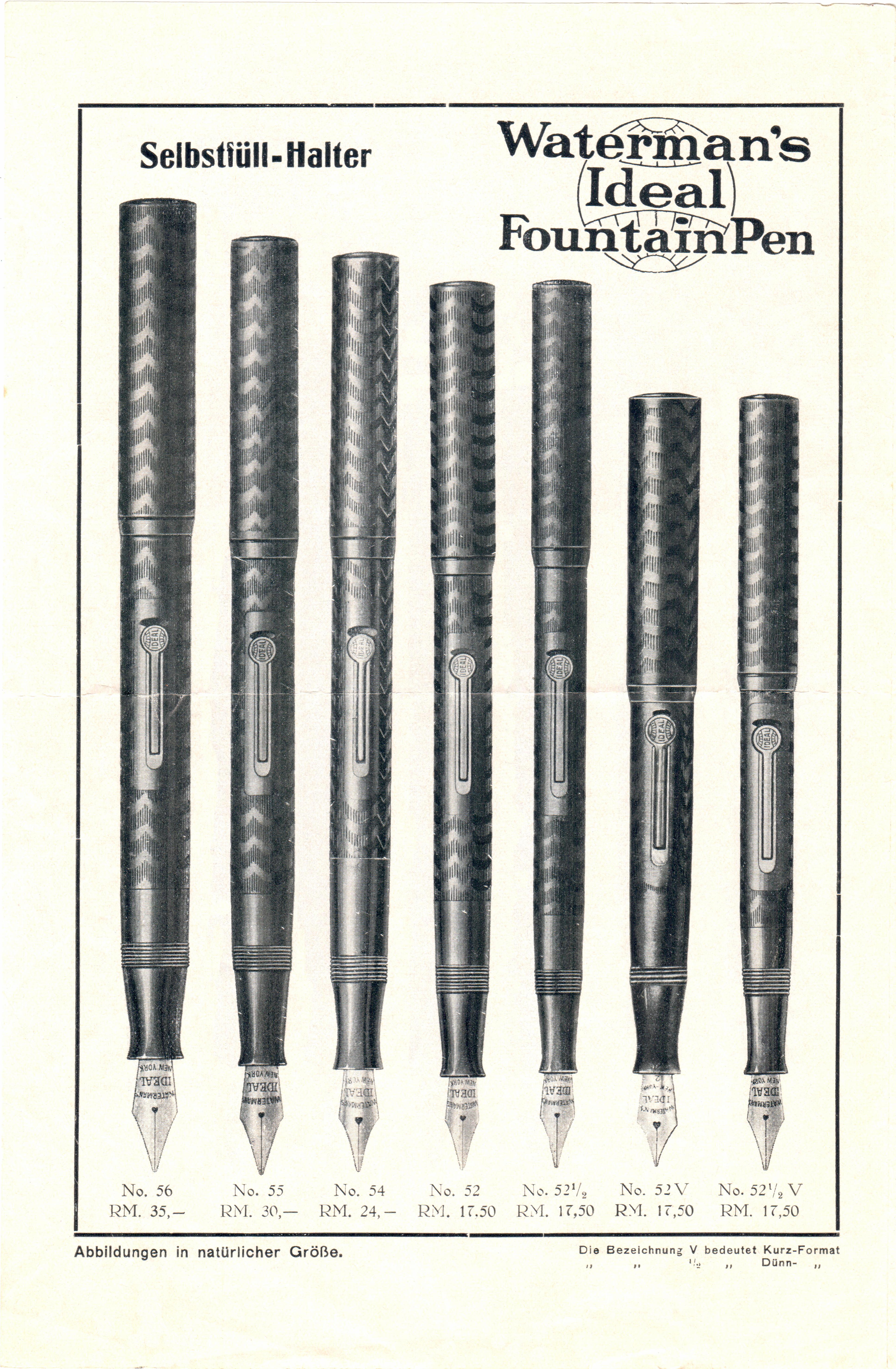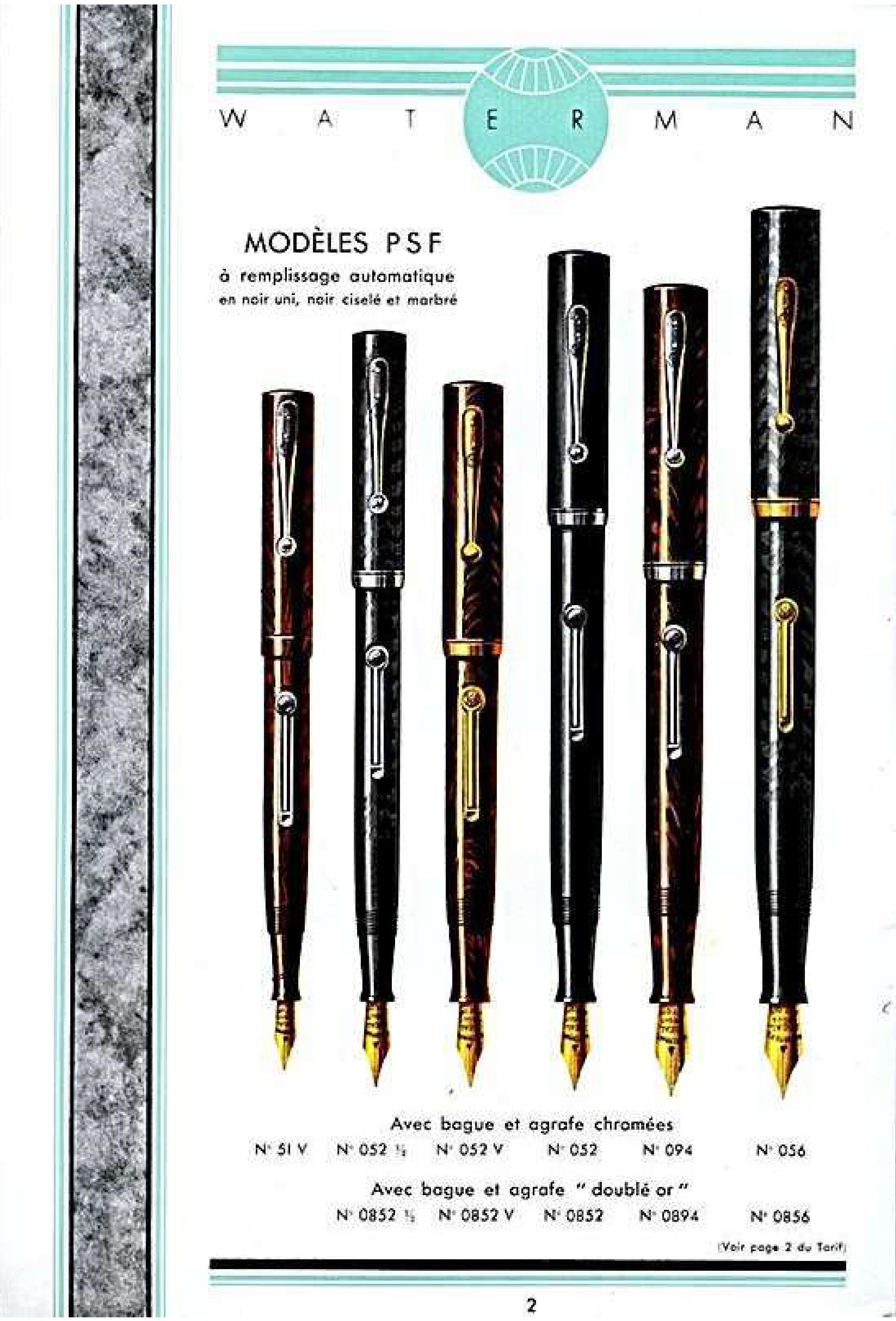 In questa sede gioverà ricordare che il caricamento a levetta fu introdotto da Waterman solo nel 1915 e che il modello standard/senior che lo montava fu dapprima denominato 12 P.S.F. (pocket self filler), per divenire dopo il 1917 con la nuova numerazione Waterman #52, i cui numeri indicavano il sistema di caricamento a levetta dotato di pennino #2. Il rivestimento della Casa in oro massiccio era connotato da un #5 nella posizione delle centinaia, quello in argento dal #4.