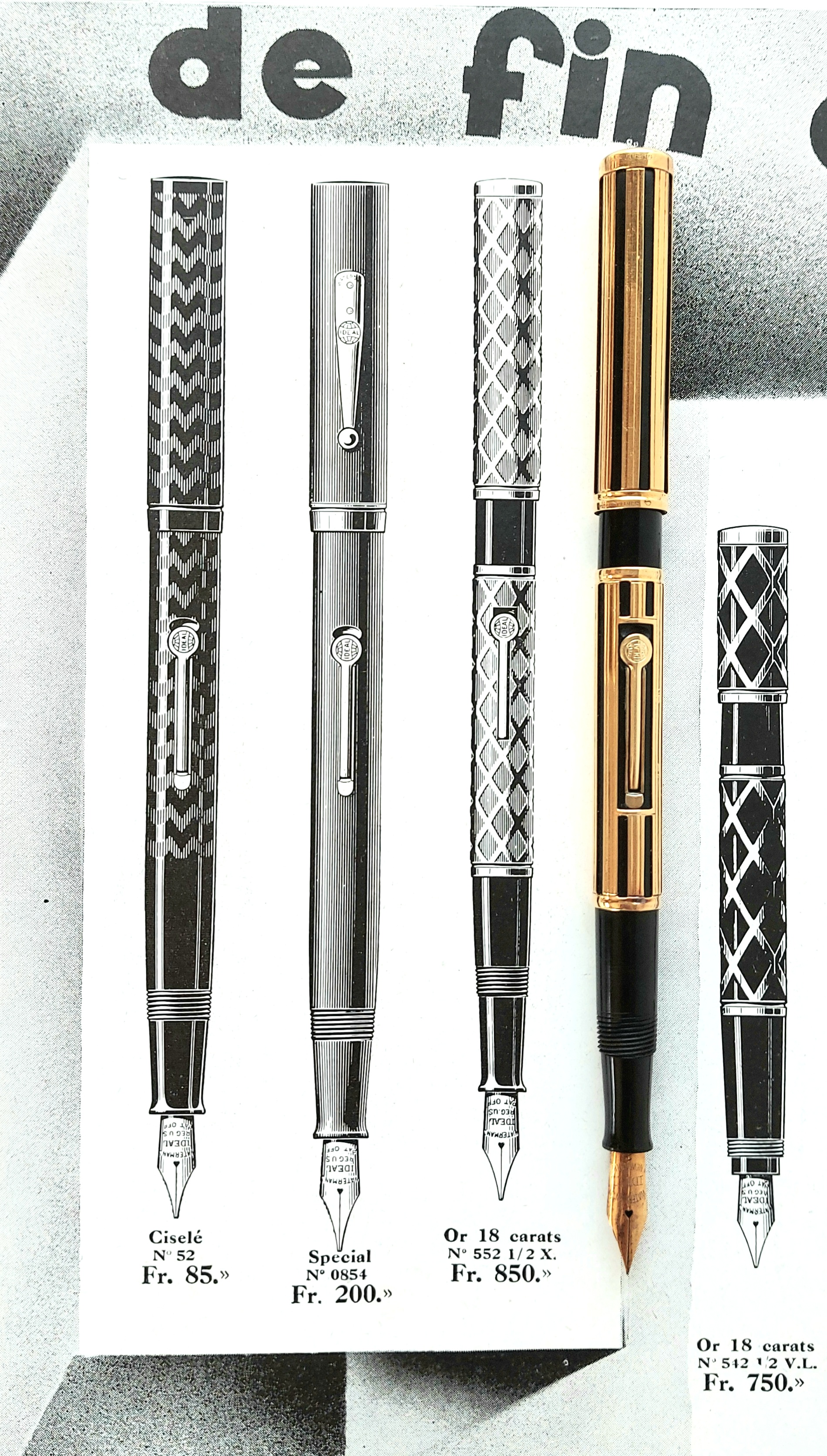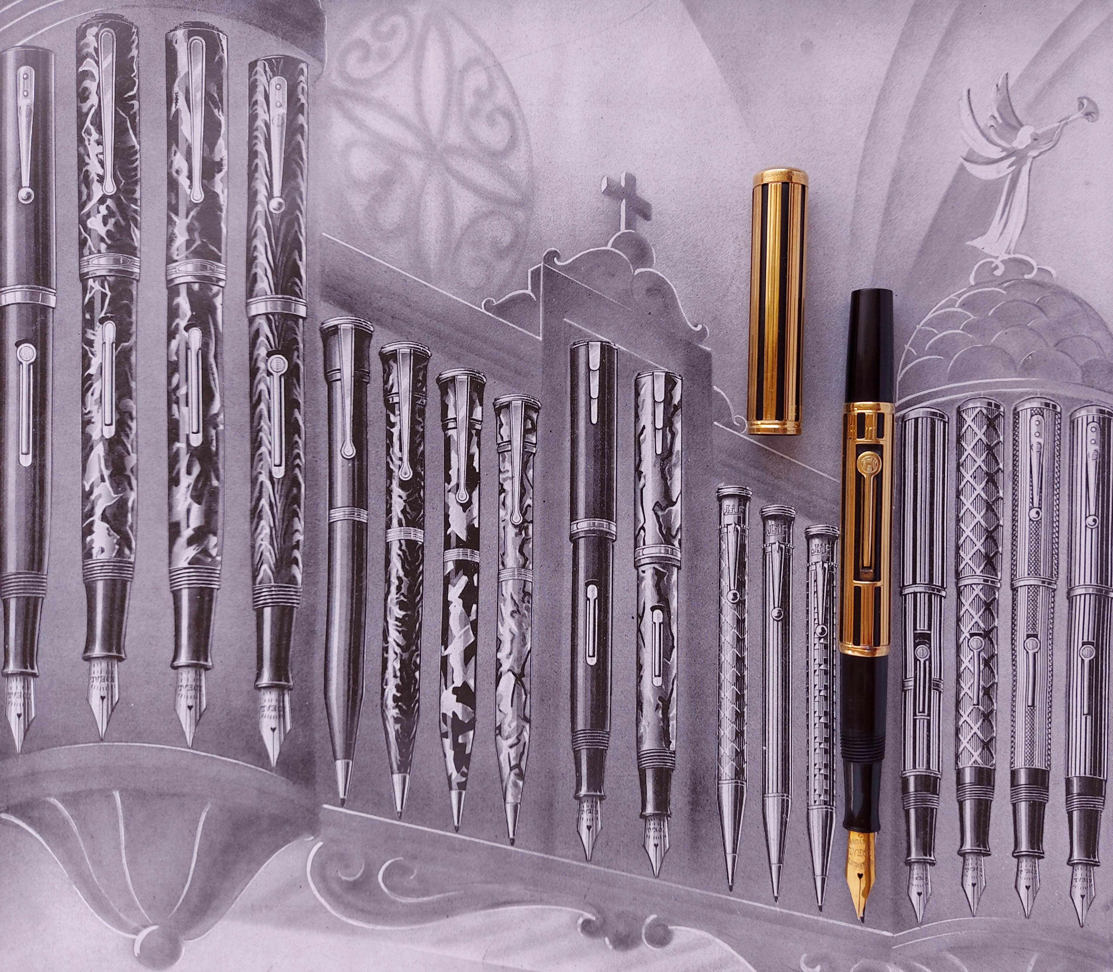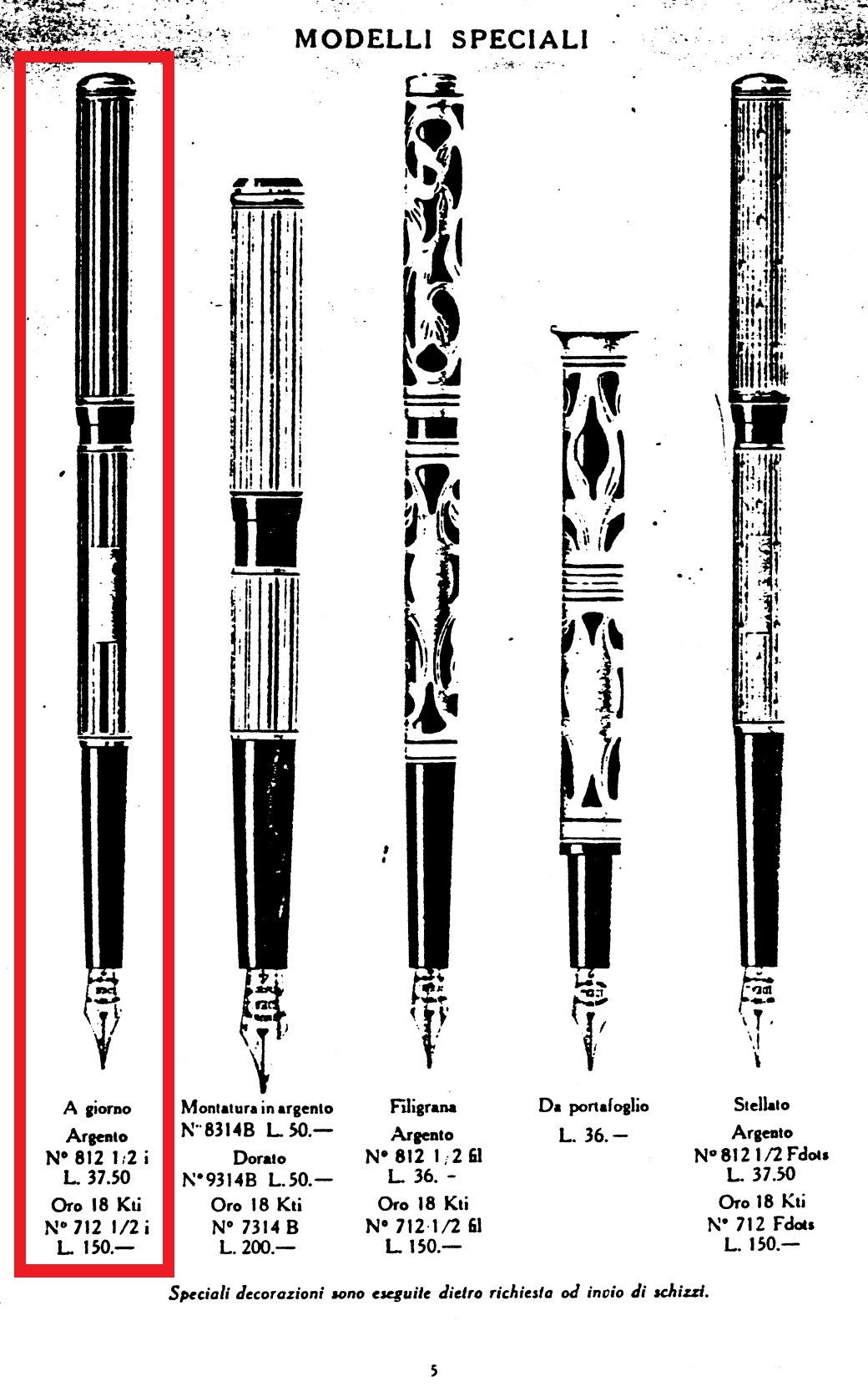 Di questa penna, straordinaria per ergonomia e per l’eccellenza tecnica assoluta dei pennini, in oltre un ventennio di onoratissimo servizio (1915-1938 ca.) cambiarono i materiali, le decorazioni, ma anche le dimensioni e alla fine persino le forme.