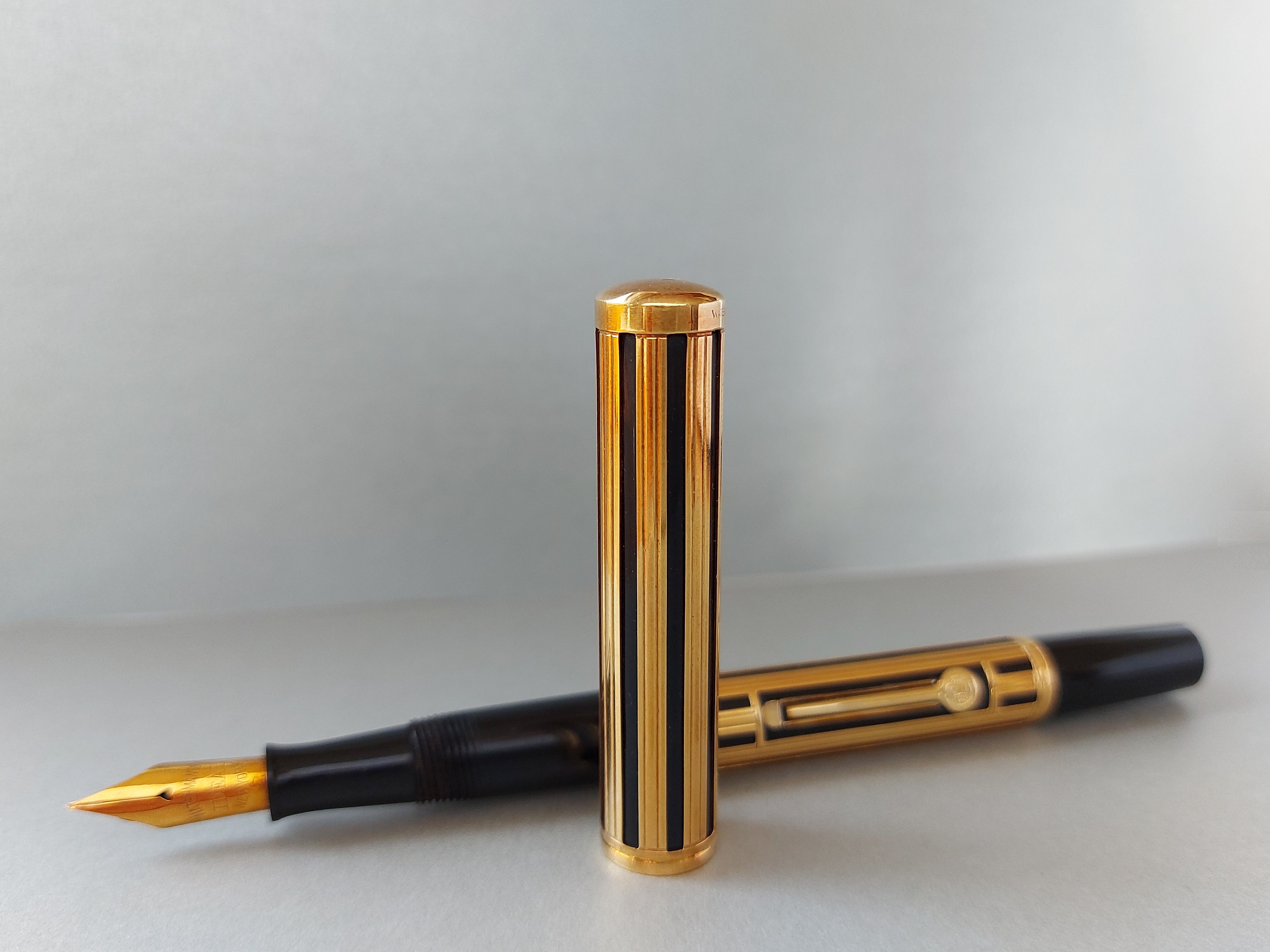 WATERMAN [552½] in ebanite nera liscia (BHR), rivestimento in oro massiccio 18 carati con decoro “J” (ajouré = a giorno = night and day), cappuccio a vite senza clip, corretto pennino Waterman Ideal #2 in oro 18 carati, caricamento a levetta, produzione U.S.A./Francia, anno 1924.
