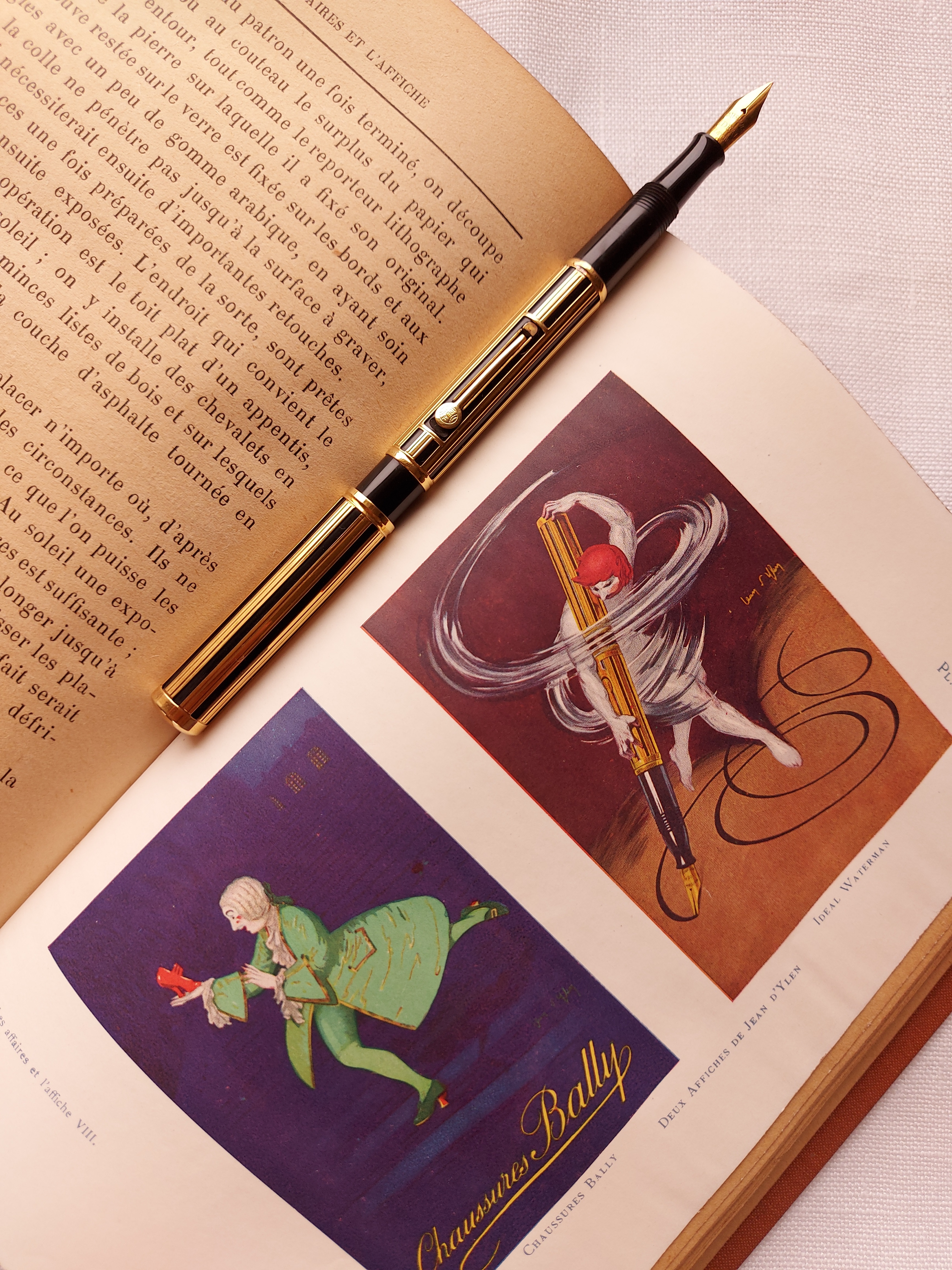 Questa immagine, invero misteriosa, ai miei occhi aveva da subito incarnato tutto il sublime piacere della scrittura con la stilografica (una Waterman golden age, ça va sans dire!): in essa si trovano rappresentate la danza e la musica (suonata come su un violoncello “ideale” e percepita dall’orecchio interiore) e la nuda essenzialità del pensiero, trascritta da uno strumento aggiornato ai canoni del Déco internazionale e dotato di un pennino acuminato che volteggia, flette e gorgheggia, scrive e disegna, e non si fermerà… «È questo il mio “Ideal”», avevo dichiarato entusiasta.